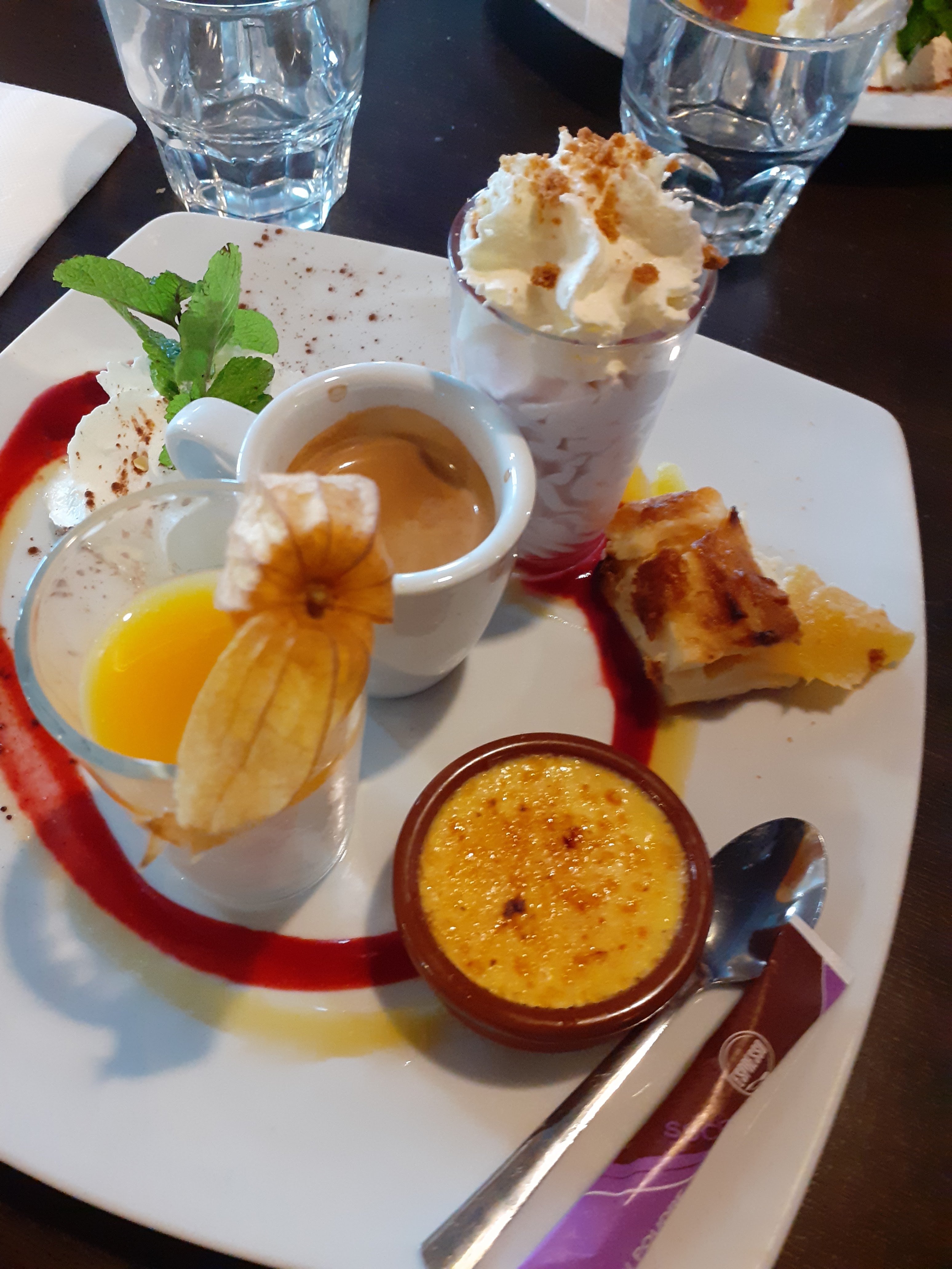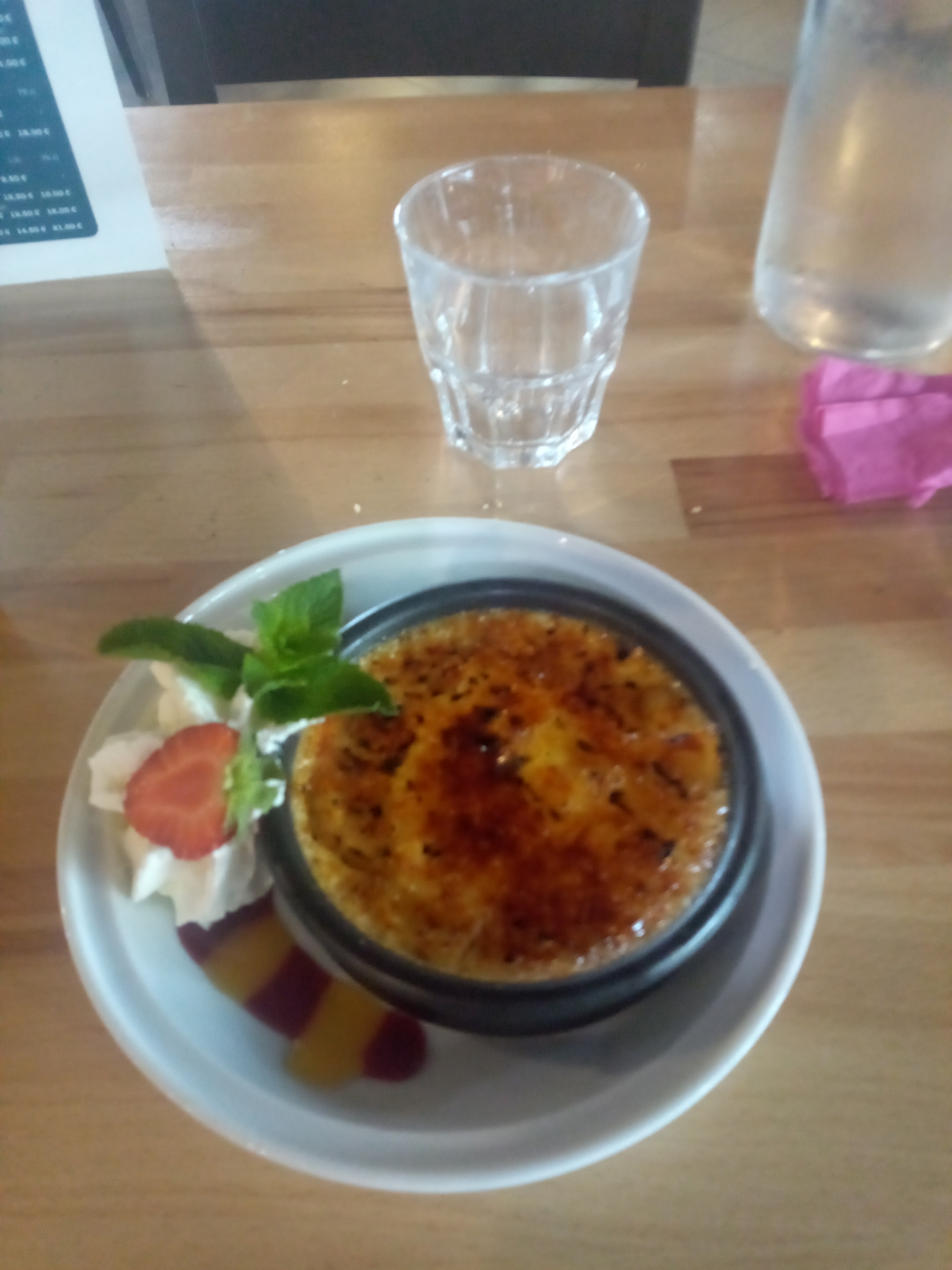 2 caramel liégeois de commandés, servis dans 2 modèles de coupes différentes, une plus petite que l autre, niveau visuel pas top, pas un verre d eau de proposer avec, c est le minimum, ensuite on a commandé 2 diabolos servis sans glaçons chaud à boire, rester dans les verres. Pas terrible