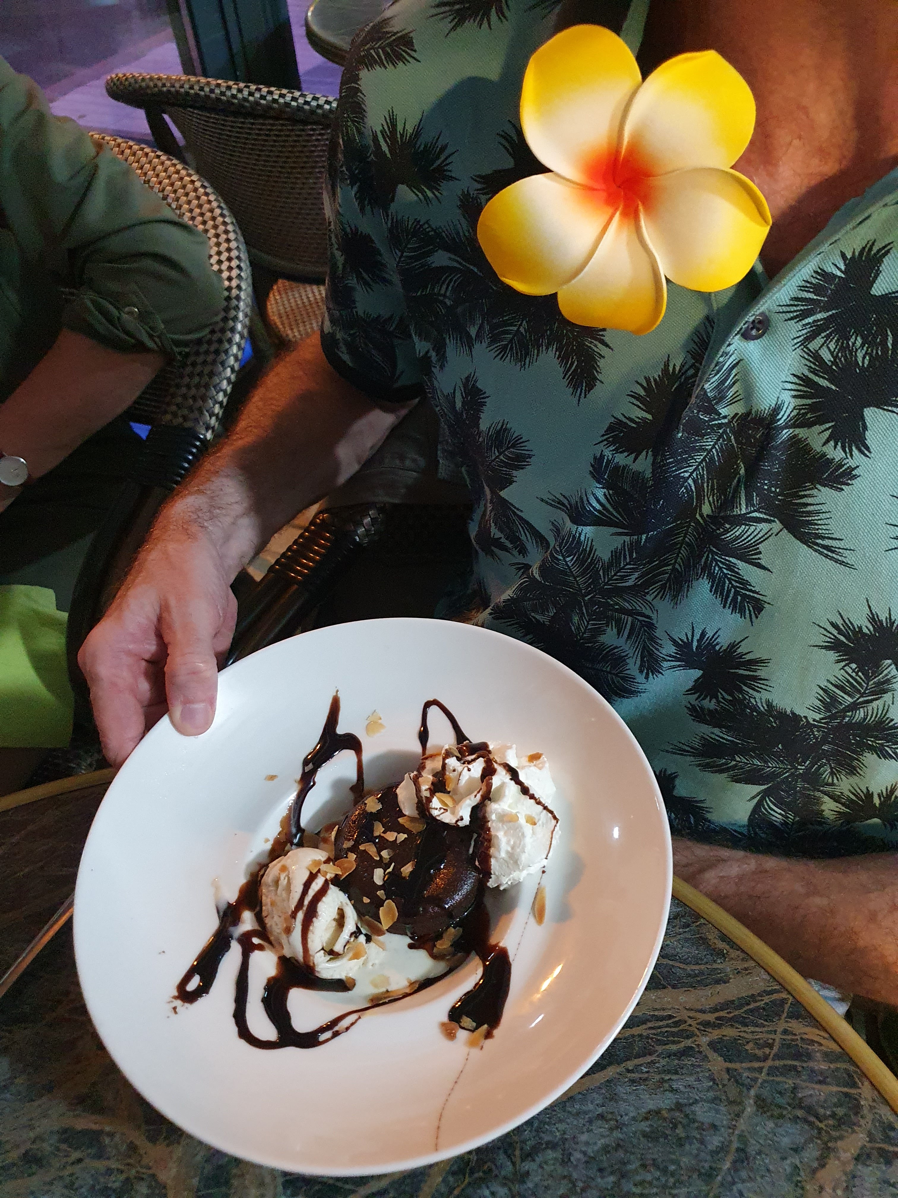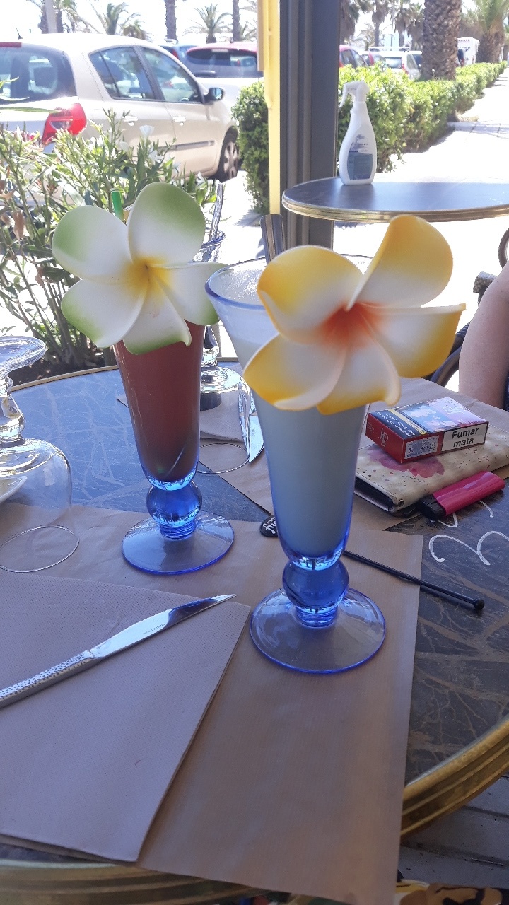 Bienvenu(e)s chez les attrapes-touristes! Alors deux mojito fruits rouges sans le goût biensûr, de plus quand l’on signale qu’un des deux ne goûte que le rhum et l’ont nous dit que c’est normal car c’est un mojito ( Je cherche toujours le fruit rouge, la menthe et la fraicheur). Le tout décoré d’une brochette de bonbon à s’en casser les dents, elle a dû passer l’année dans sa boite la pauvre Quand aux bananas splits, ils essayent tant bien que mal de rattraper le cocktail mais malheureusement les bananes sont vraiment au bord de l’apocalypse parmis une boule de glace fraise sans saveur et une vanille sûrement pas cher!