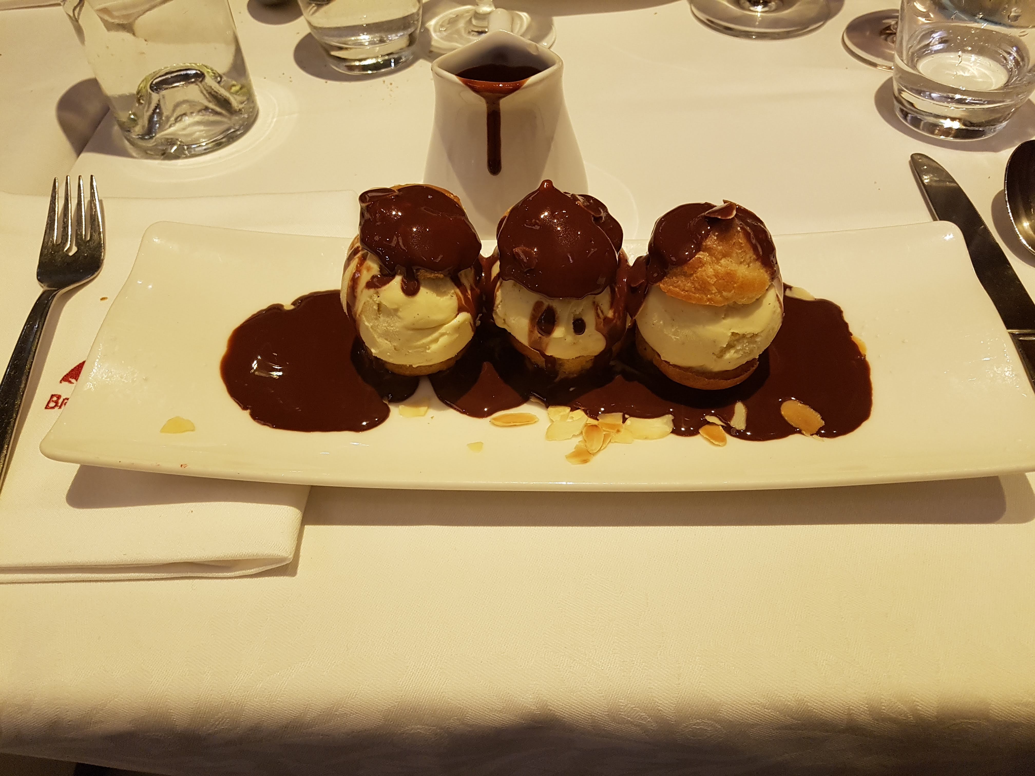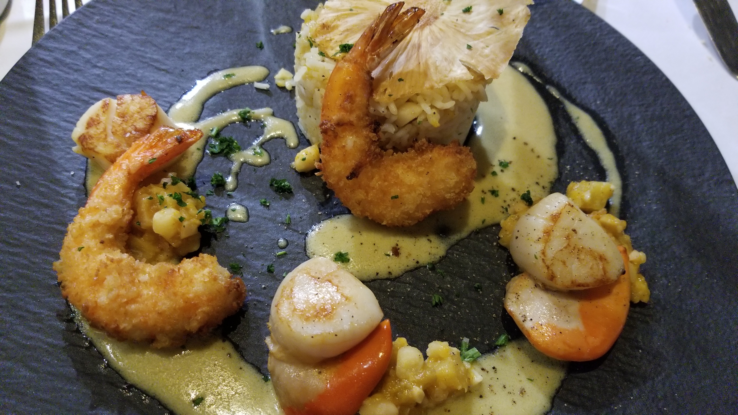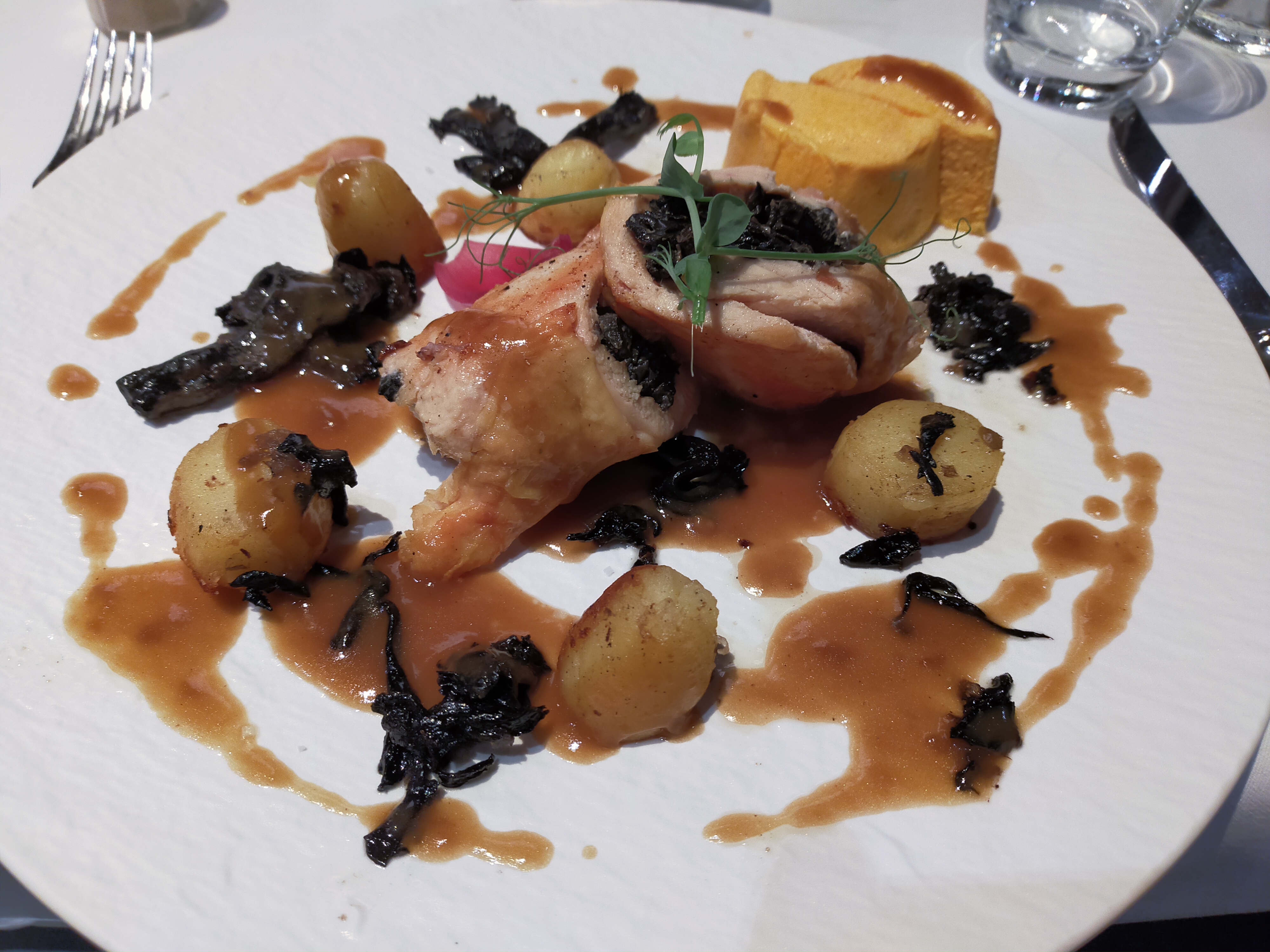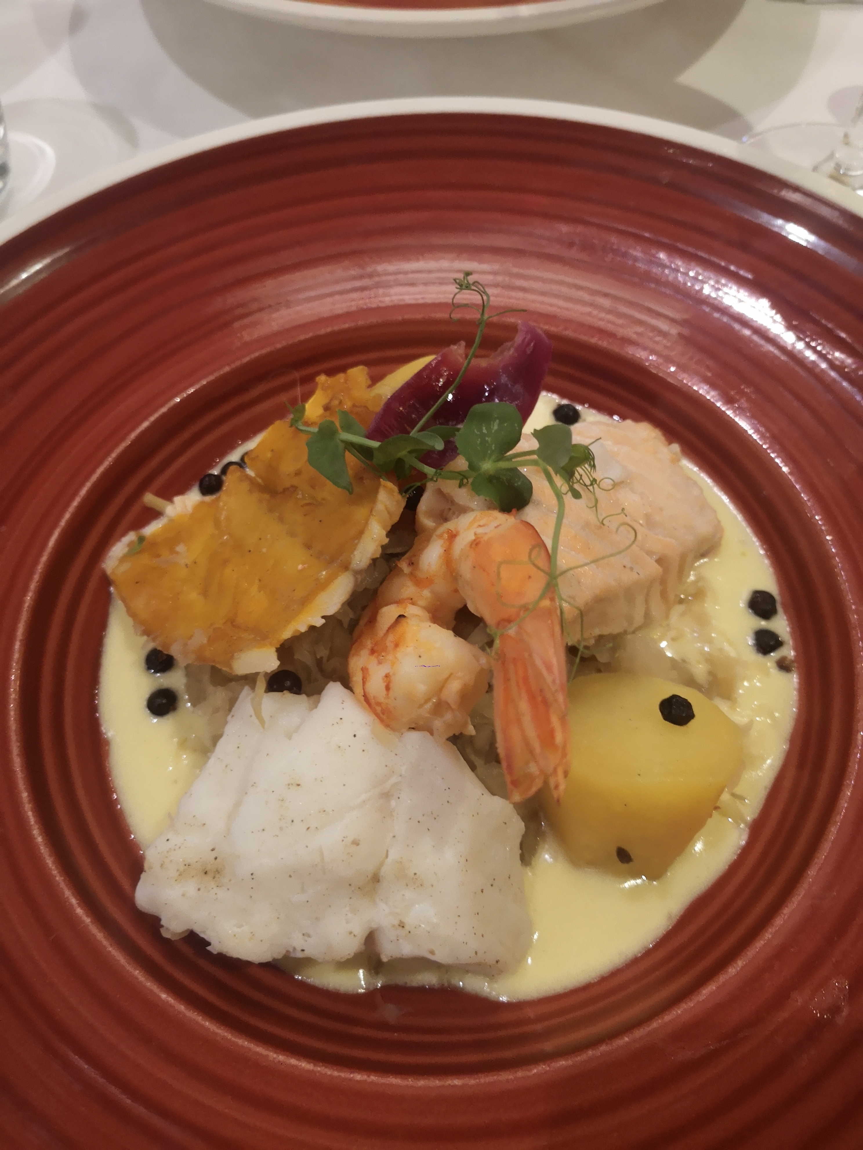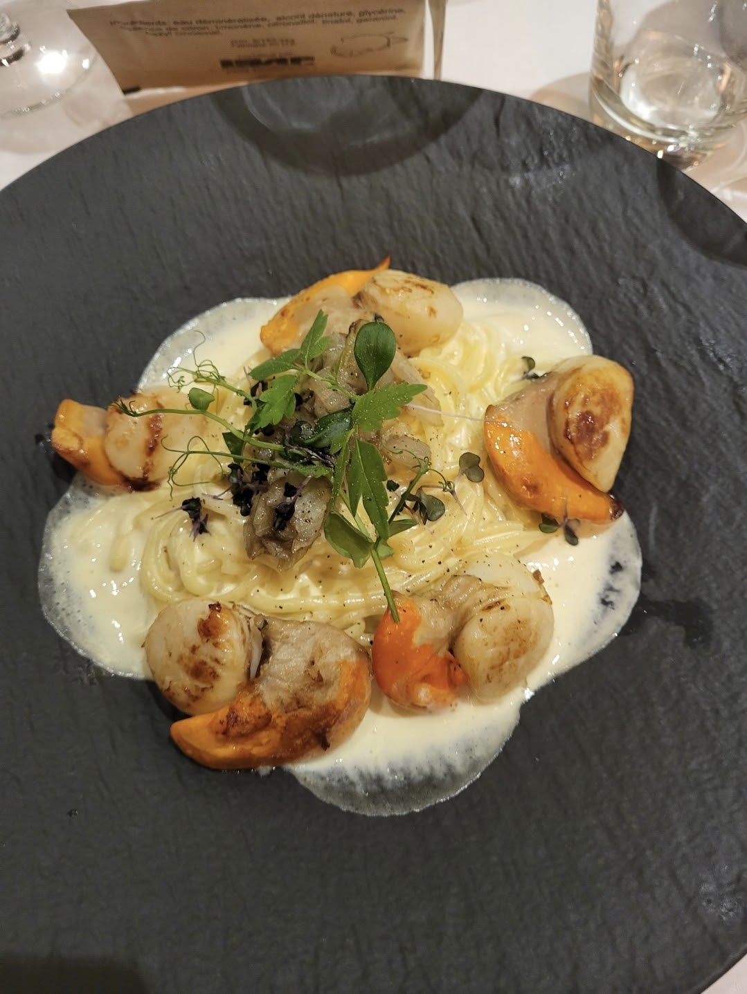 Cuisine grasse. Service approximatif. Foie gras servi avec des morceaux de baguette grillée et encore il a fallu réclamer ces ‘toasts’. Coquilles St Jacques servies avec une purée au goût indéfinissable , du céleri et des reliquats d’endive filandreuse nageant dans l’huile.