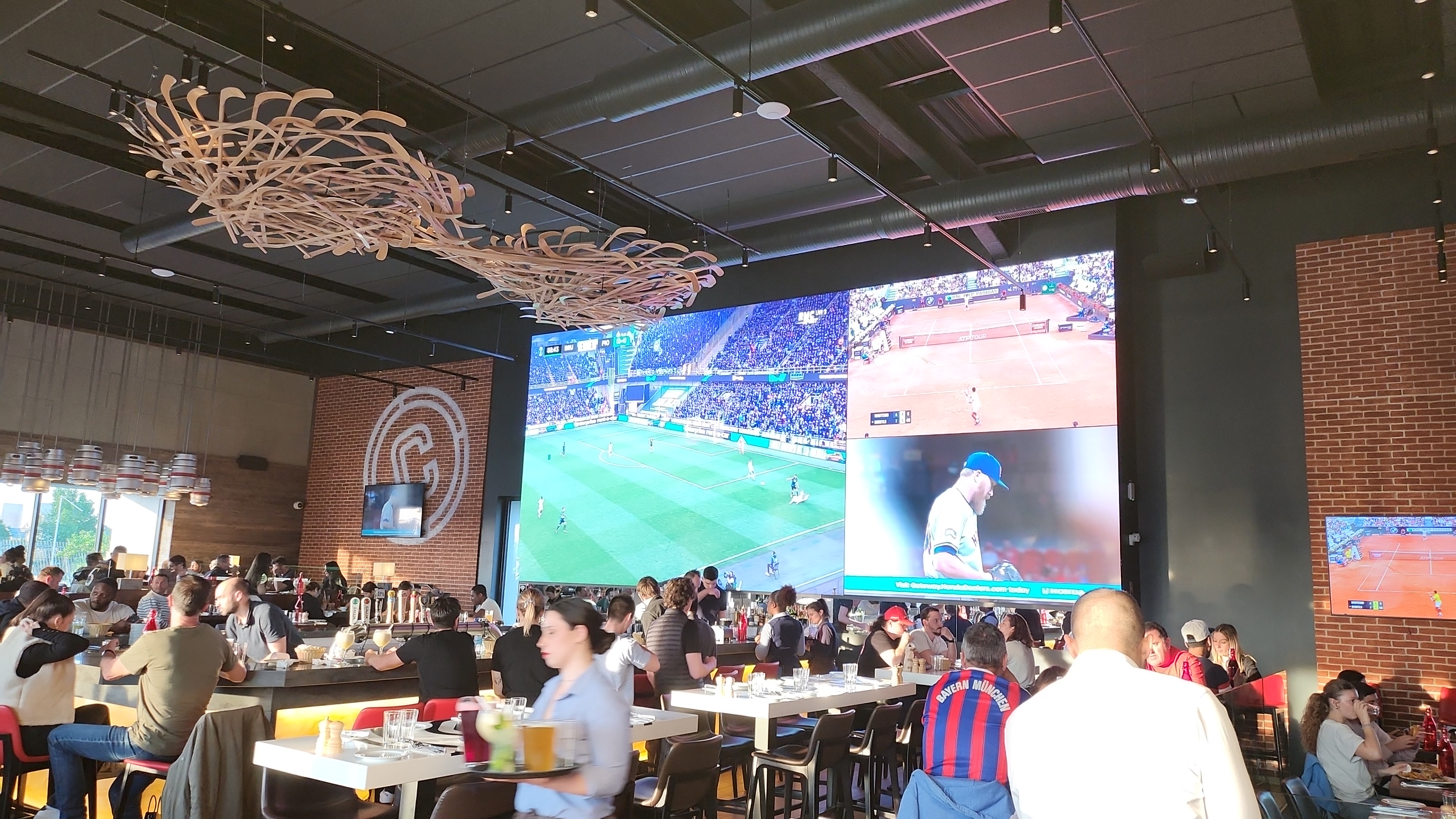 Dès l'entrée à l'intérieur nous avons compris l'importance du lieu avec tous ces écrans et on ne sais pzs trompé surtout un soir de finale de top 14 quel ambiance ! Ensuite nous avons mangé, en ayant vu les prix assez onéreux au début, on a eu un peu peur mais rassurée vous, les plats sont très très généreux, pour ceux qui ont un très bon appétit ne faites pas les gourmands. Nous avons été très bien accueillis et très bien servis tout au long de la soirée proposant constamment des bouteilles d'eau ou ailleurs cela reste compliqué. On y retournera avec grand plaisir.