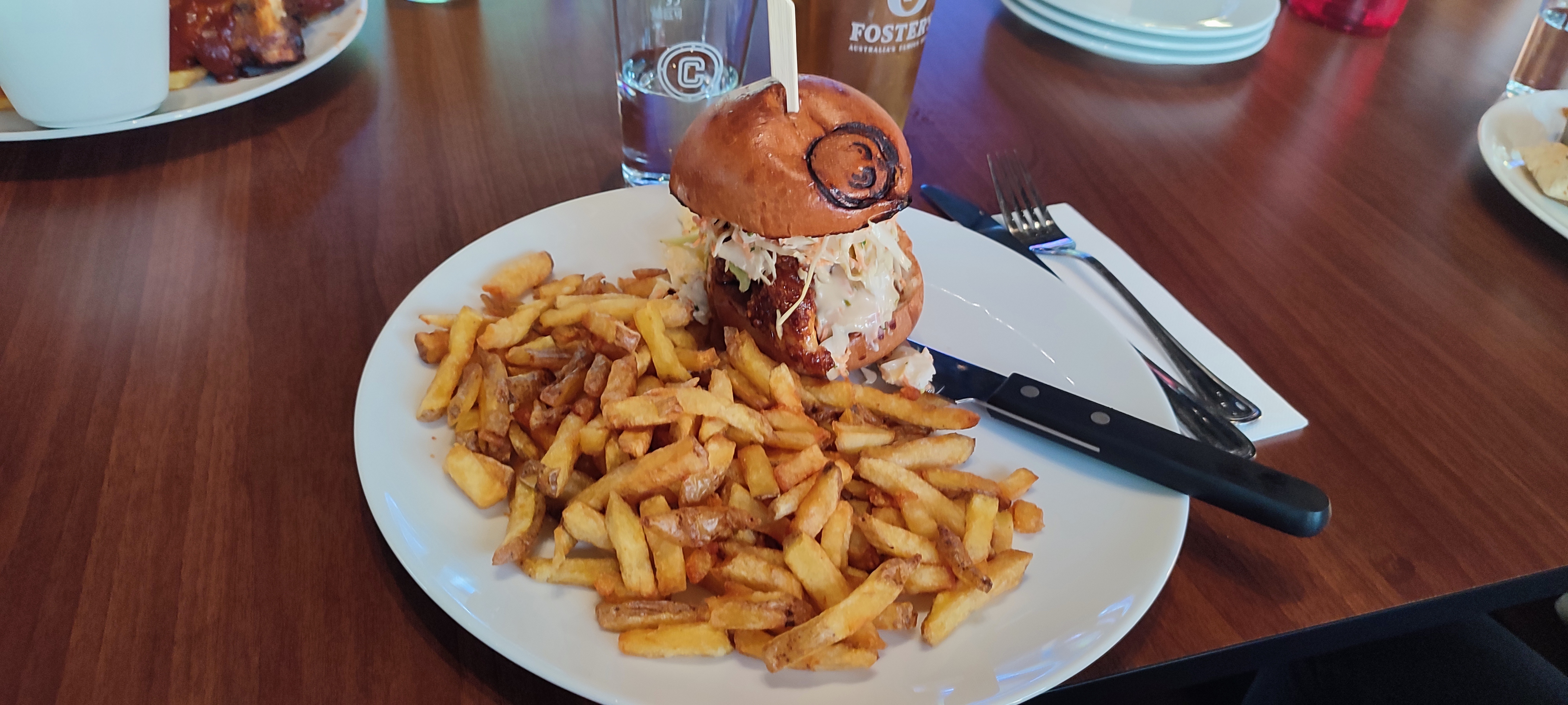 Concept sympa pour boire une bière et aller voir un match. Par contre je ne peux pas m'empêcher de réagir à la réponse du propriétaire sur ses produits d'exception en circuit court alors que dès la porte d'entrée une ardoise indique l'origine des viandes (ce qui est, je le conçois, un gage de transparence envers la clientèle): poulet d'origine belge et polonaise, bœuf d'UK et d'autres viandes d'Union Européenne. Je pense qu'on peut faire plus local au niveau de la viande alors que la bière elle l'est. Frites arrivées froides et avec peu de goûts, sauce des ribs amère mais c'est peut-être une question de goût. Et rien de tel qu'un burger avec un steak frais saignant et non une préparation à base de viande forcément trop cuite; mais ce n'est qu'un avis personnel.