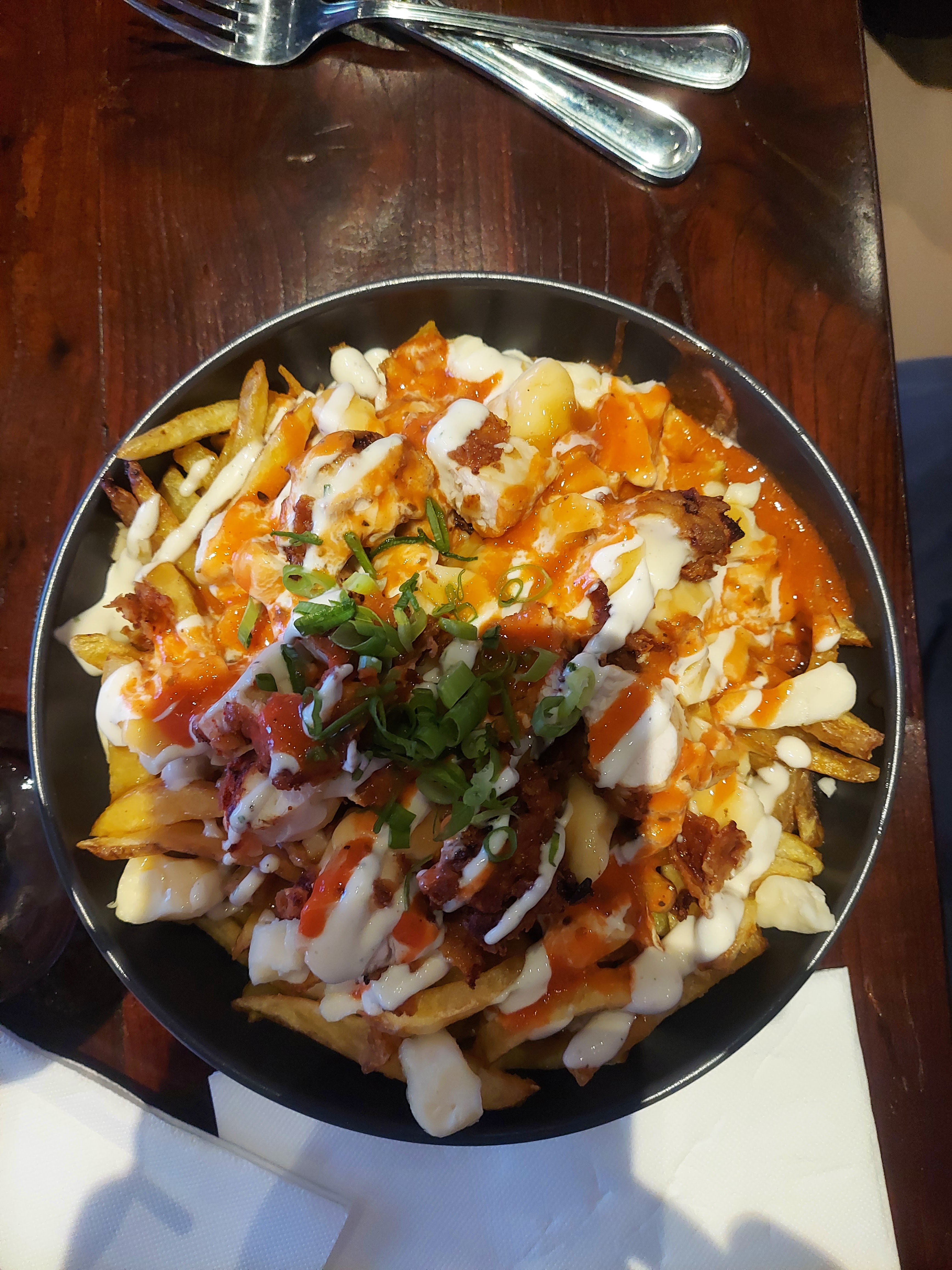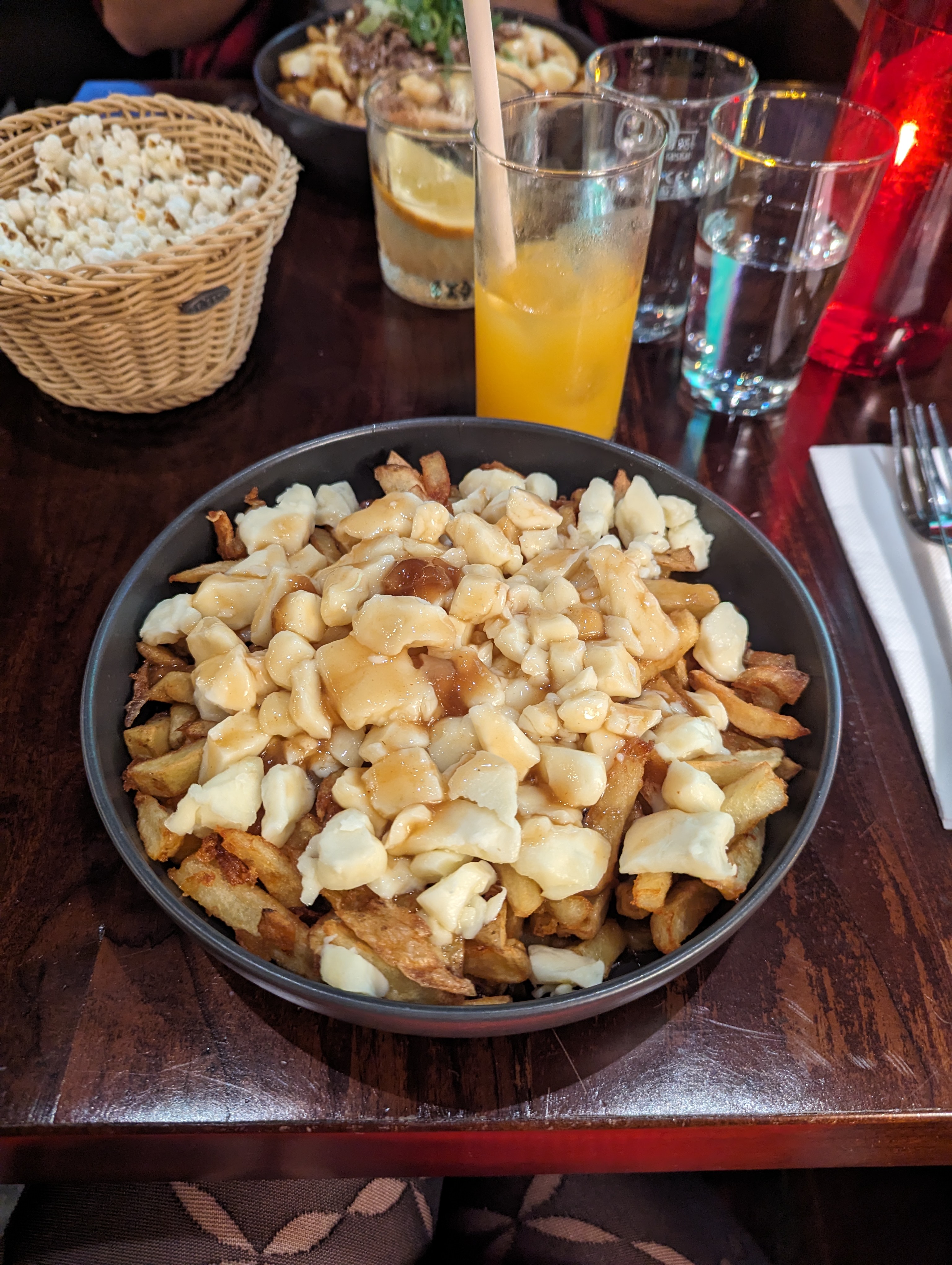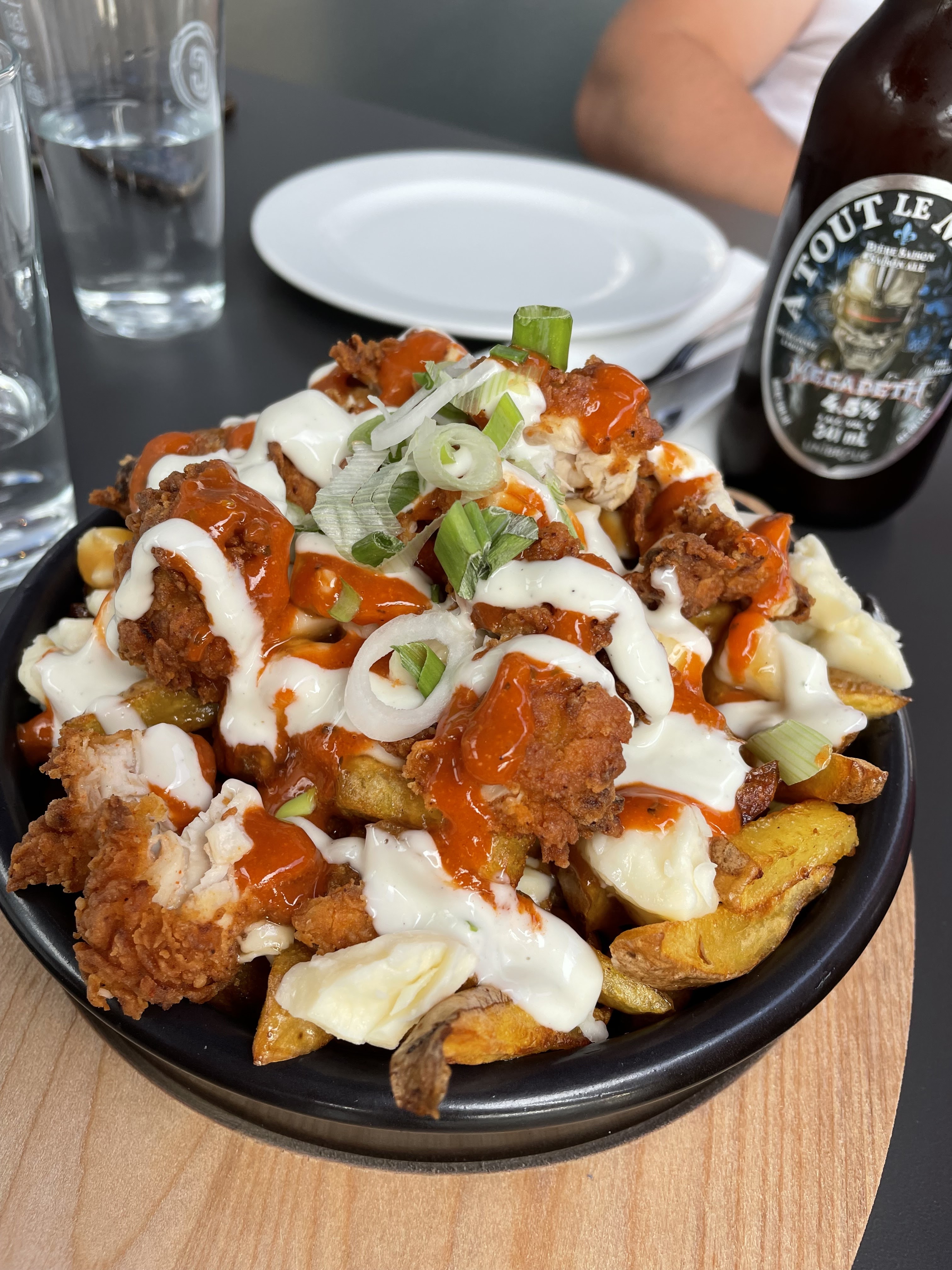 Ça fait du bien de manger une bonne poutine! Le lieu est très cool, mais un peu moins bar sportif que les cages au Québec