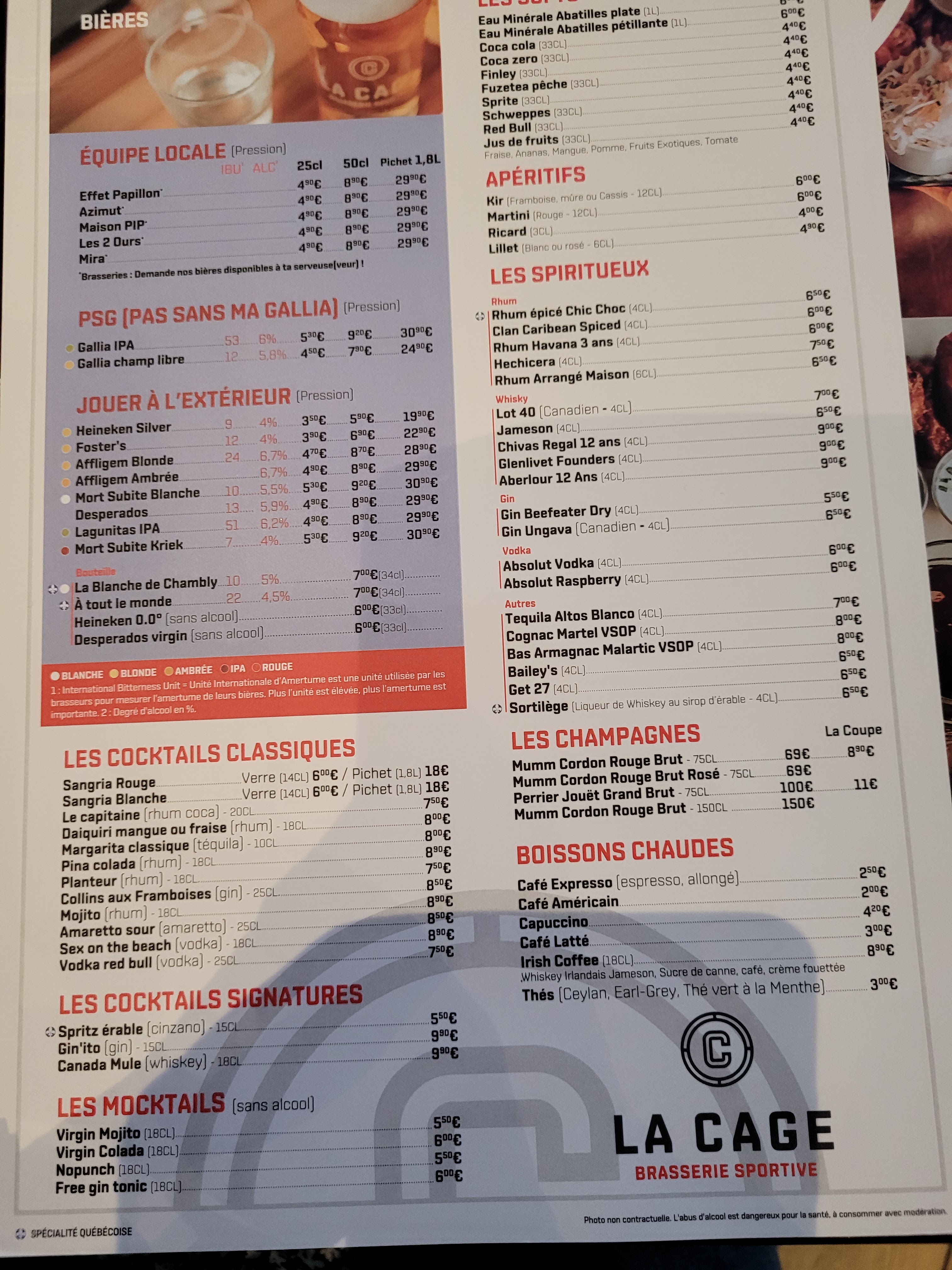 Très bonne expérience que la cage. Personnel aux petits soins, cuisine 100% maison excellente et copieuse. Prix raisonnable ( les ribs sont excellents ). Des immenses écrans partout avec projection de matchs de touts sortes. Tous les amateurs de sports y trouveront leur compte. J'imagine bien l'ambiance qui doit y régner les soirs de match. Je conseille vivement.
