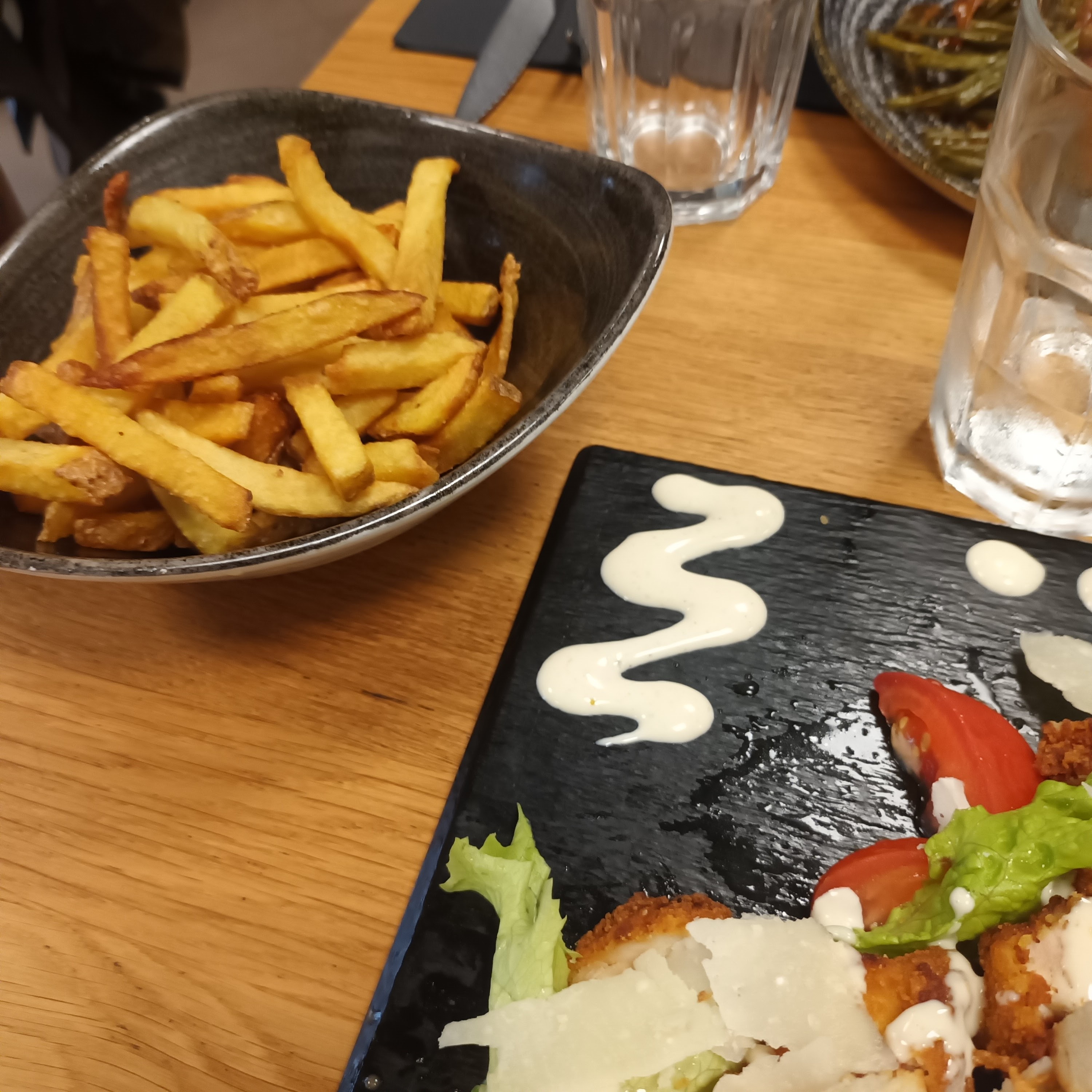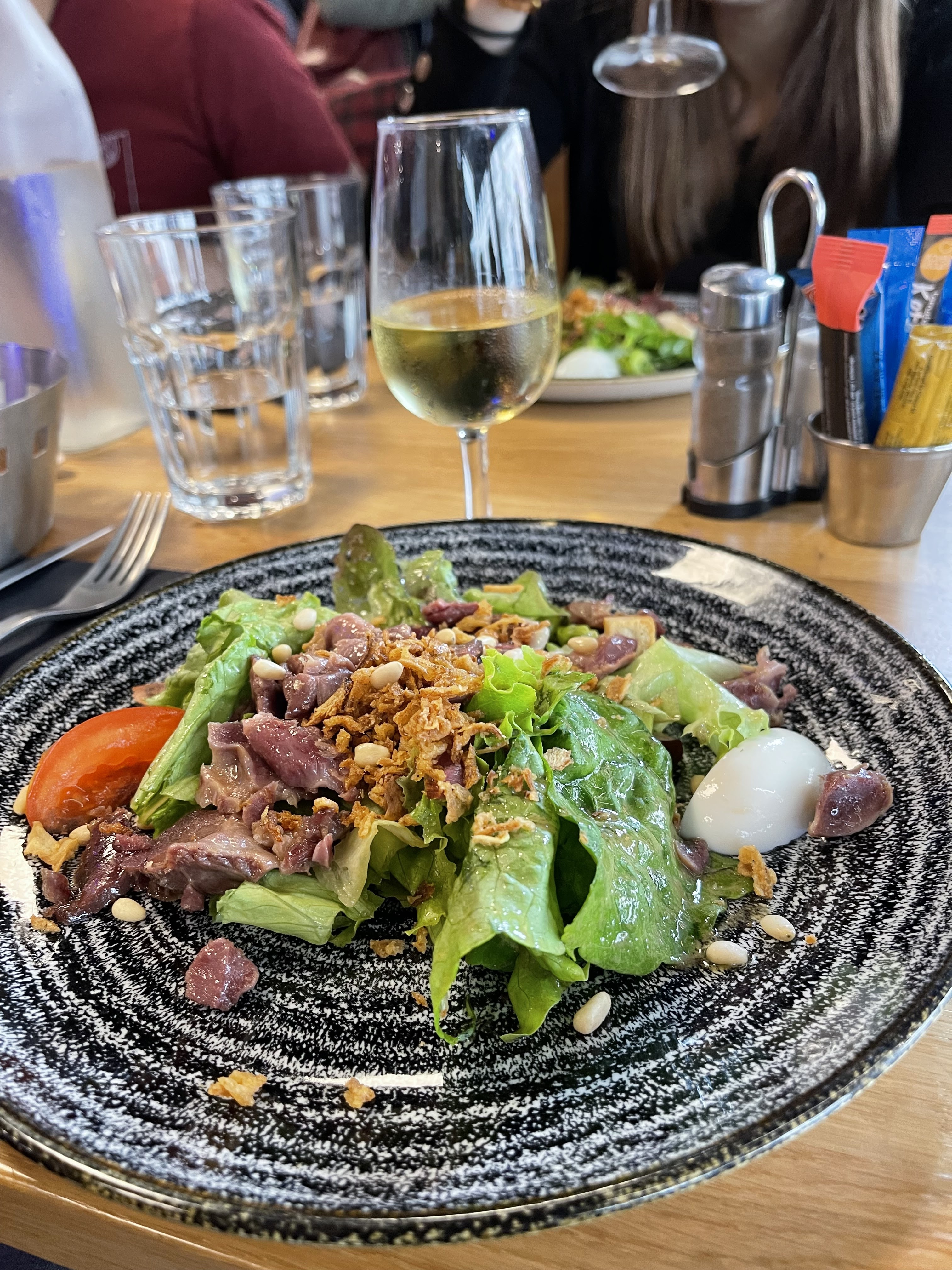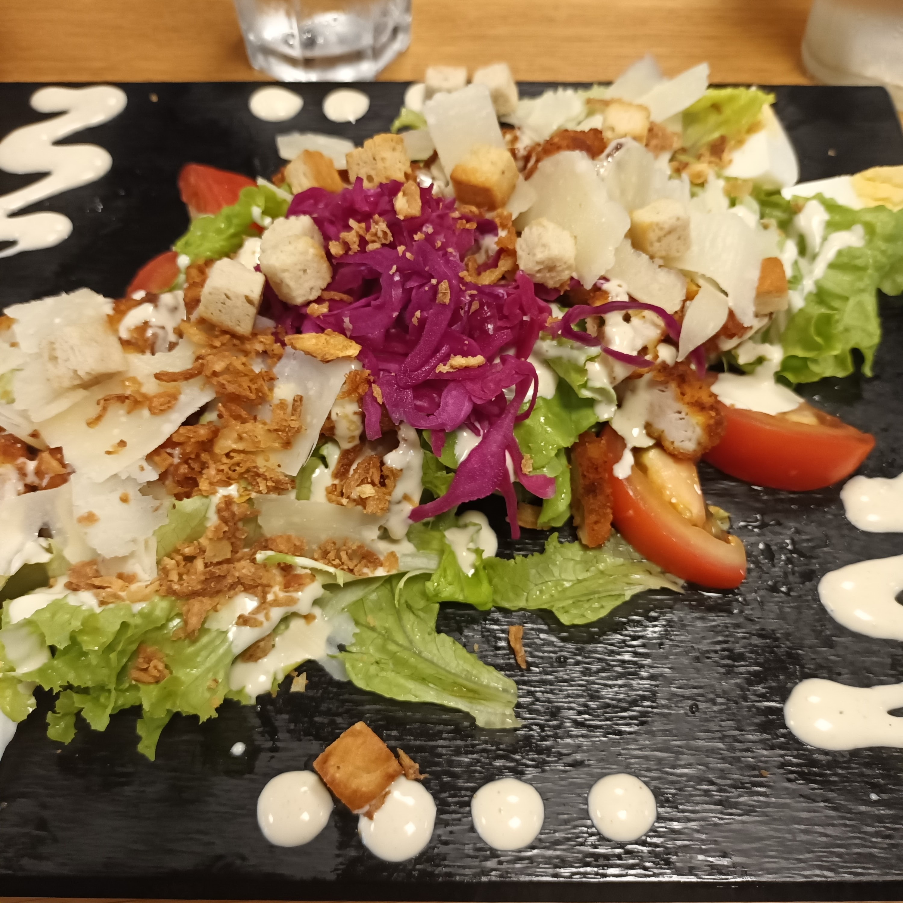 Une salade Ceasar avec de la salade verte fraiche et du poulet croustillant chaud comme il convient (ni trop, ni trop peu)…un pur délice. Certainement plus au calme en soirée qu’en journée. Accueil très agréable et service rapide ( à la limite un peu trop en soirée). Très bonne adresse.