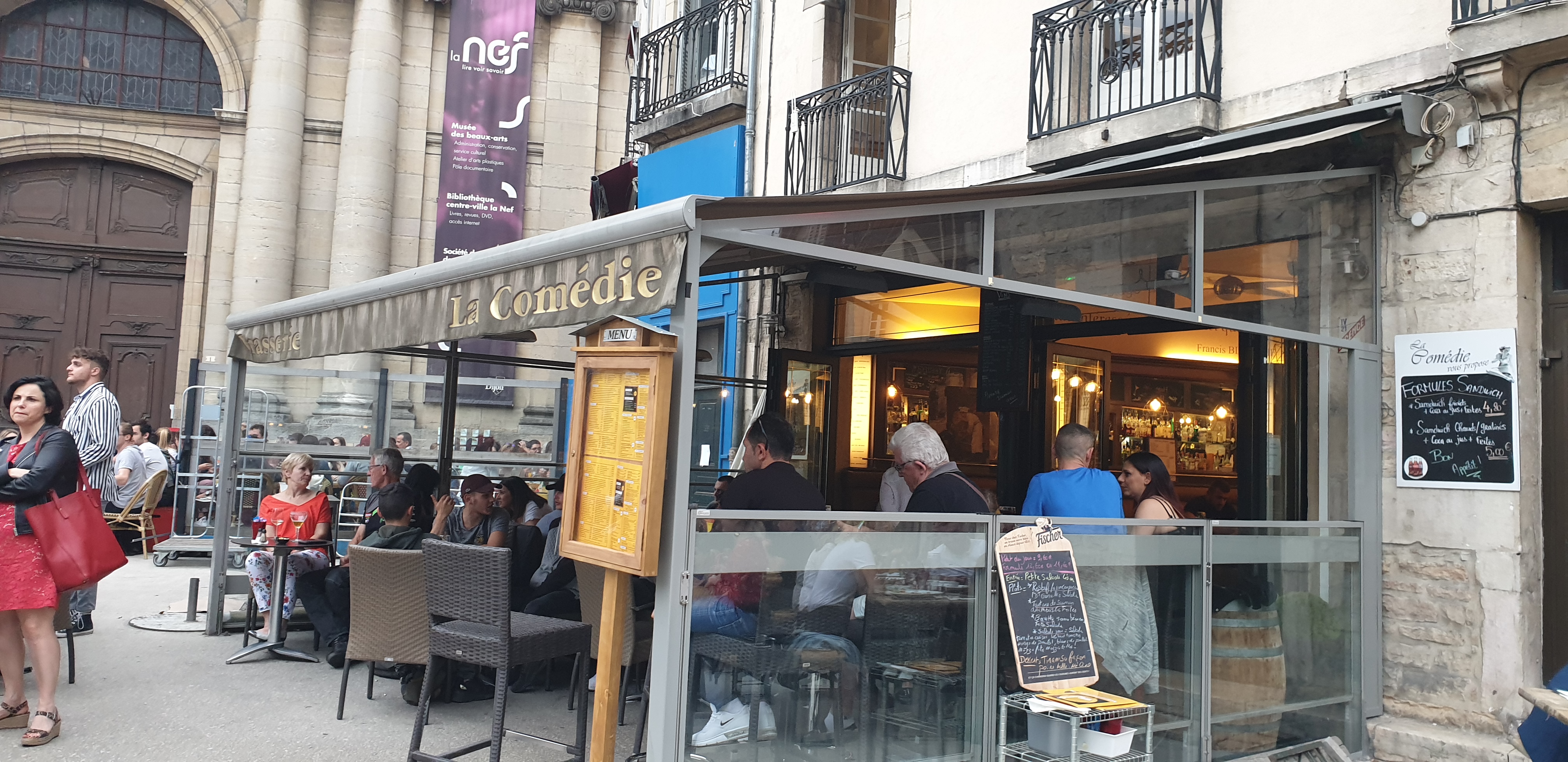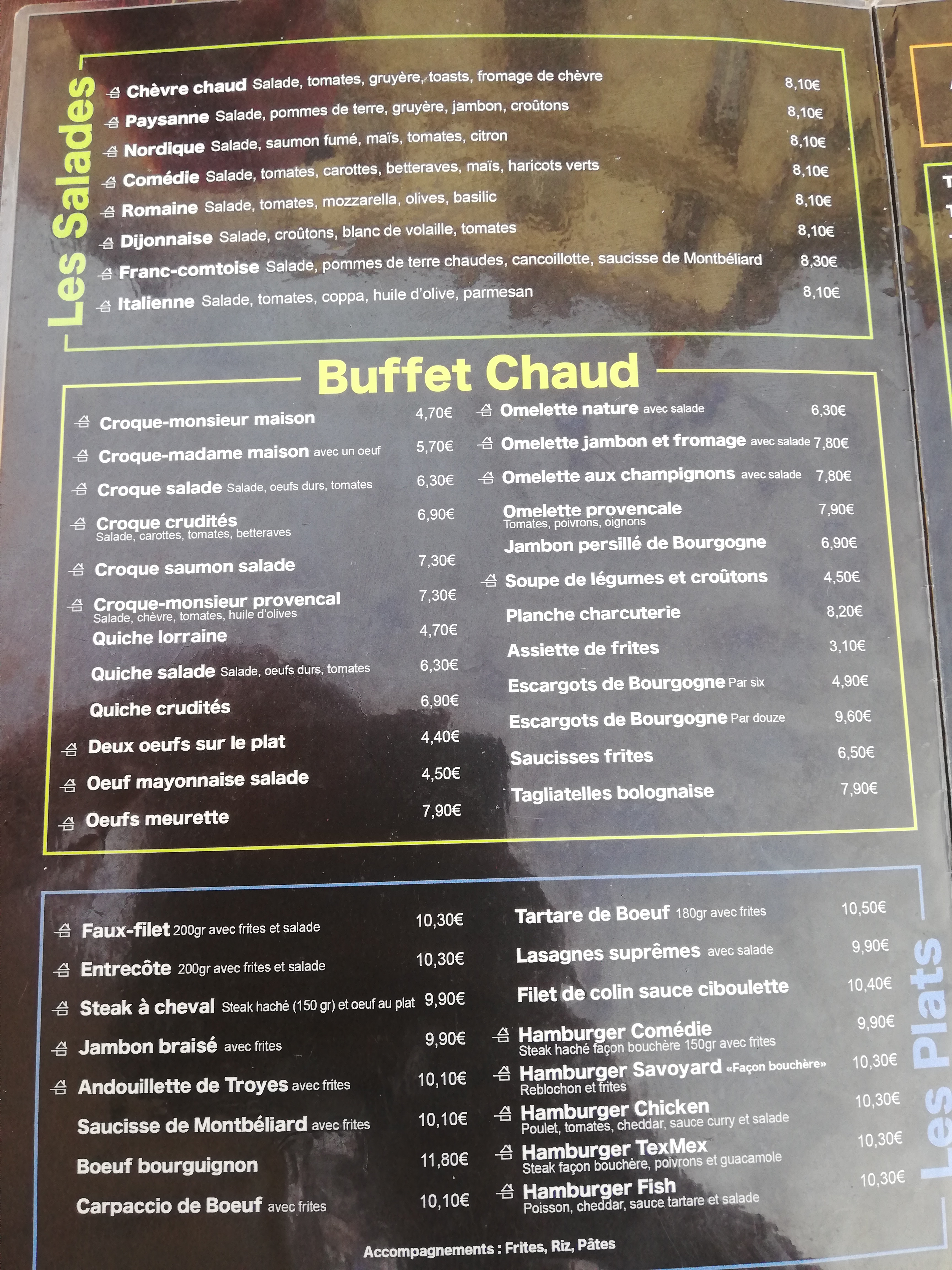 Le mieux à la Comedie, c'est la carte des vins, généreuse et qui en plus s'affiche au mur en panneaux lumineux. Ca permet de rêver un peu devant les noms prestigieux. Et un bon marc de Bourgogne pour ceux qui auraient oublié le goût!