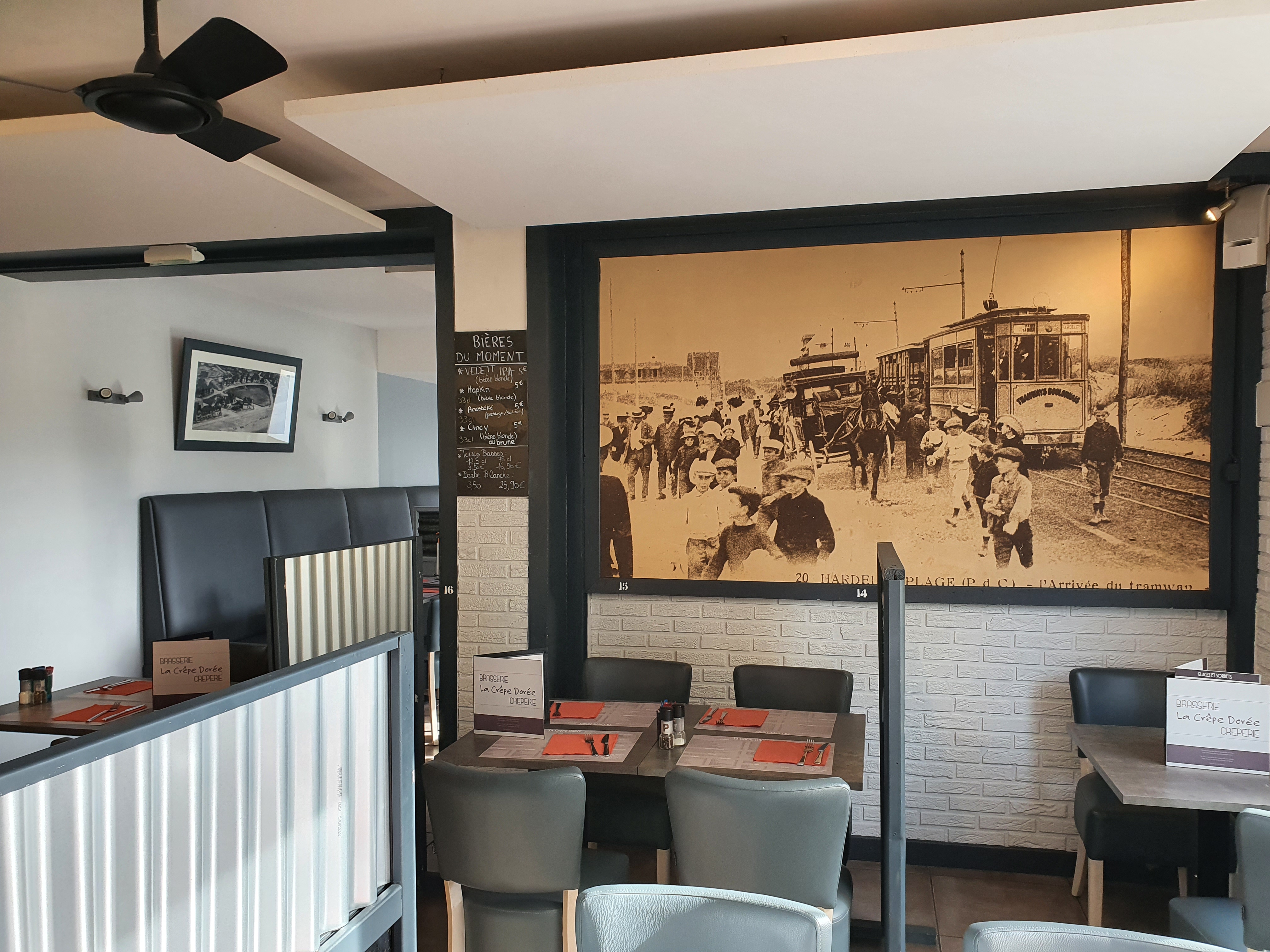 Qu’elle déception. Vu les avis nous comprenons que depuis le changement des propriétaires le service a bien baissé. Mais ce n’est pas grave, c’est des étudiants ils ont le droit d’être lent, de dénigrer les collègues qui sont là depuis peu. Accueil plutôt sympathique de la serveuse, table de 7 personnes juste à côté du bar donc plutôt satisfait puisque au calme. Enfin c’était la première impression ….. le barman qui n’est pas content d’avoir « beaucoup » de boissons en préparation (c’est son joob), après notre commande de boissons la petite phrase « vous voulez me tuer » 1 mojito, 1 sex and the beach, 1 margarita, 2 bières, 1 orangina, 1 jus de pomme (menu enfant fille de 3 ans). Je pense que c’est une commande plutôt tranquille surtout que le restaurant n’était pas complet. Apéritif sans biscuits en accompagnement 😔 à priori nous ne sommes pas privilégiés puisque certaines photos Facebook sont avec. Après 45 minutes une serveuse vient demander si ils peuvent lancer les plats. Plats reçus en 5-10 minutes donc très rapide. Nous demandons au serveur si il peut prendre la commande des boissons pour le repas, mais il y a qu’une des deux filles qui peut gérer la commande. Malheureusement elle arrive au bout de 10 minutes, le welsh était fini au 3/4. Boissons qui arrivent rapidement quand même. Assiettes vide, au bout de 40 minutes la serveuse vient nous voir pour débarrasser, elle demande si nous souhaitons la carte des desserts, nous disons oui. Au bout de 25 minutes TOUJOURS RIEN. Nous prenons la décision de partir malgré que notre fille de 3 ans et demi n’a pas eu sa glace dans son menu enfant que nous avons payés bien sûr. Le mécontentement a été fait auprès du barman. La saison démarre, le week end dernier les restaurants à hardelot étaient complet, je n’ose pas imaginer le service …. La crêpe dorée a toujours eu une bonne réputation avec un service top et une cuisine top. Aujourd’hui la cuisine est top, mais le service est NUL. Tout le monde a le droit de commencer dans la restauration, mais je pense que vous devriez revoir votre formation en interne. Et surtout faire prendre conscience qu’un client content peut ramener 2-3 clients mais un mécontent peut faire fuir 15-20 clients potentiel et qu’il est plus facile de détruire une réputation que de faire une bonne réputation.