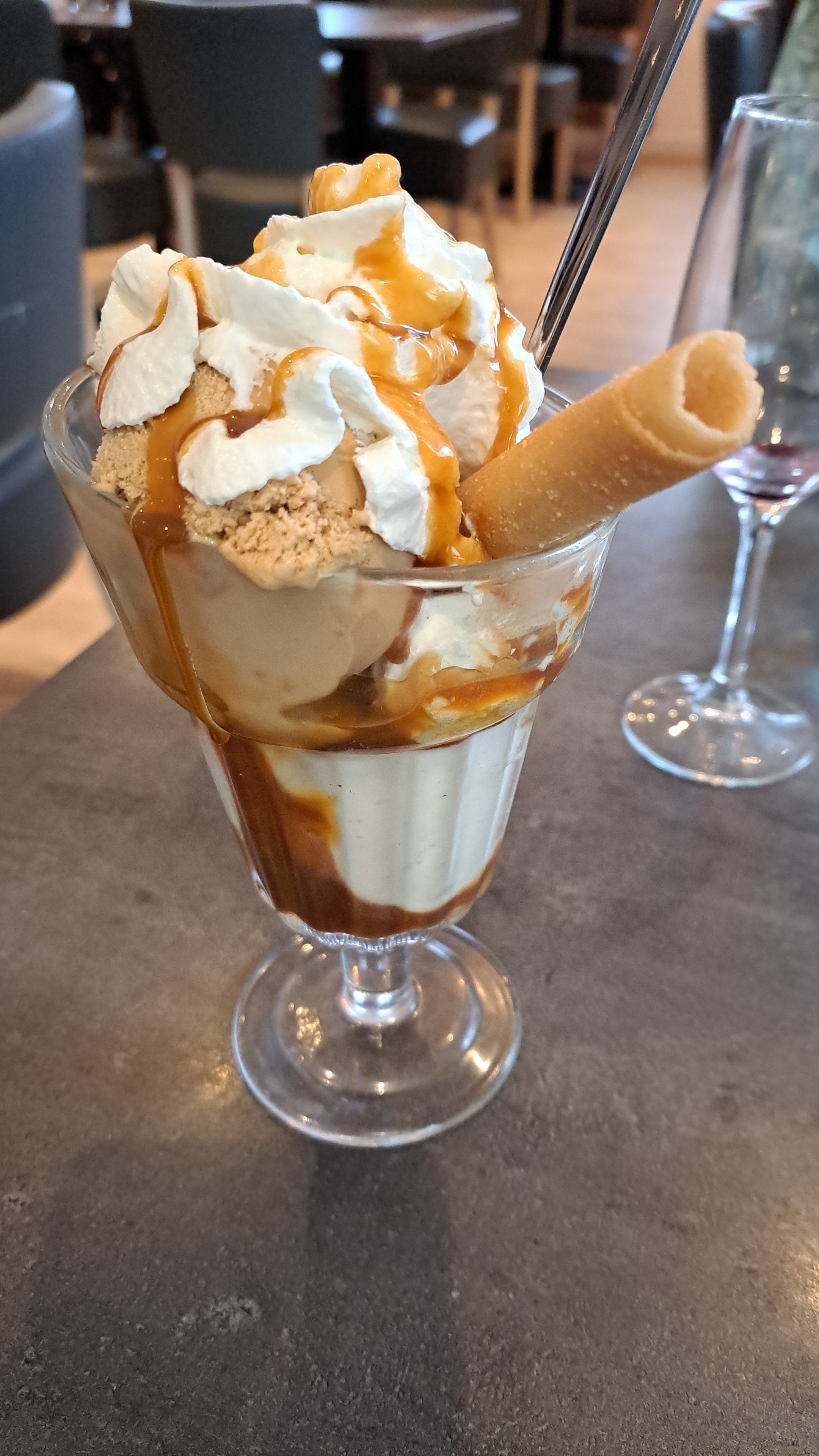 Fin août. Après une crêpe fondue de poireaux St Jacques riche en noix nous avons osé une coupe glacée : généreuse en noisettes entières etc, et délicieuse. Le personnel était très souriant et pas expeditif comme dans certains lieus. Nous recommandons +++
