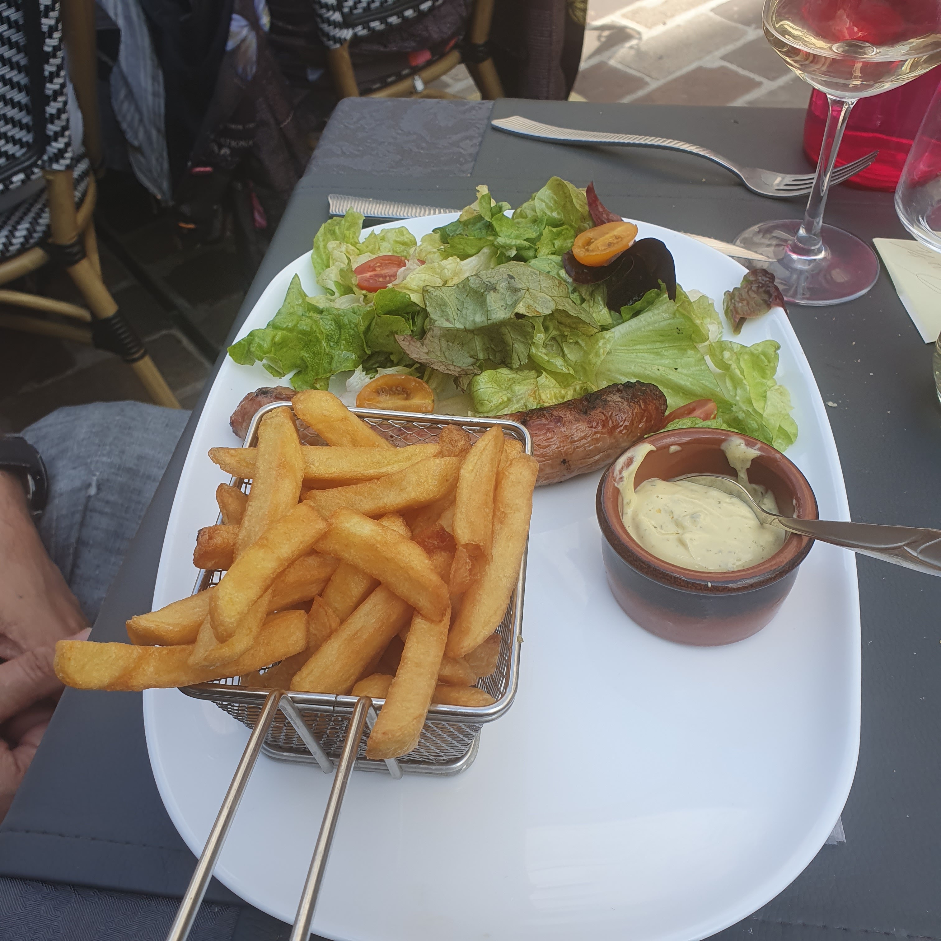 En vacances en famille. 6 adultes ont dîné ici samedi soir et c'était superbe. Non seulement le repas était délicieux, mais le service de la jeune serveuse était de première classe, et nous avons également bénéficié d'un chanteur/musicien français pour nous divertir. Le faux filet, les tagliatelles de saumon, le café gourmand et la Dame Blanche étaient particulièrement bons. Rapport qualité/prix fantastique. Hautement recommandé. Merci.