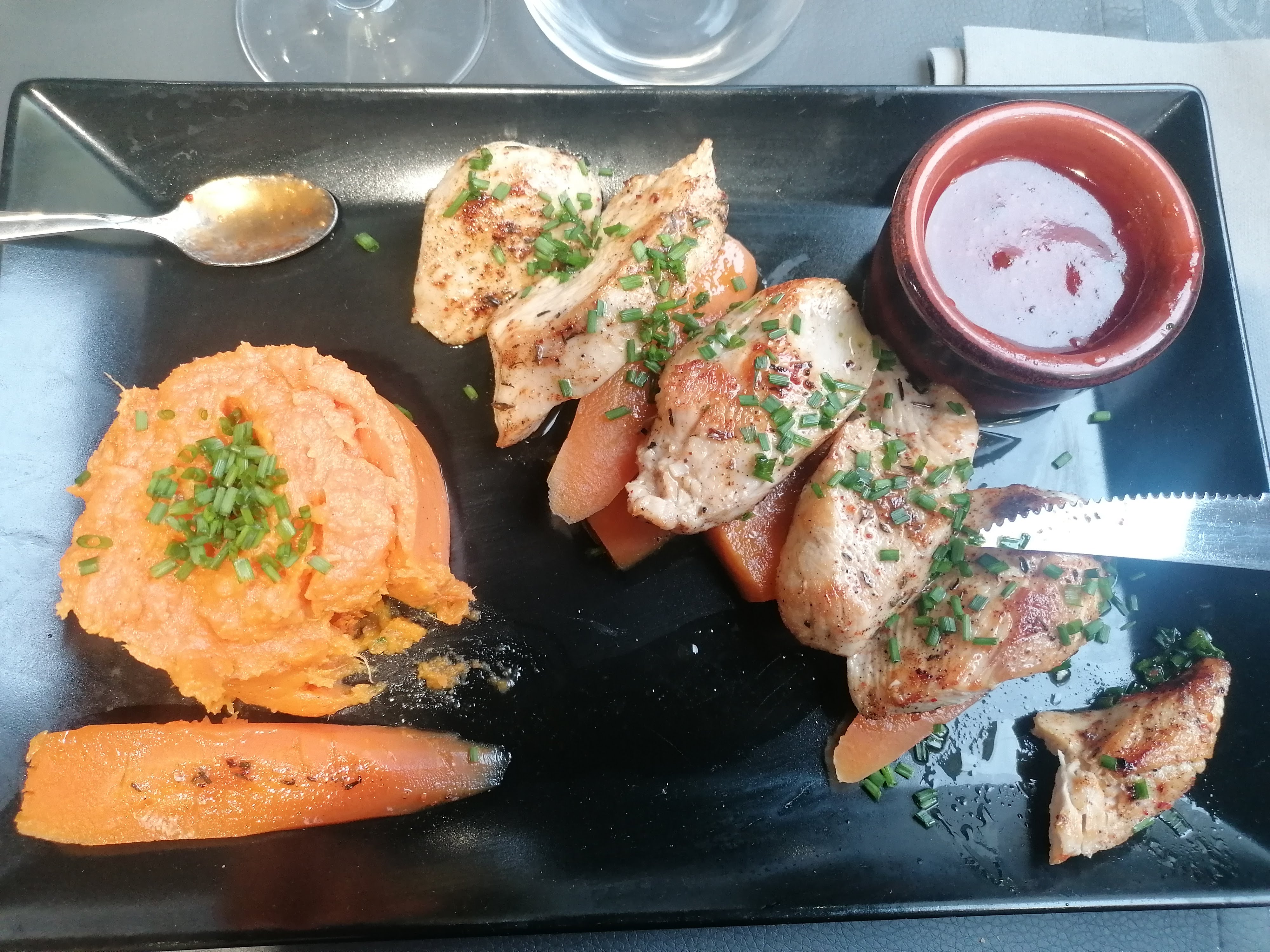 Je recommande le lieu. Personnel accueillant. Plats copieux et savoureux. Attention particulière pour notre chienne : la serveuse nous a apporté de l’eau. Petit velouté pois-piment d’espelette-vanille offert.Bonne cuisson du magret au miel et sa purée. Bonne crème brûlée.