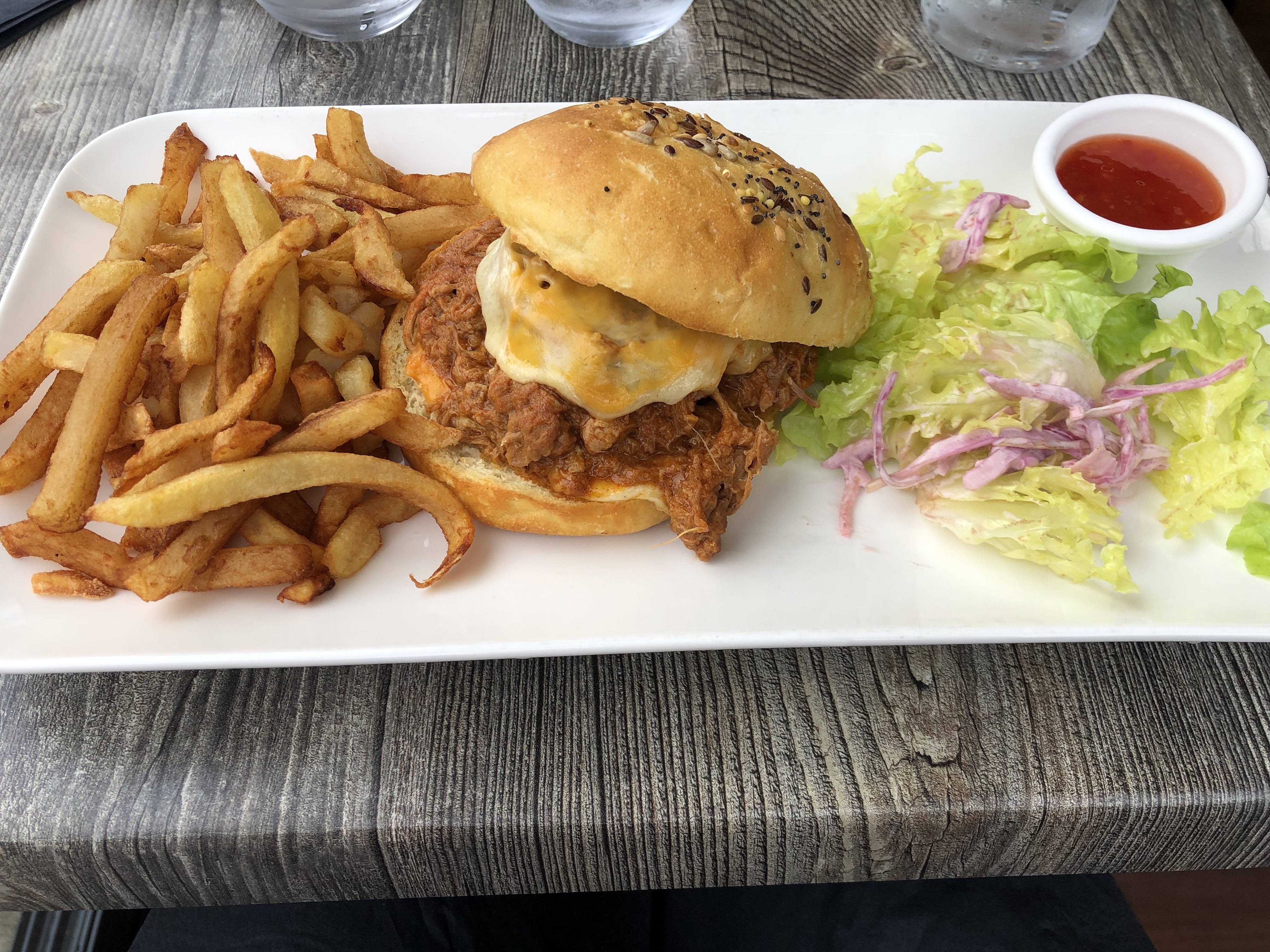 Assiette décevante, peu de salade, 2g de coleslaw, frites ok mais burger un peu basique. Service ok, salle intérieure plus sympa que la véranda qui a vue sur le point P. Pas très glamour.