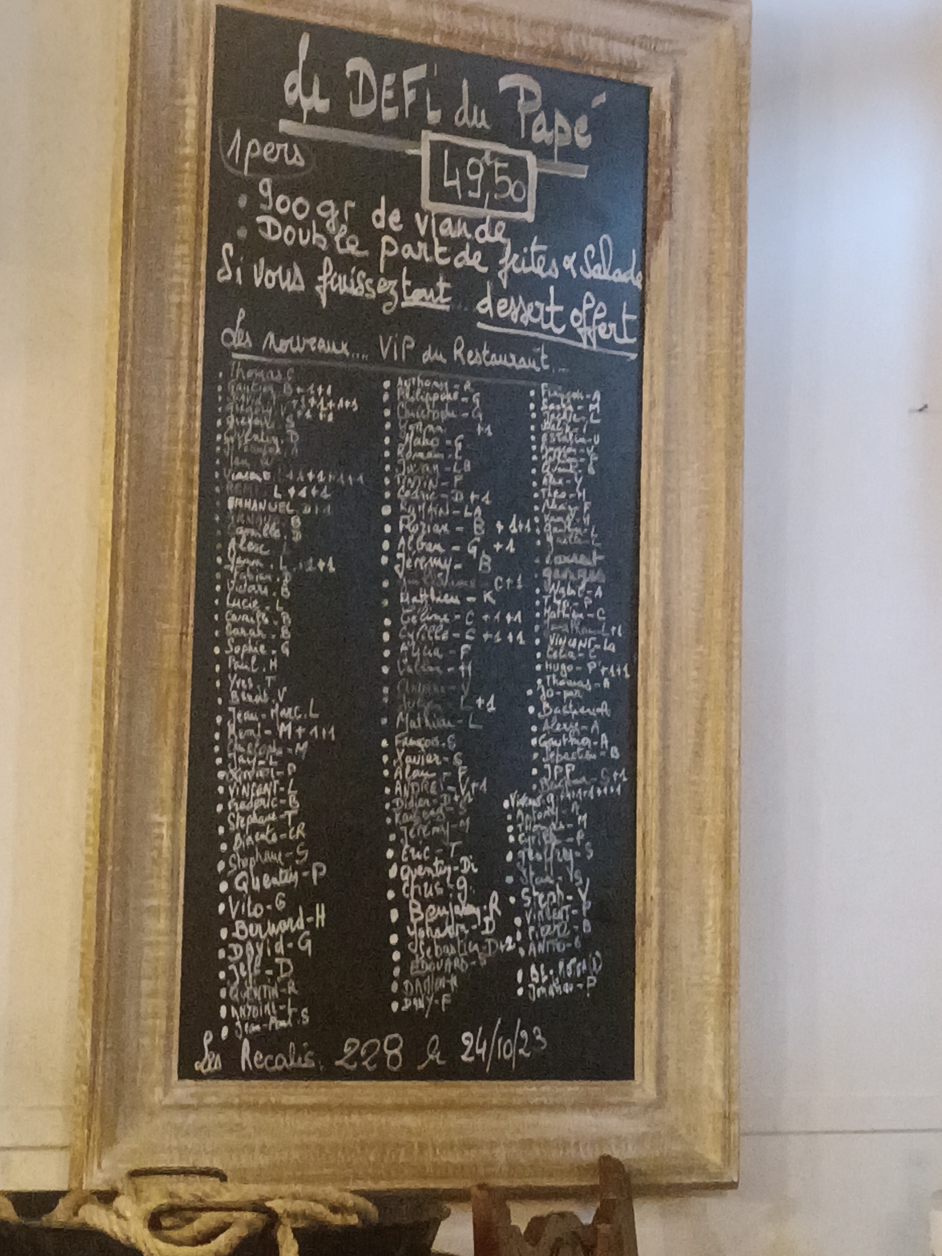 Un lieux atypique et très sympathique. De la cuisine du sud-ouest avec de vrais bons produits de la ferme... à base de canard !!!! On reviendra relever le défi du Papé ! 700 gr de canard 400 gr de frites un peu de salade et si vous finissez votre assiette le chef vous offre le dessert ! Et votre prénom figure fièrement sur le tableau des finaliste ! Les recalés sont comptabilisés aussi mais par discrétion on n'inscrit pas leur prénom.