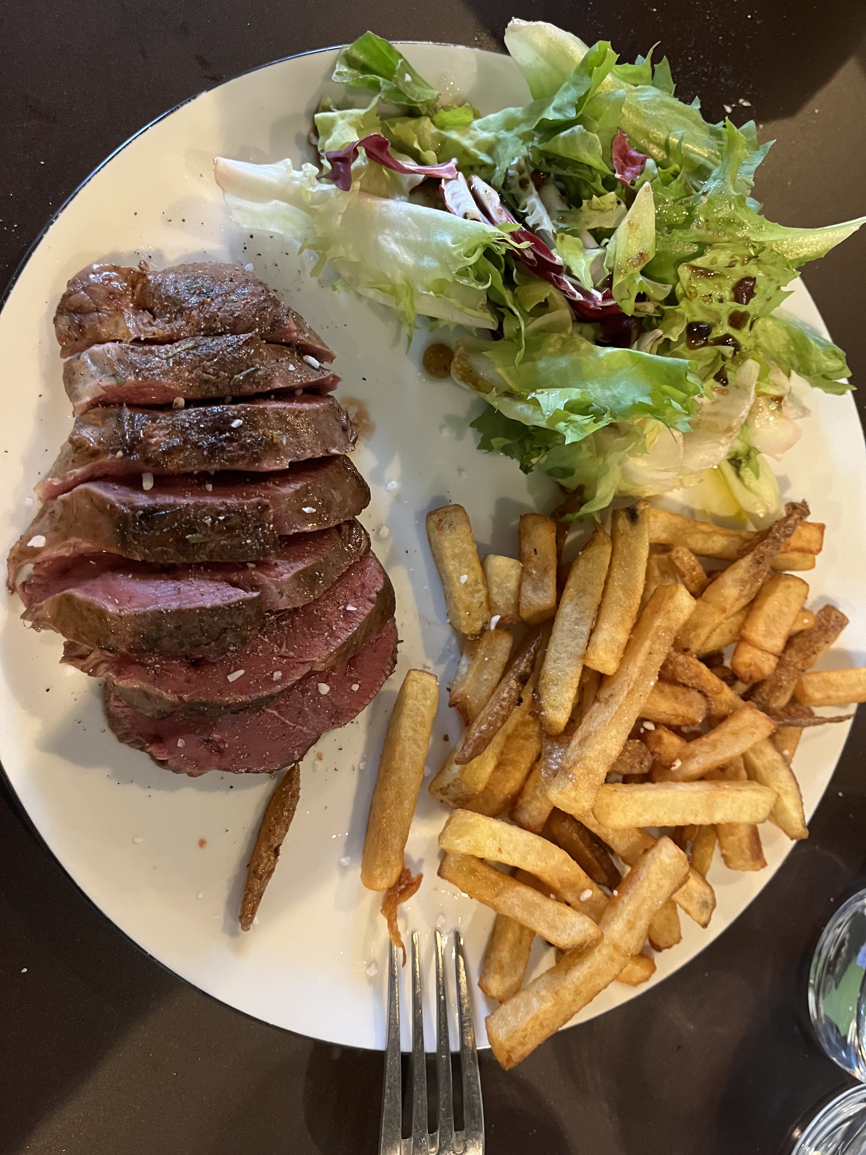 C'est bon et même excellent grâce à des produits de qualité, mais les portions sont un peu chiches : 1/3 de magret, c'est peu. Heureusement qu'il y a les frites (à la graisse de canard) 🍟 et l'entrée et le dessert 🍰pour compléter. L'accueil est plutôt réservé.