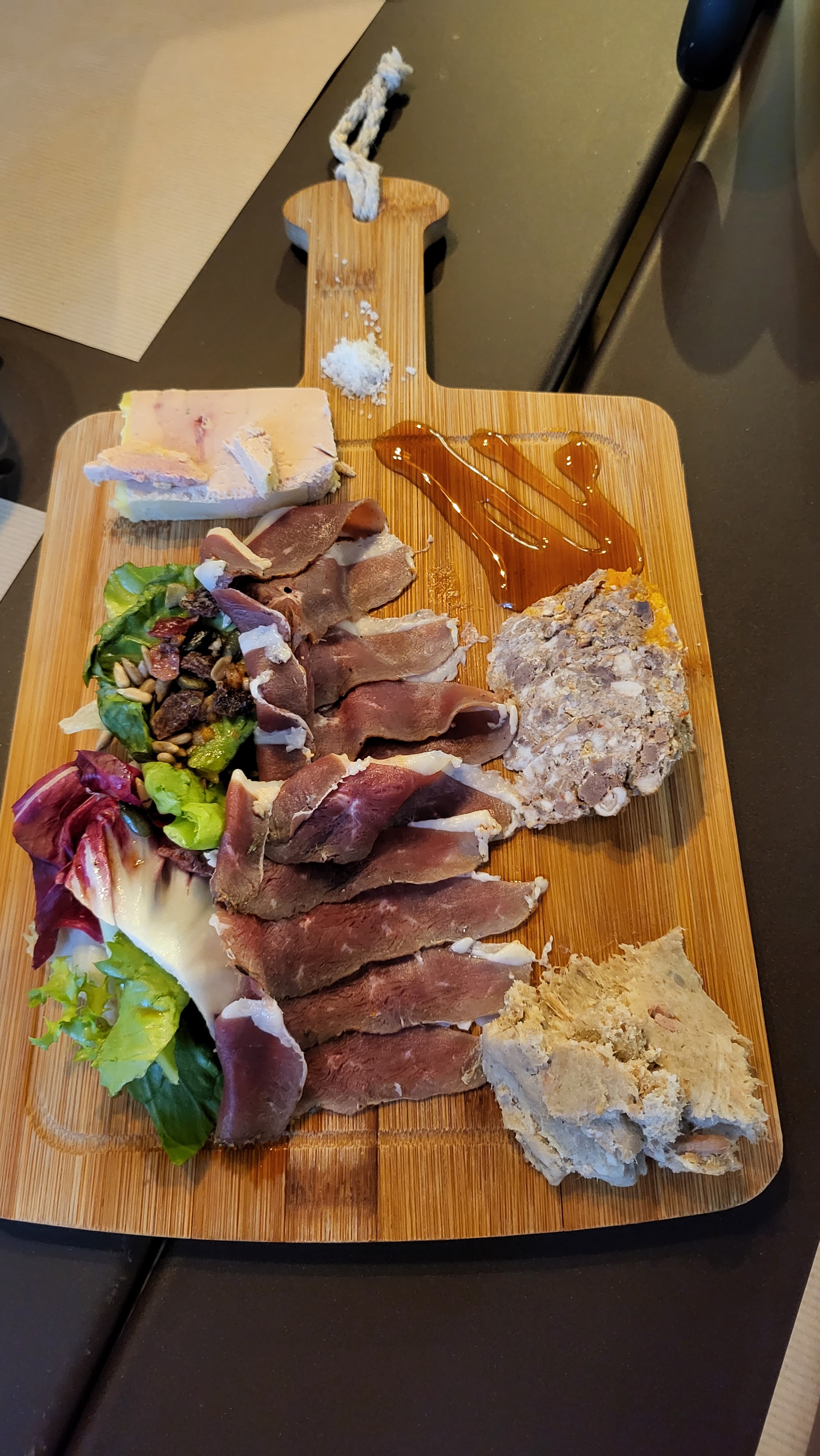 Très belle surprise. Très bon accueil. Le gérant est de très bons conseils. Nous avons pris une planche de rillettes/pâtés/ foie gras une côtelette de canard ainsi qu'un magret ... nous nous sommes régalés. Les produits sont de qualité. Nous y reviendrons a coup sûr.