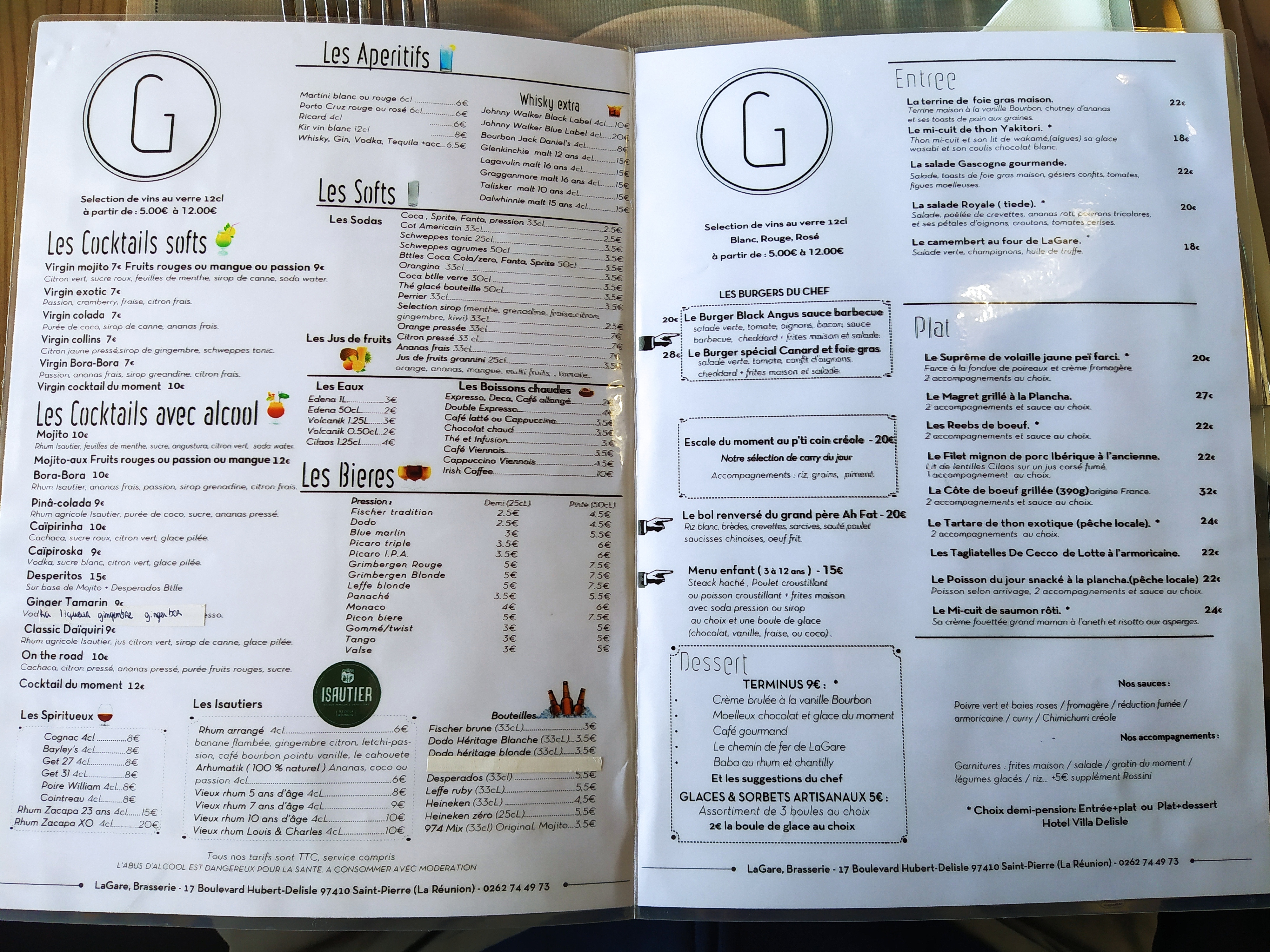 Personnel courtois, voir aimable , lieu unique à St Pierre du fait de sa localisation dans l’ancienne gare, tout prés du port et de la plage.Malheureusement c’est de la cuisine « gros doigts » comme on pourrait dire en créole, un manque total de subtilité : le foie gras au rhum ,on sent bien le rhum pas trop le foie gras, le camembert roti croule sous les lardons, merci pour le sel! Le thon 2 façons se noie soit dans le pesto soit dans la sauce teriaki, écoeurant! Alors les frites sont bonnes et le burger aussi ,même si on est obligé de le manger avec fourchette couteau,vu qu’il est trempé dans le cheddar fondu.C’est dommage l’endroit est très agréable.