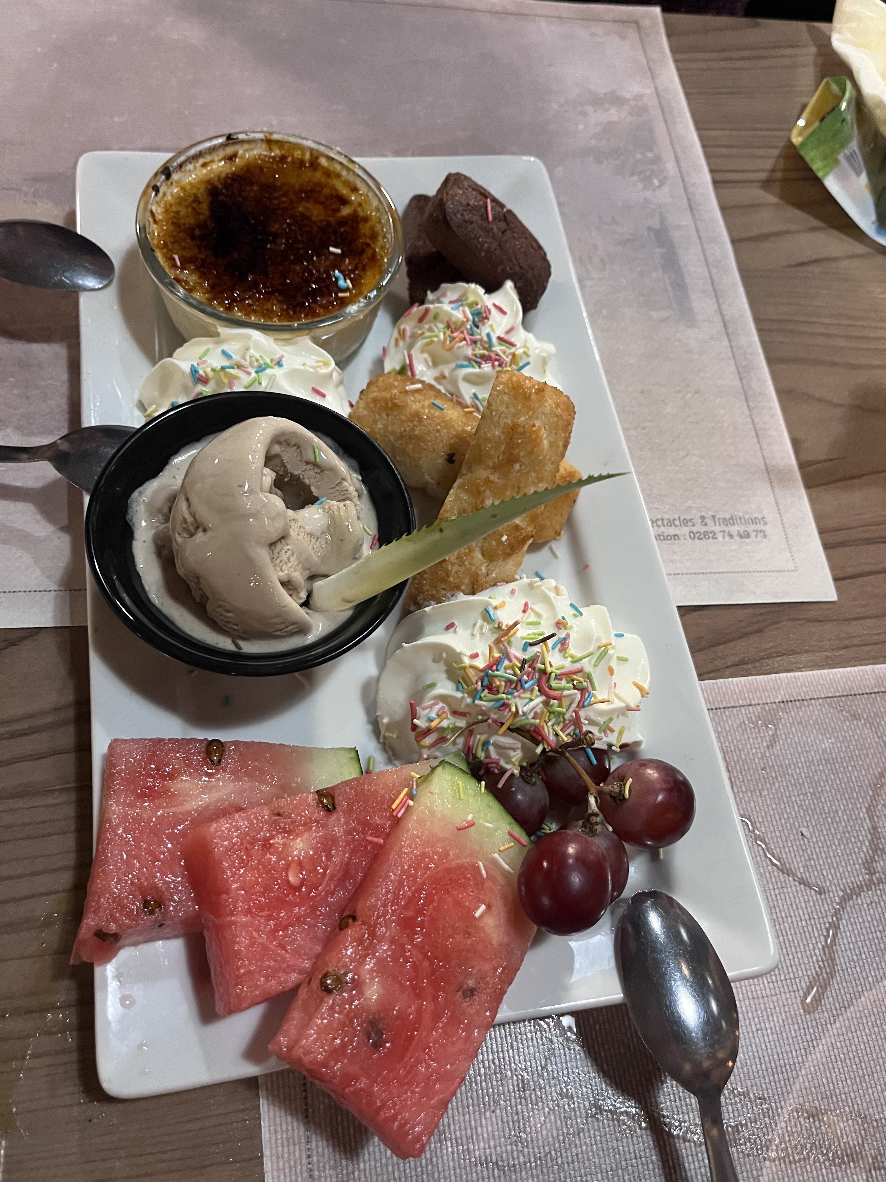 Service trop long. Les menus enfants étaient très bons. Mais le zourite grillé sauce à l’oseille n’avait rien de grillé et était même froid. Assez caoutchouteux…La sauce à l’oseille nous a laissé interrogateur et quand on a demandé où était l’oseille, on nous a dit qu’en fait c’était un mélange de légumes mais qu’il n’y a pas d’oseille… Le profiteroles devait me réconforter, mais il avait goût de brûlé, a priori le chocolat qui avait trop chauffé… Expérience mitigée pour nous donc…