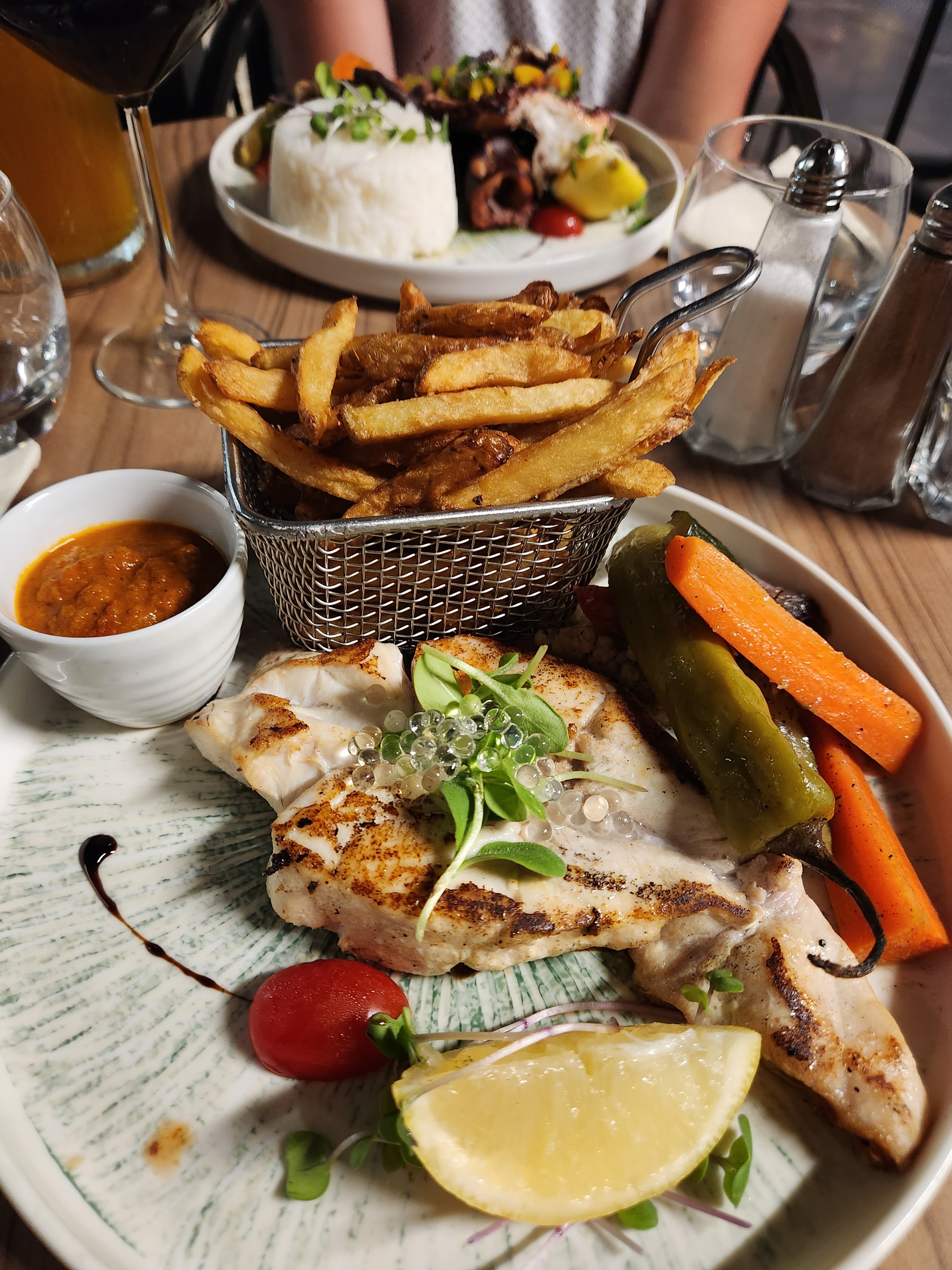 Bravo au chef 👨🍳, le repas était tout juste excellent, très copieux, le poisson frais parfaitement cuit... L’accès au restaurant est très prisé, un peu d’attente, gestion à revoir. Le service est très bien mais le personnel est un peu débordé entre l’installation à l’intérieur et l’extérieur des clients, sans compter ceux qui viennent pour prendre juste un verre 🥃 Bref, après le repas, les petits détails sont vite oubliés. Je recommande à 💯 %