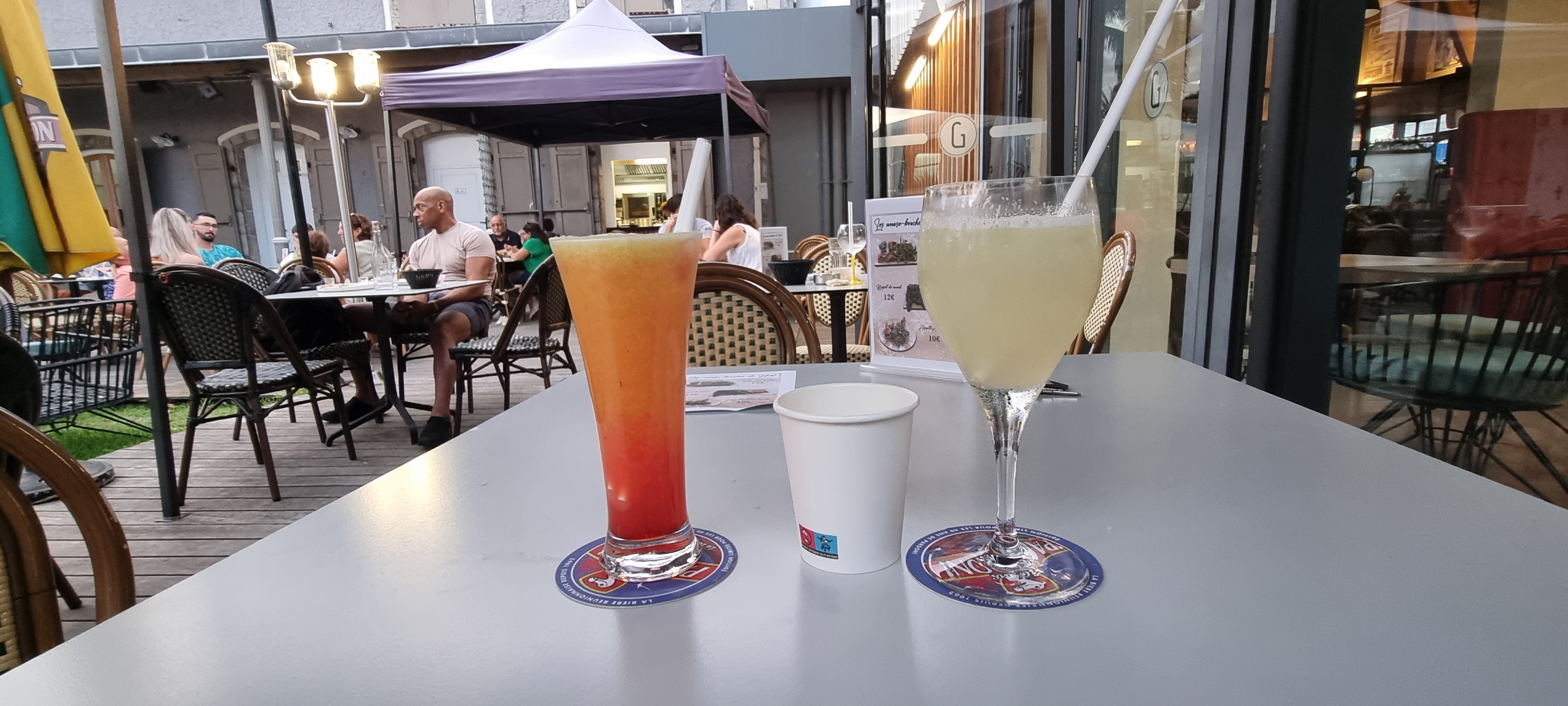 Serveurs sympa font un max pour être agreable. Malgré leur manque total de connaissances du métier. Le lieu est original avec des tables, sièges ou fauteuils éparpillés dans cette coure carrée de la très vielle gare de St Pierre