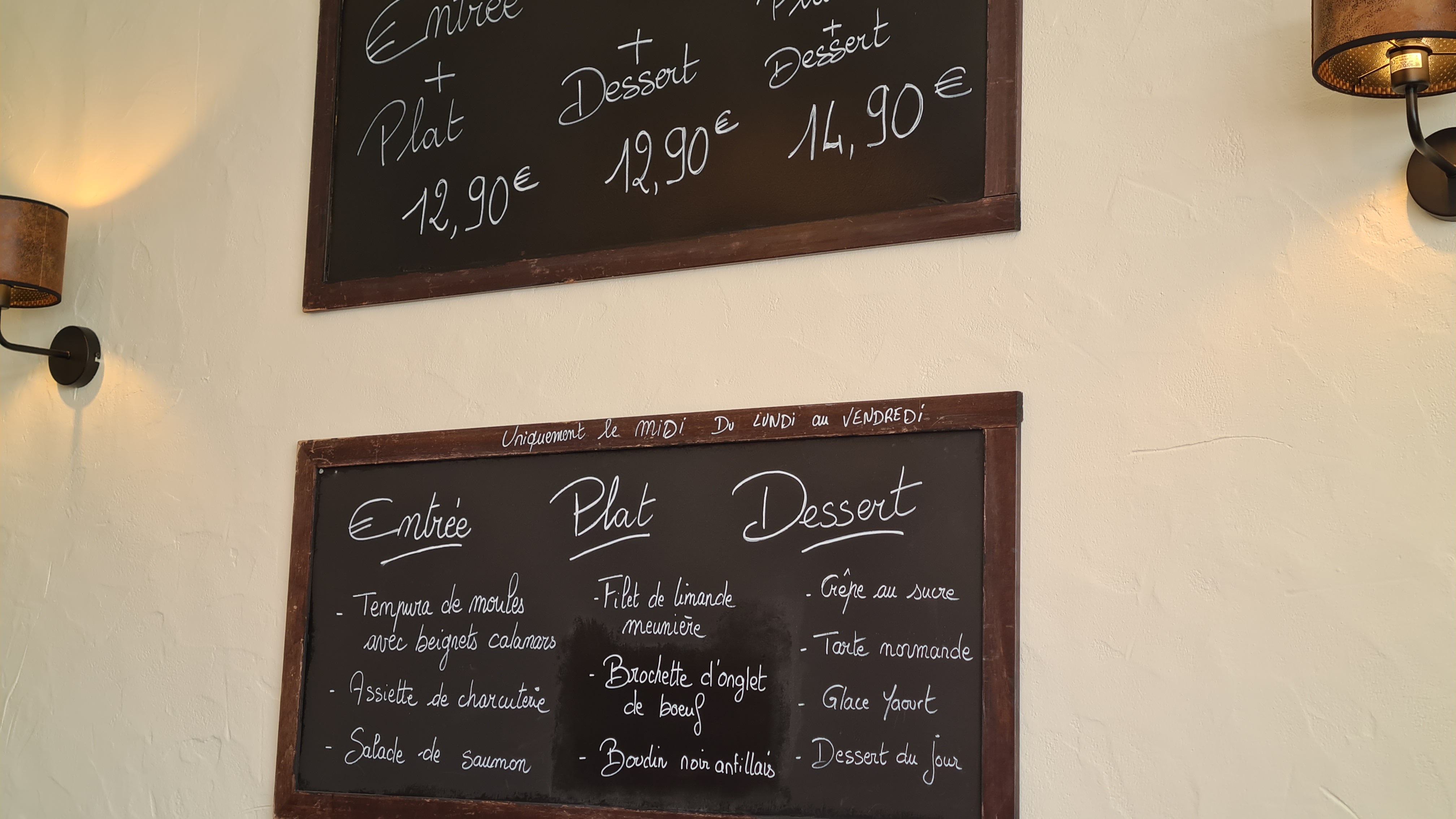 Bon côté l accueil ,le Menus enfants c'est qu'il vous apporte le plat juste après l'apéro servi, donc super, galettes à la carte copieuse même si à l'aperçu très peu de frite mais suffisant, ensuite menu, entre plat dessert ,entré très légère,moule marinière manque de goût , conclusion repas moyen mais suffisant pour nous, mais pas fais pour les grands appétits et dessert idem mais bon resto dans l'ensemble et toilettes très propre, bon resto mais sans attente de grand goût gustatif.