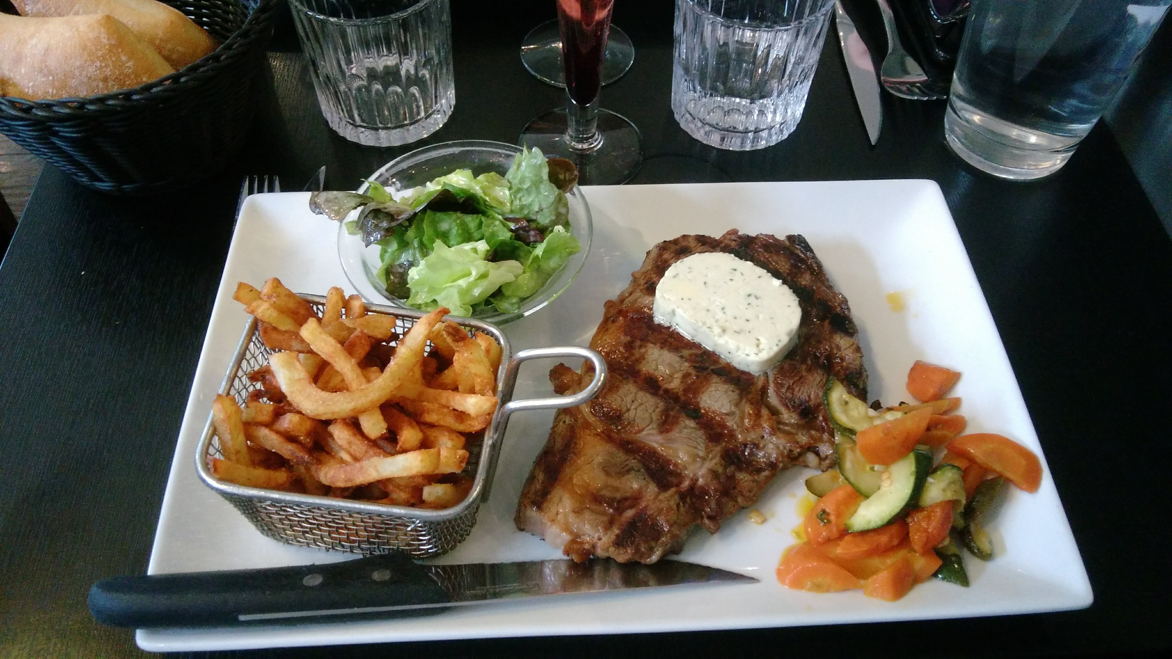 De passage sur Agen. J’ai pris la Côte de Bœuf 🐂 à 39 € sur l’ardoise. Mon collègue lui a prix une entrecôte à 36 # . Mon cote était plus petite que son entrecôte 🤨