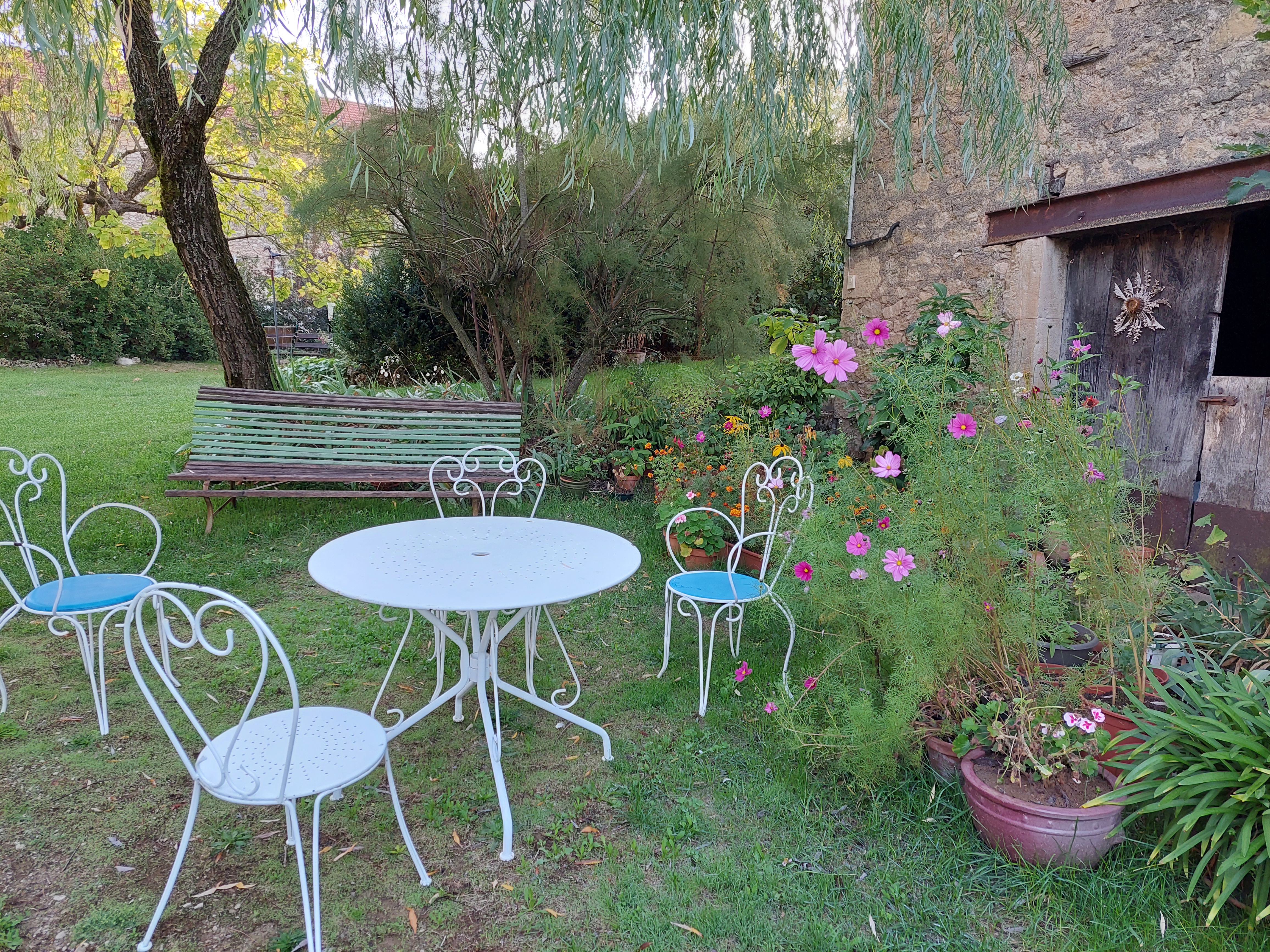 grange magnifique bien aménagé avec fleurs partout Fabienne agréable personne qui prend soin de c'est hotes bonne table repas tres bon produit du jardin salade verte tomates truffade rôti de veaux et tarte maison aux prunes petits déjeunes confiture maison yaourt maison est fougasse maison nous avons passer un bon week-end