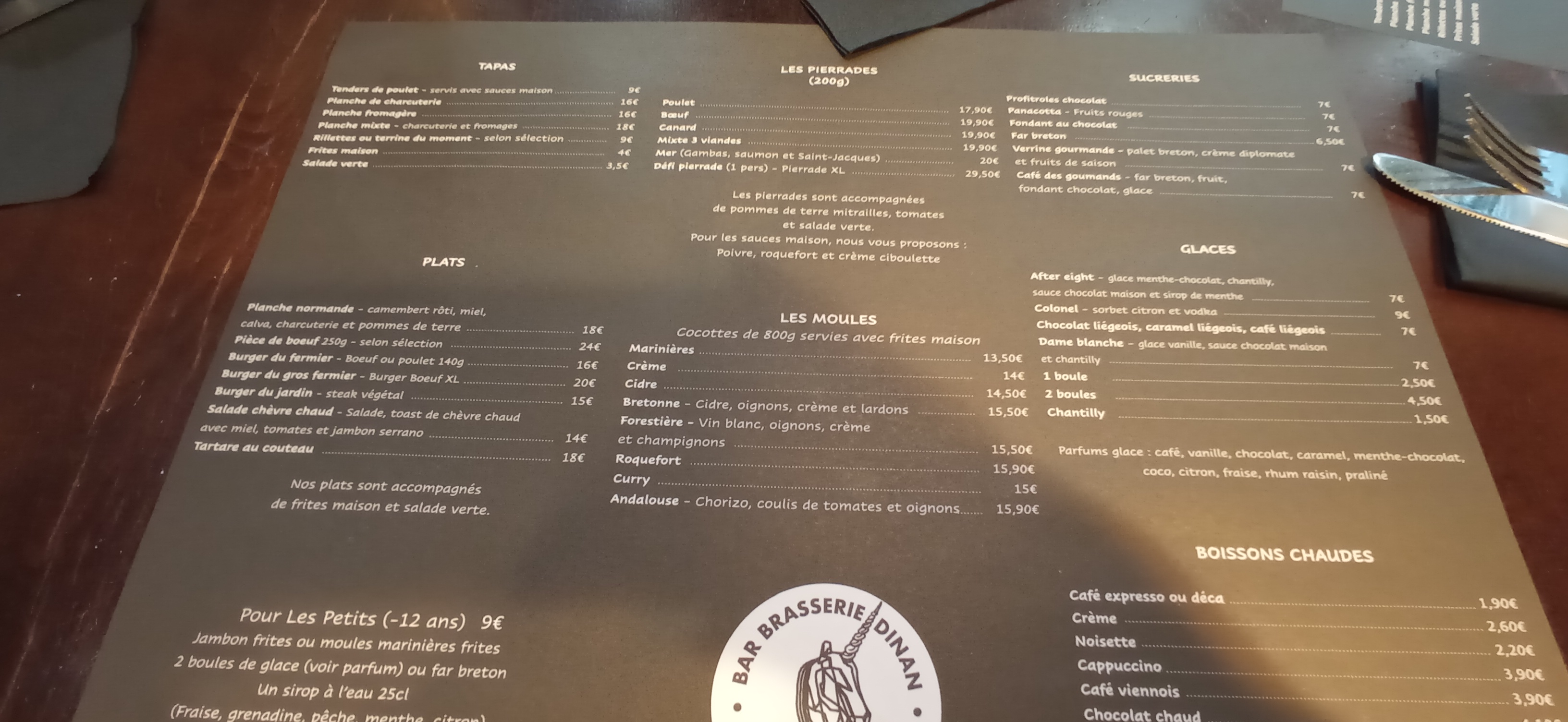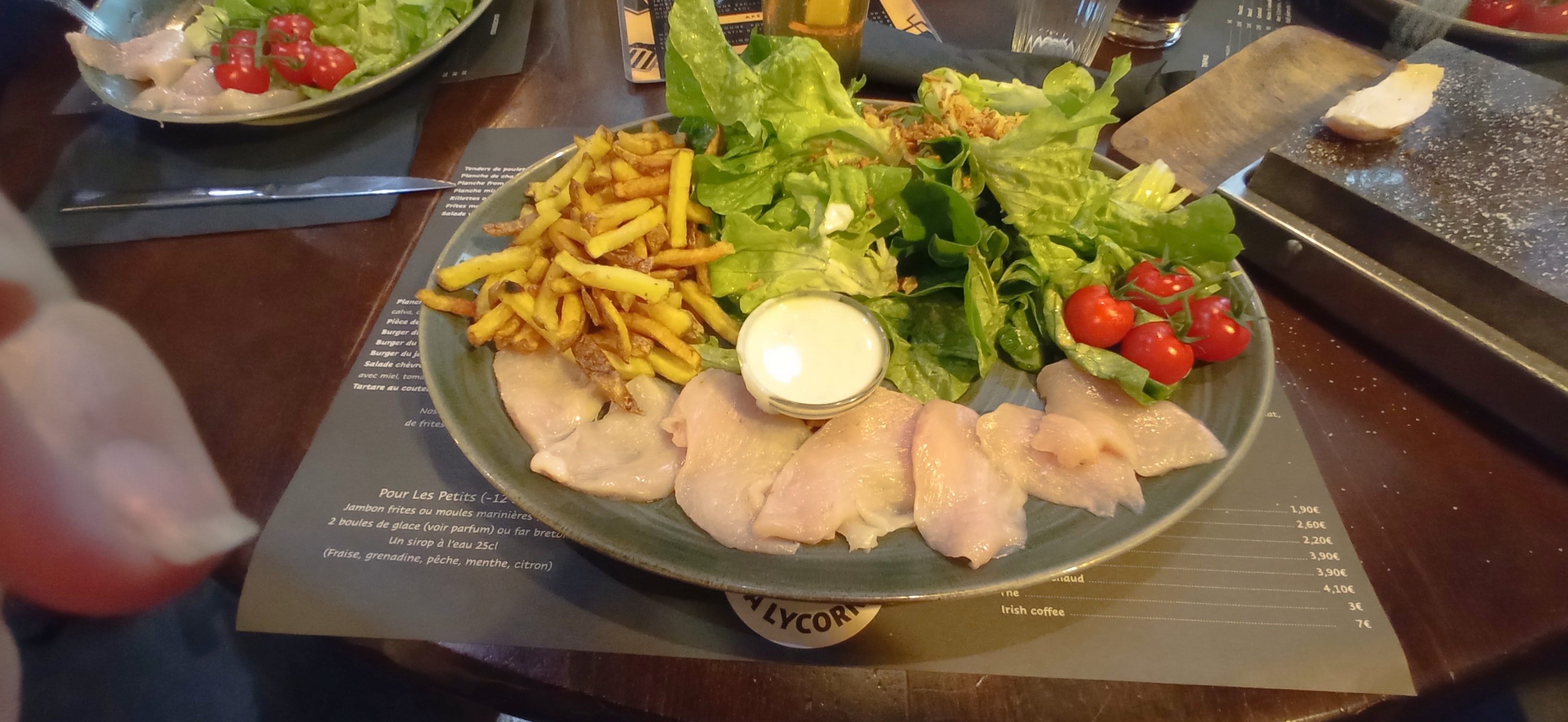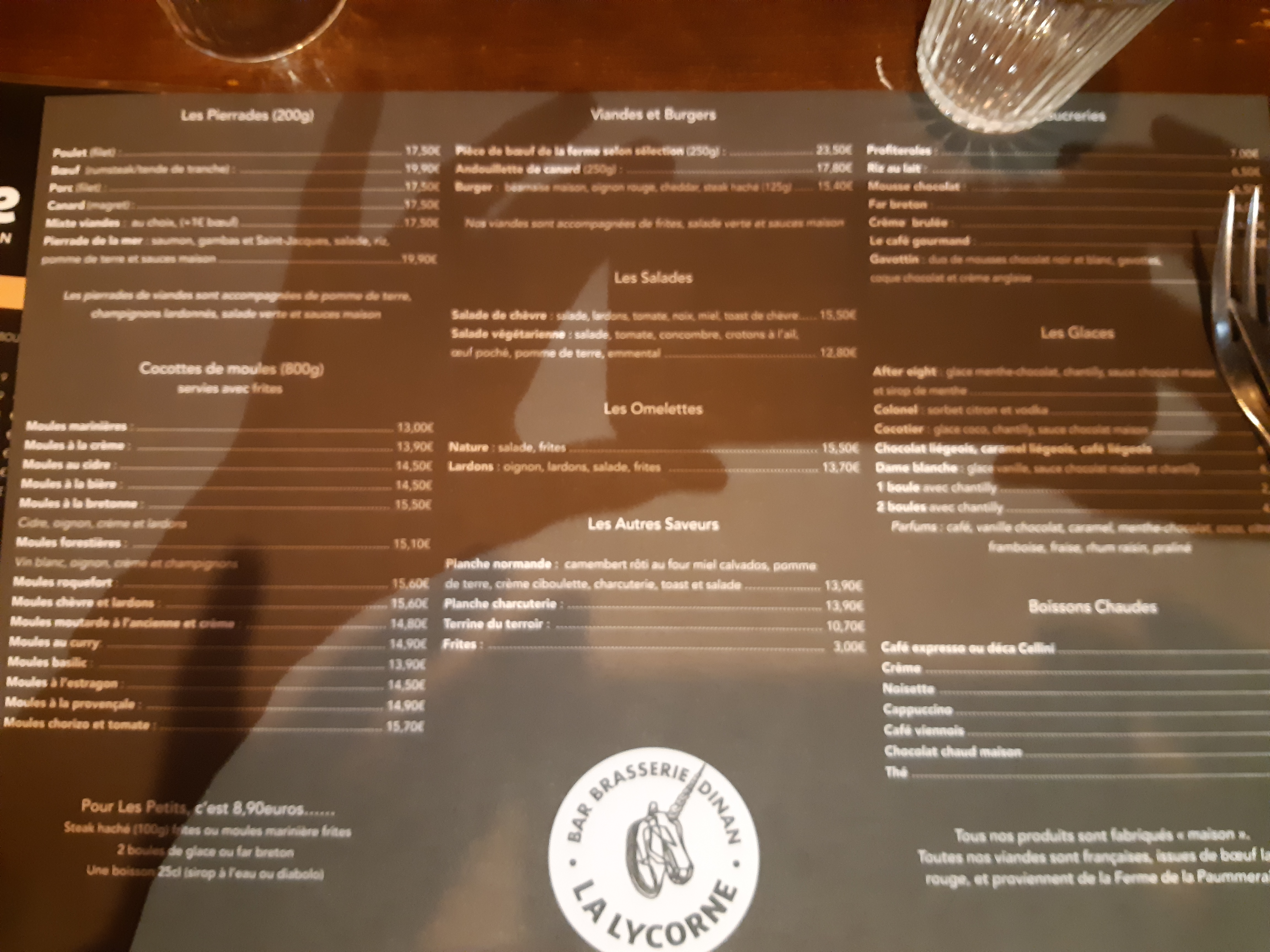 Tout ce que moi et ma famille avons commandé était au top, planche de charcuterie très bien garnie, tenders maison excellent, mon père a dégommer ses moules roquefort sans un mot, la planche normande excellente aussi, le restaurant est assez calme et petit mais je recommande à 100% si vous ne savez pas où aller manger à Dinan !