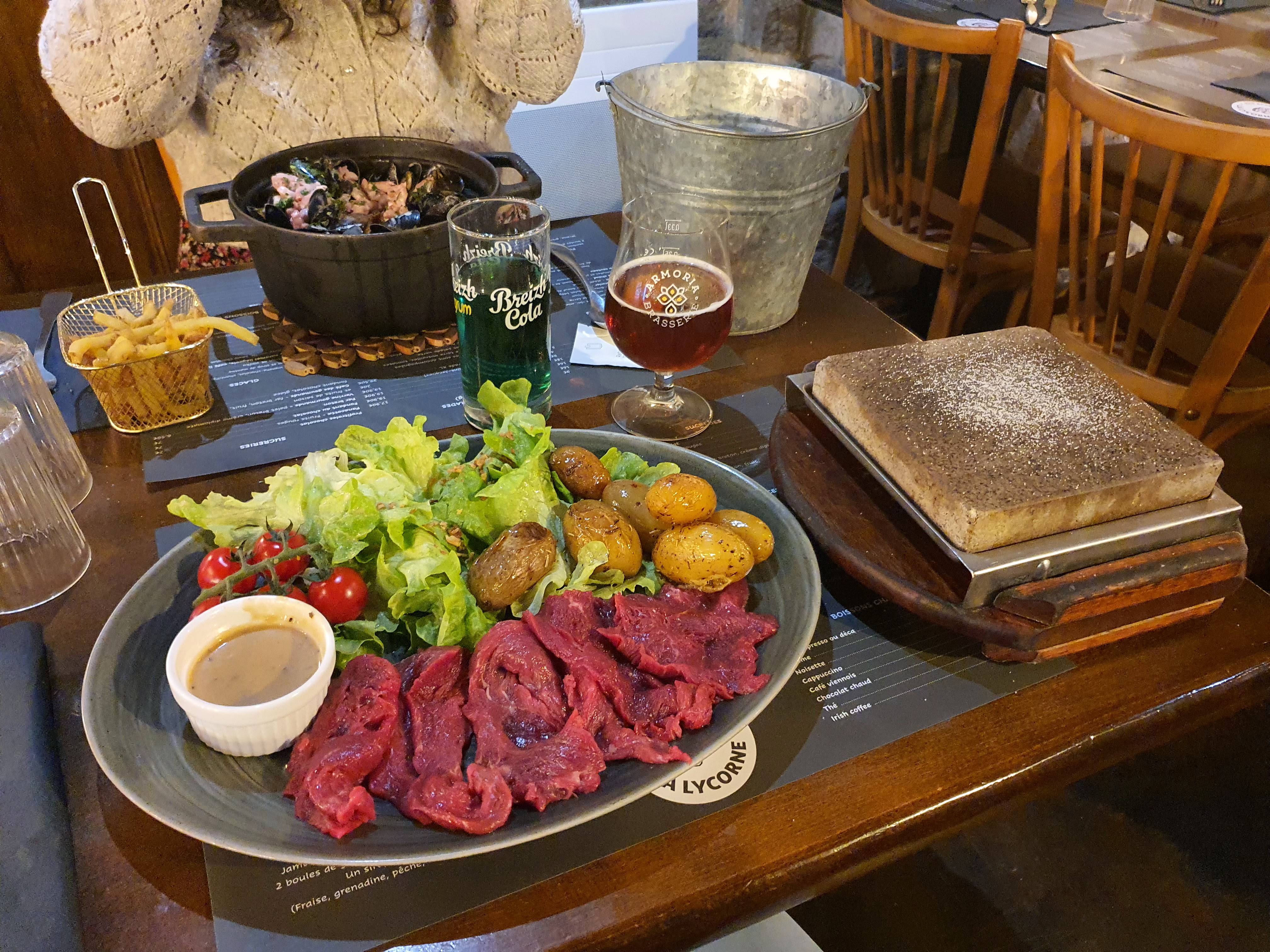 Un restaurant dans une ambiance symphatique quoique un peu bruyant. Les moules frites sont bonnes, les portions copieuses. J'ai choisi une pierrade, dommage que la viande crue soit dressée avec la garniture et salade dans une même assiette, en cours de cuisson la viande crue et cuite se côtoient.