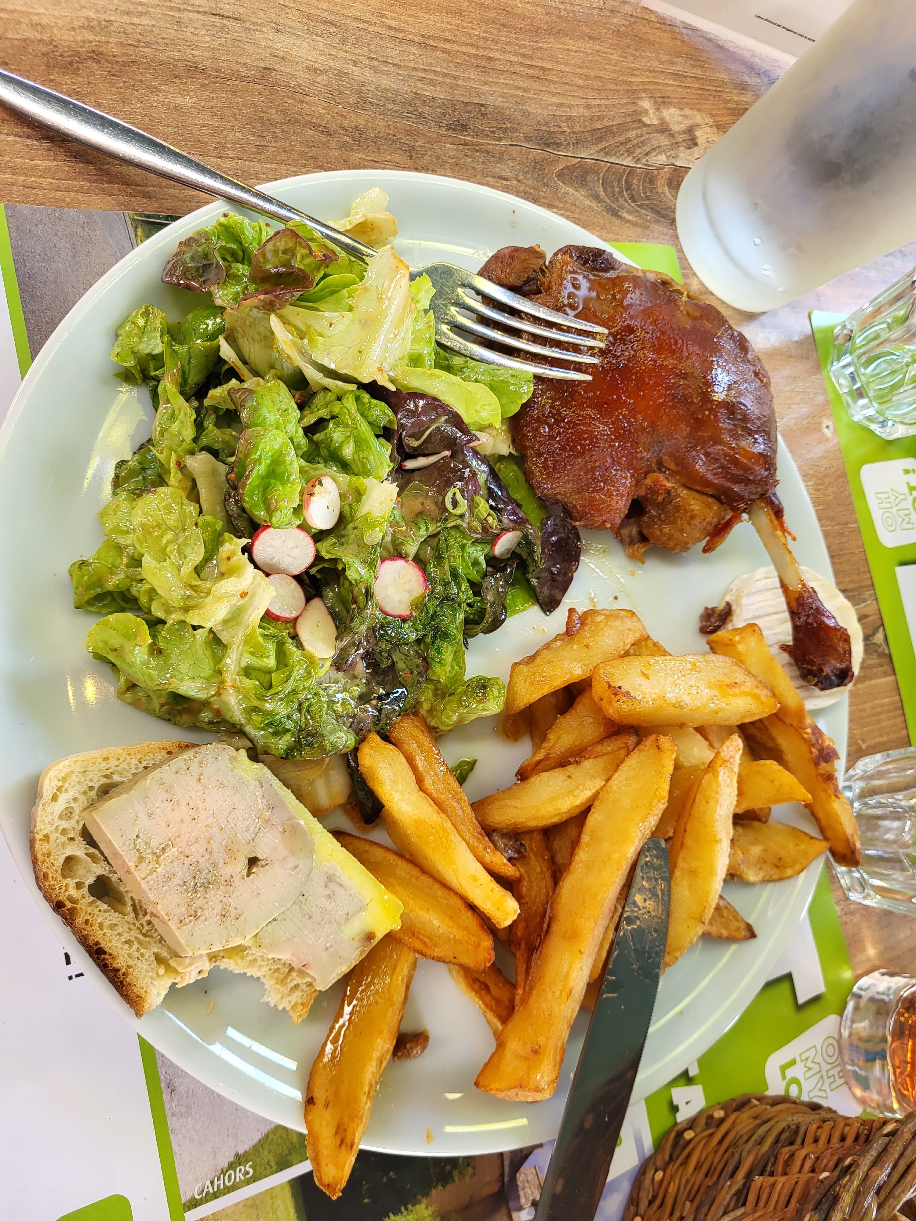 Nous avons été déçus par la qualité des salades (La Monnaie & La Lotoise) qui nous ont été servies ce midi, jour de fête sur Figeac. La salade La Monnaie est servie avec une tranche de foie gras, une petite cuisse de canard confite beaucoup trop cuite, un cabécou et frites + salade en accompagnement. A 19€, on aurait espéré autre chose que de l'assemblage. La Lotoise est servie avec une tranche de foie gras, quelques morceaux de gésiers , de magret séché, de charcuterie + salade en accompagnement. Les noix étaient absentes. A 15€ ,on aurait espéré un plat plus copieux .