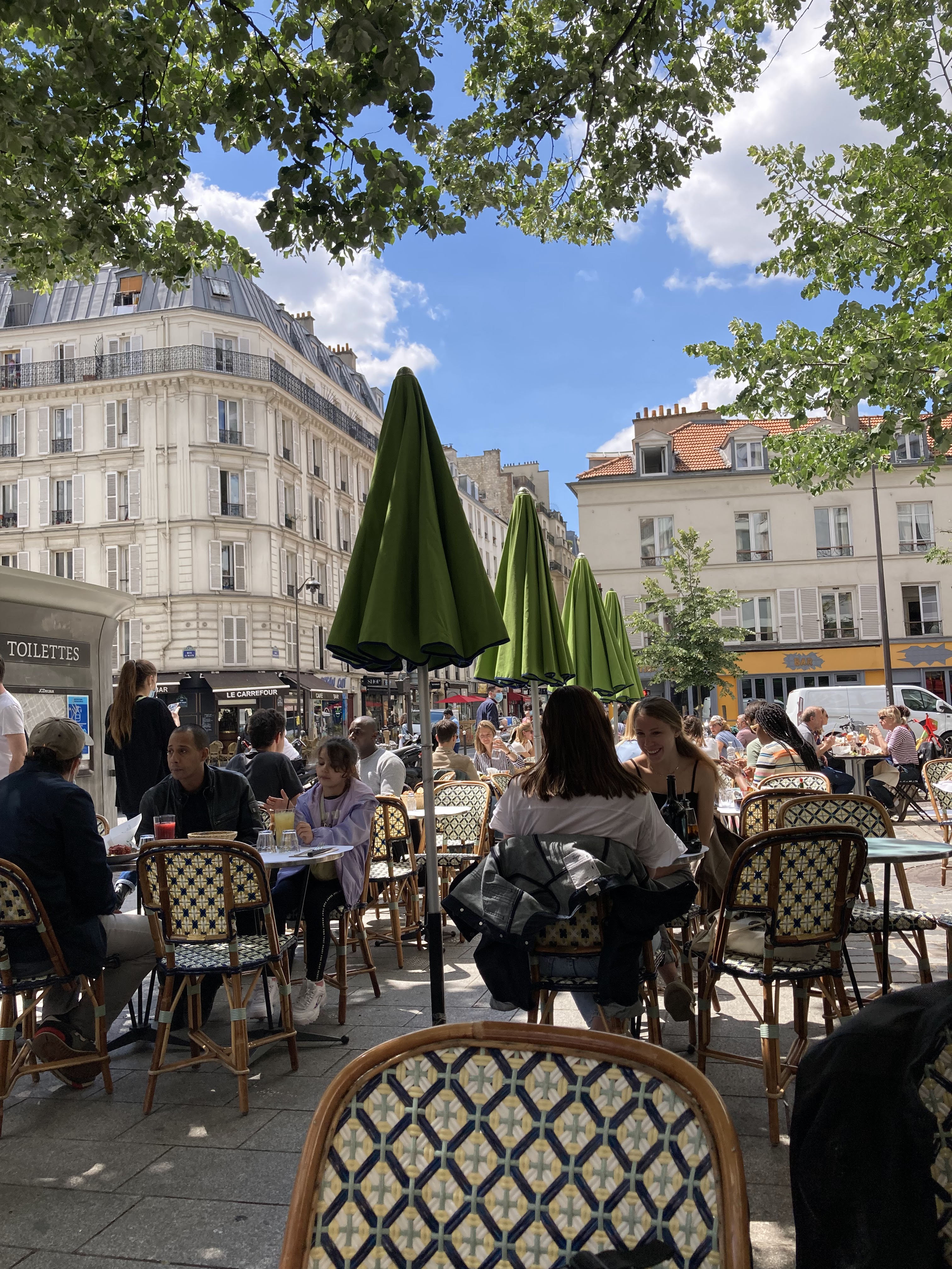 Très jolie place rue Oberkampf qui donne envie de s'asseoir pour manger et/ou boire un verre. Le problème, le prix des consommations (5€ le Ricard, 9,90€ la pinte d’IPA…) Étant très heureux de retrouver les terrasses, je me suis fait un petit plaisir en prenant un « gin tonic » (11€ le verre, à la limite pour un bon gin pourquoi pas) et surprise quand le verre est arrivé, j’ai eu le droit d’avoir un « verre » de tonic sépare de mon verre de gin qui n’avait plus aucune bulle (sûrement une bouteille de tonic ouverte quelques jours auparavant). A 11€ le verre, ça la fou mal quand même quand on sait que sur un gin tonic, le tonic c’est 50% du cocktail… J’ai donc fait remarquer au serveur (quand il est venu prendre notre commande pour le verre d’après) que le tonic n’avait aucune bulle, sa réponse fut « ah, je vais le dire » ! Merci monsieur pour votre réponse cela m’a fait une belle jambe. Peut être qu’un petit « désolé » aurait été un peu plus apprécié. J’avais déjà été déçu avant le covid a cette même place verte, je leur ai laissé une chance, maintenant c’est terminé ! Je ne recommande malheureusement pas.