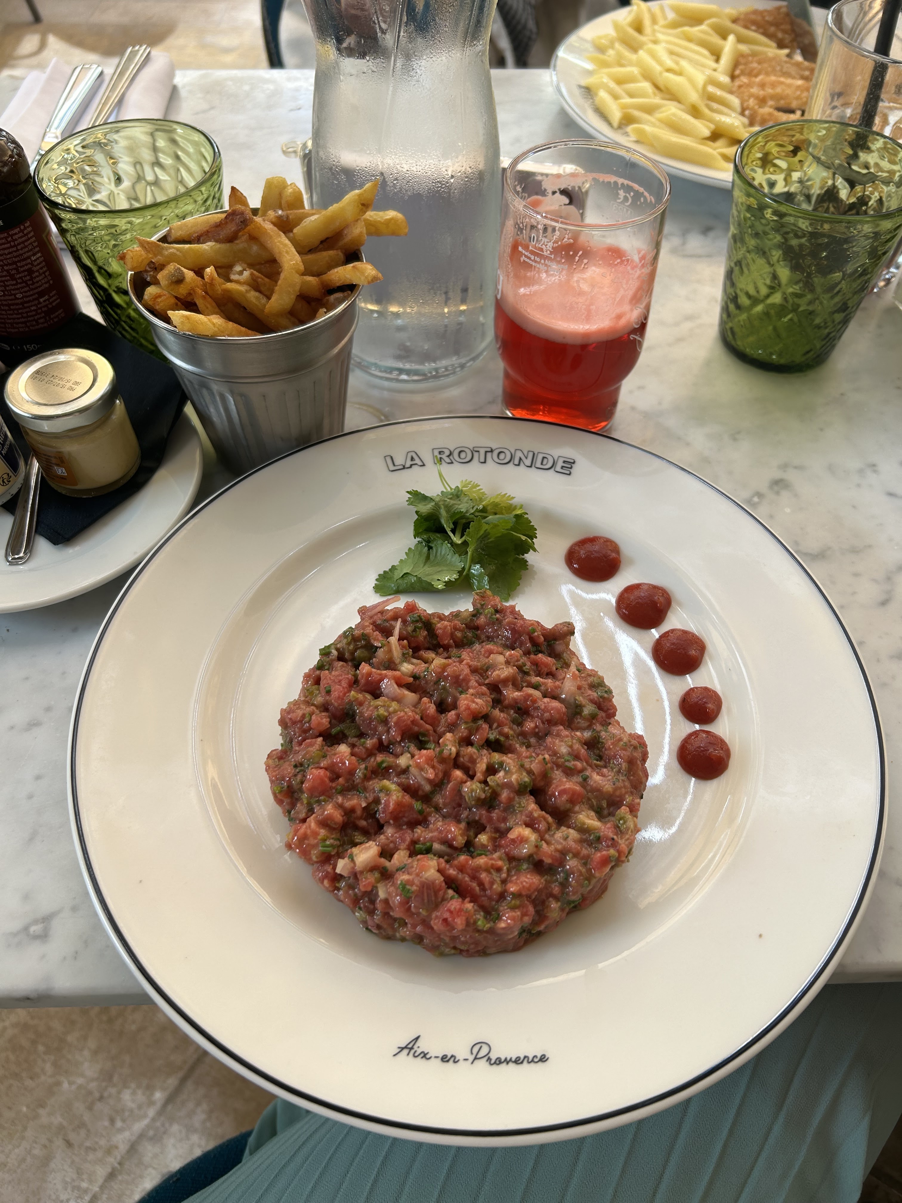 Si on aime le côté brasserie placée à un endroit magique d'Aix, si on aime croiser des princesses montrant leur gentil chien de race, si on aime échanger avec un serveur sympathique et disponible, et si on aime un bon plat, on se place en terrasse de La Rotonde 😉