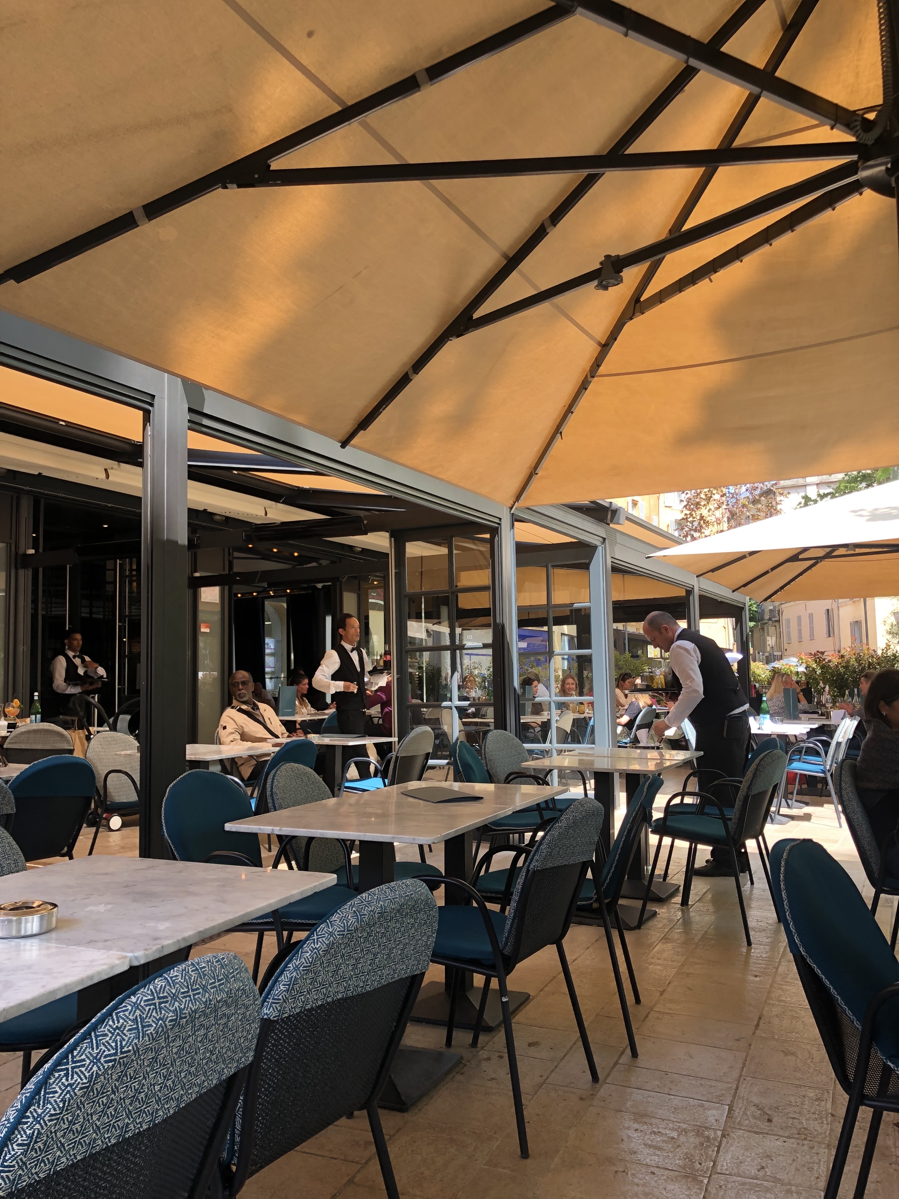 De sortie sur Aix entre Amis, nous prenons 2 btes de cassis soit 80€ d’apéro! Normal pour un cassis blanc! mais un de mes amis renverse son verre vide qui casse sur la table, malheureusement ça arrive parfois en expliquant une anecdote avec des gestes brusques! Le serveur ramasse le verre au sol et nous lui demandons gentiment de mettre un coup d’éponge sur la table remplit de petits morceaux de verre et là sa réponse nous laisse sans voix! NON IL Y A TROP DE CHOSE SUR LA TABLE effectivement il y avait 3 verres vides et 1 téléphone !!! À 52 ans j’ai jamais vu sans ça dans une brasserie de ce standing !! C un de mes amis qui c levé, a débarrassé la table et l’essuyé avec un de ses kleenex. Grande Classe le service !!!!