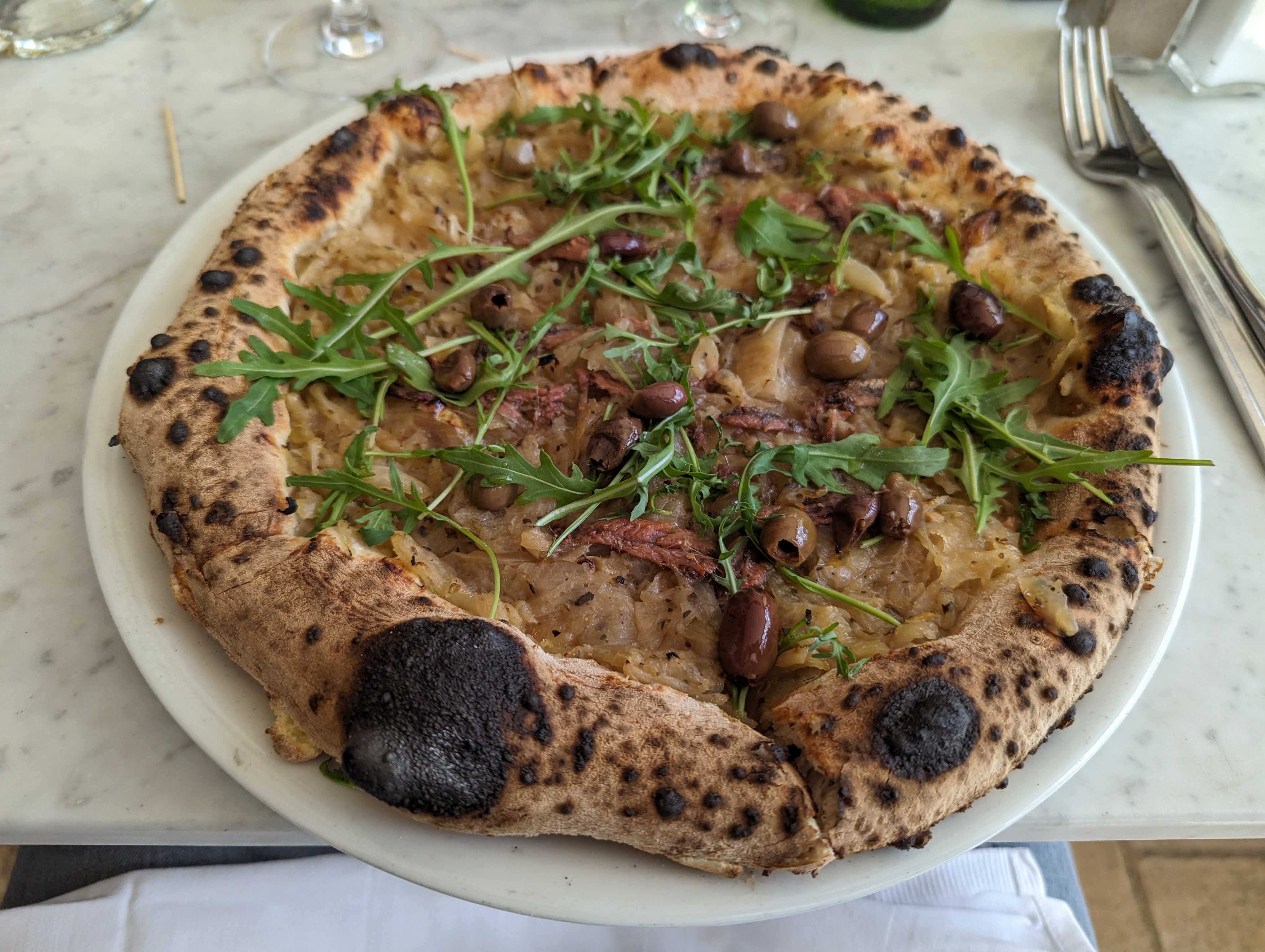 Un service irréprochable. Des plats très bons mais comme un peu partout désormais des prix quand même excessifs. A noter ils acceptent volontiers les chiens.....en photo la pissaladière.