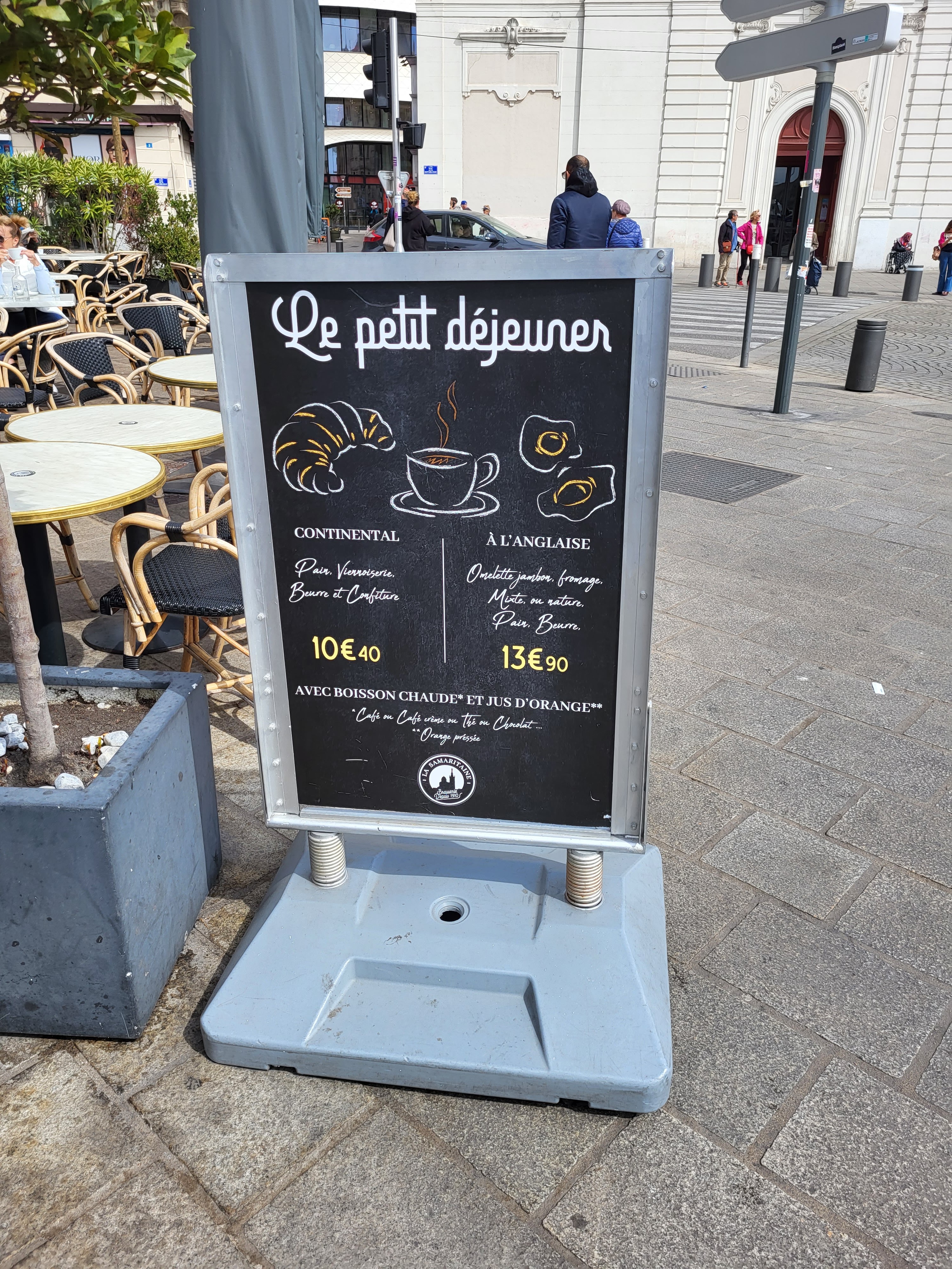 45 minutes d attente ,et je n ai pas été servi . Malgré des rappels ,j ai été au bar à deux reprises pour demander qu on prenne ma commande . La jeune serveuse inexpérimentée m a répondu je ne peux pas faire plus vite. Je suis parti contrarié et mon voisin qui attendait un petit déjeuner m 'a suivi Dommage il faisait beau et j 'avais l habitude de venir prendre un verre quand je suis à Marseille . Adieu Samaritaine !