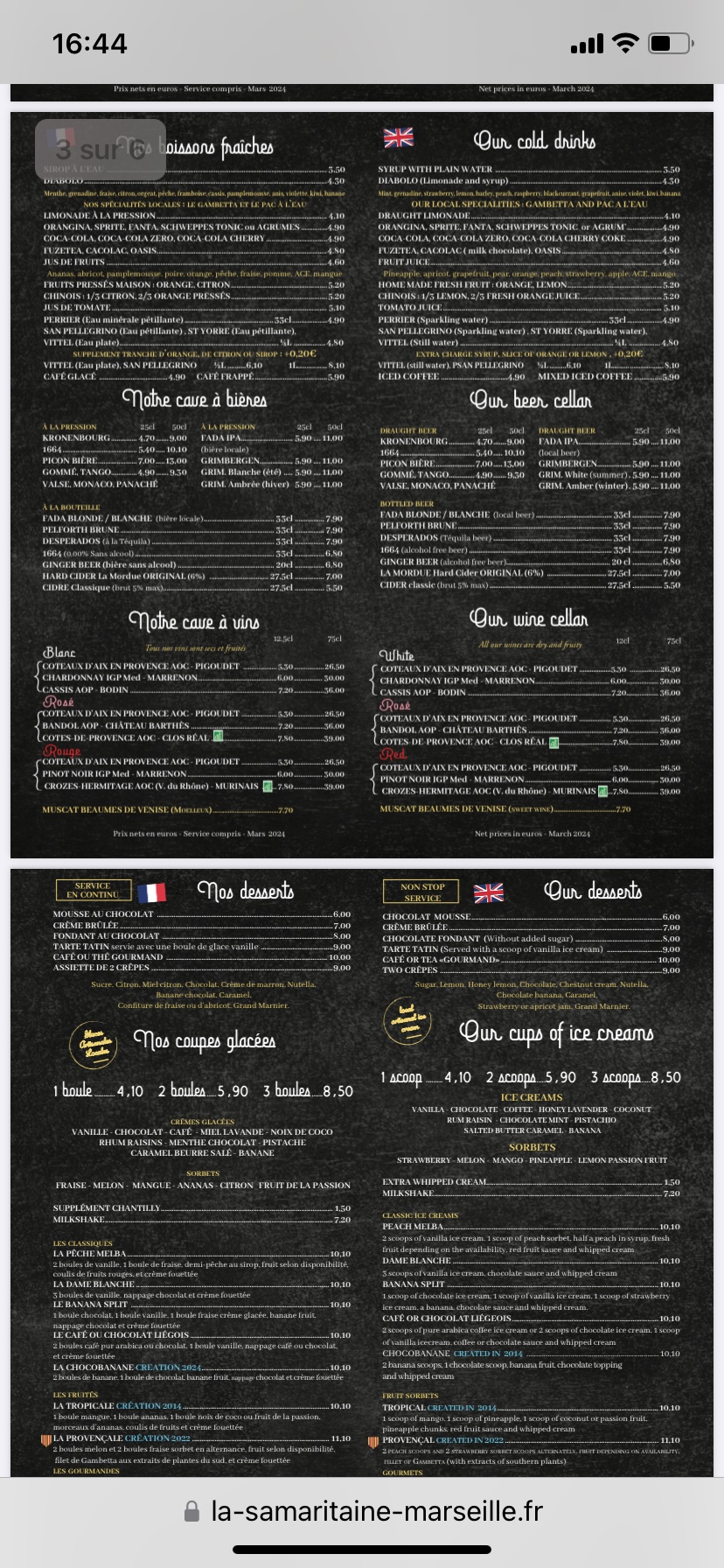 Beaucoup trop cher pour la quantité , un peu plus loin sur le port j ai eu double ration de rosé( meilleur que le vôtre d ailleurs ) pour 0.10 cts de plus que chez vous! Serveurs pas souriants, pas pressés de nous servir et arrêter le service repas à 14h c est abusé, alors que vous pourriez faire du chiffres... mais bon vous manquez pas d argent à 3.90€ le mini rosé et 4€ le demi panaché...