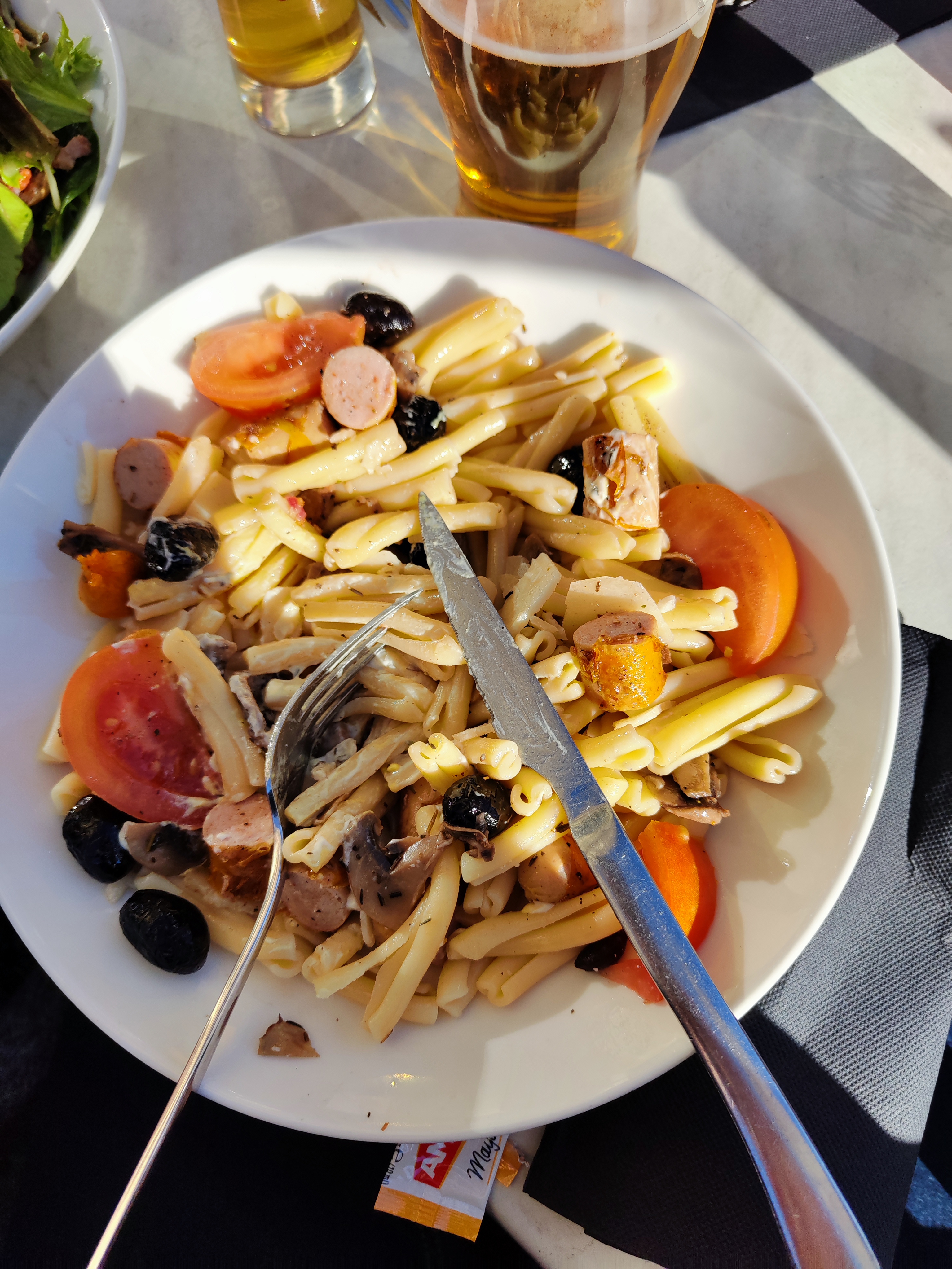 La nourriture était bonne, le service était horrible. Nous avons commandé 2 salades, l'une était très bonne (fromage de chèvre), la seconde était une salade du chef mais s'est avérée être plutôt une salade de pâtes. Le serveur était extrêmement désagréable et peu accueillant. L'atmosphère est agréable et extrêmement bien située.