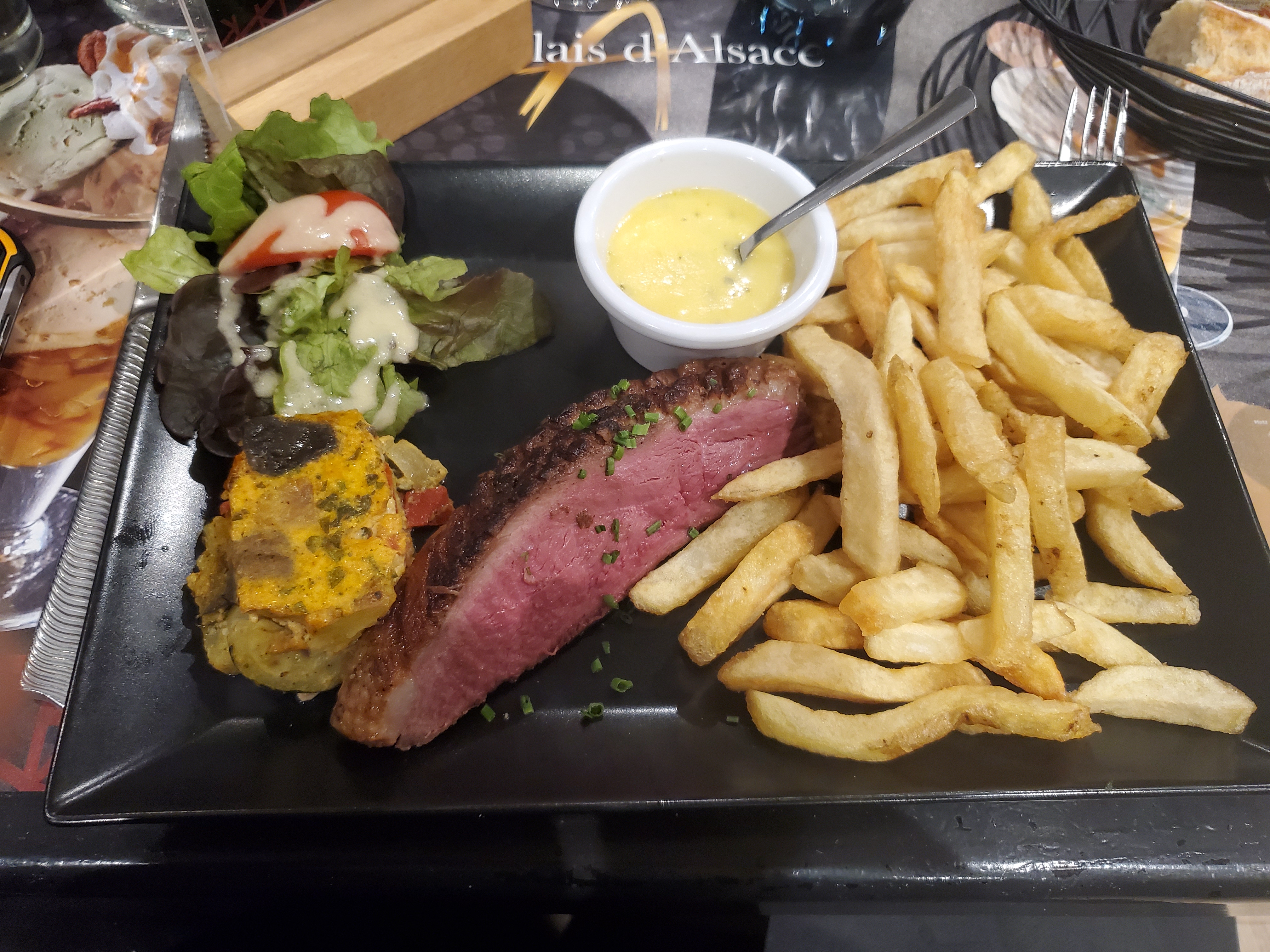 Voilà plus d'un an que je n'étais pas allé manger au relais d'alsace, toujours pas déçu, et même mieux !! frites maison parfaitement cuites, sauce roquefort vraiment faite maison au dernier moment (pas du sachet), viande cuite à la perfection, une tarte tatin généreuse et pas industrielle, idem pour le pain qui arrive tout chaud de la boulangerie .... il y'a du mieux !