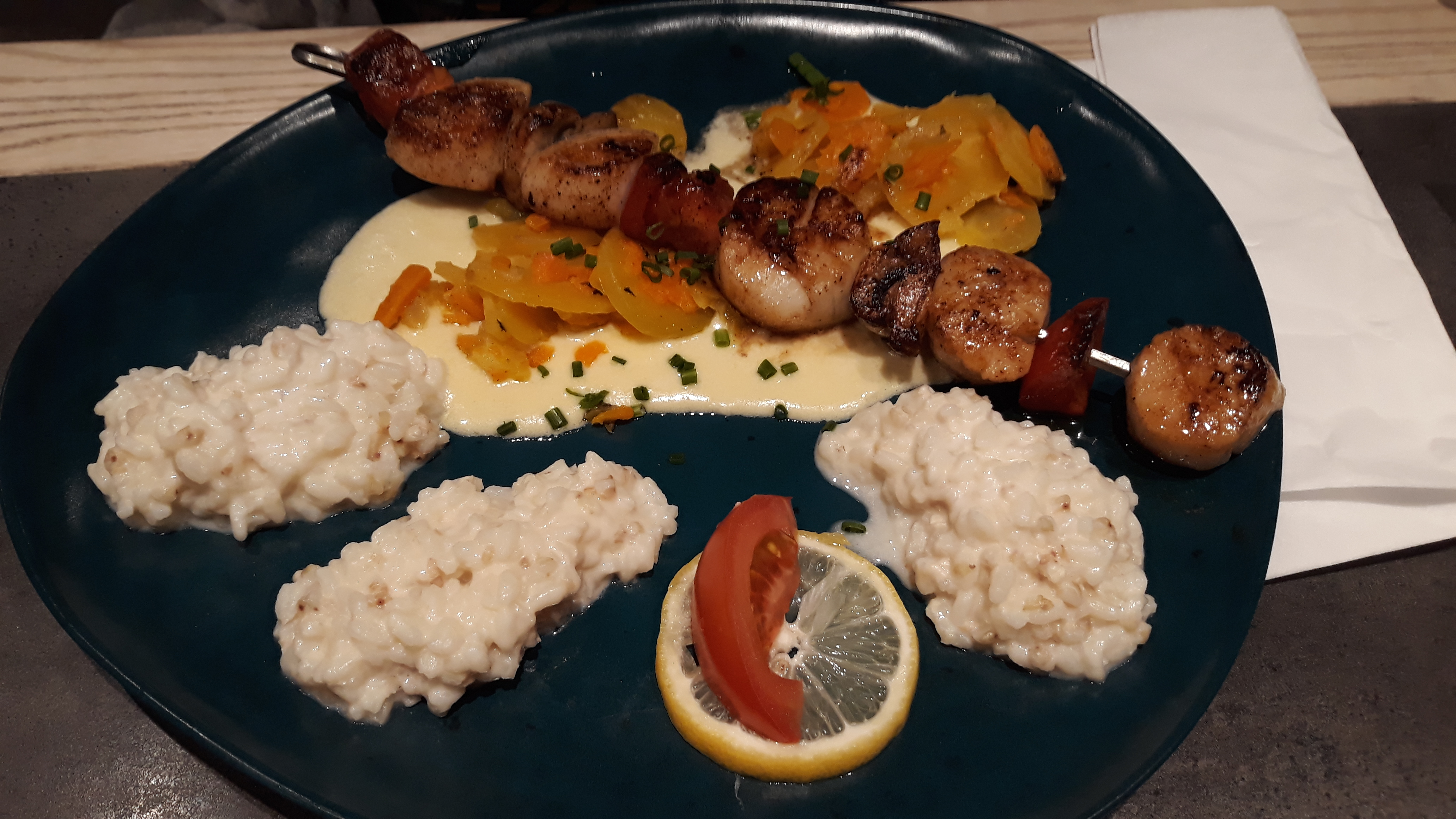 Accueil et service impeccables, la carte est variée pour tous les goûts, ma brochette de coquilles Saint Jacques était tiède, dommage. À recommander, rapport qualité /prix correct