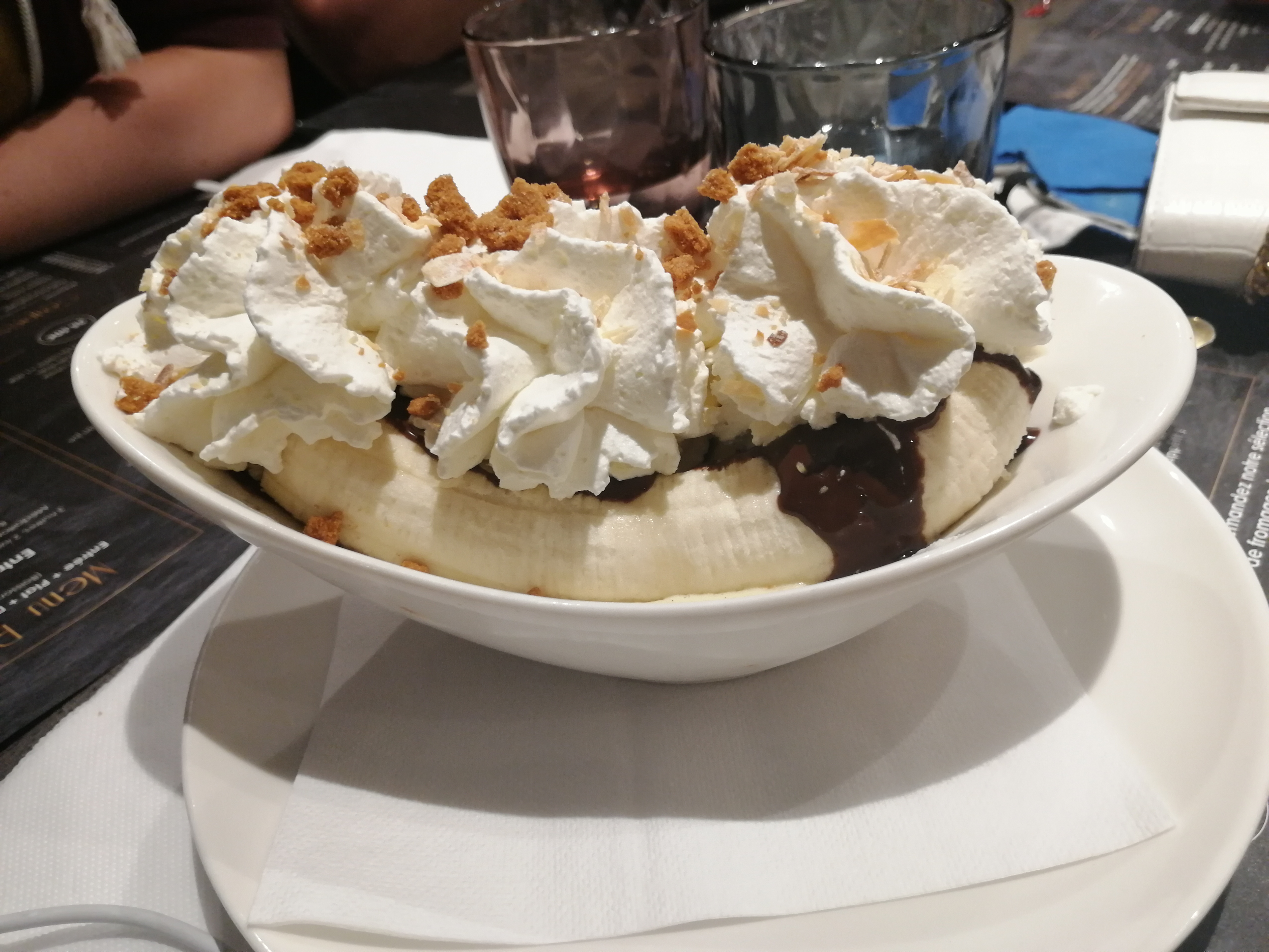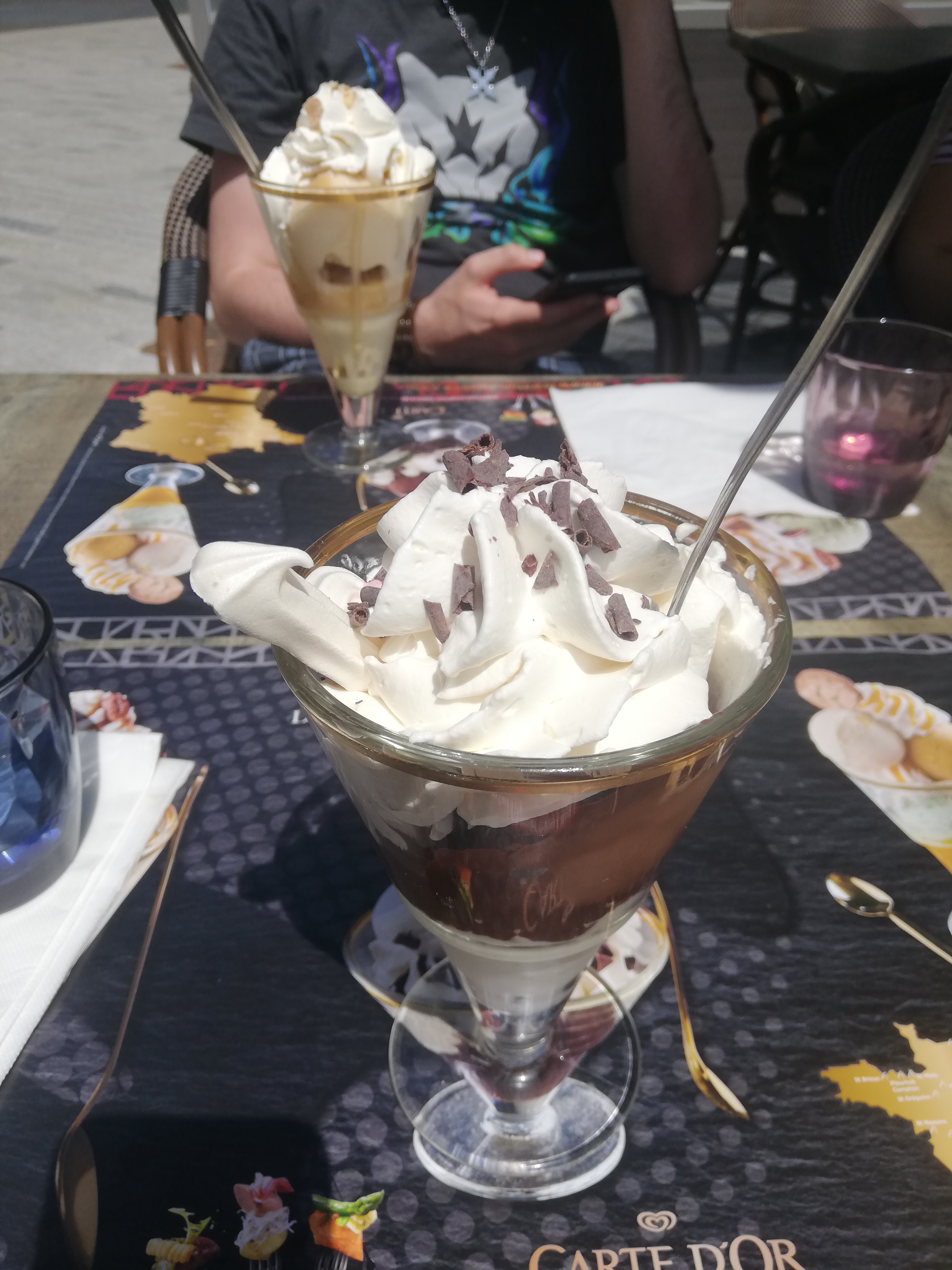 Le personnel était cordial, nous avons demandé une table à l'ombre pour éviter l'insolation, la table à bien été à l'ombre, pas la moitié des personnes autour de cette table, et plus personne une fois le soleil tourné; la table à côté a eu le droit à des chapeaux et ils ont même ajouté un parasol pour eux. Nous avons vu au moins 2 serveurs s'occuper continuellement de la table à côté, nous, nous essayions d'appeler les serveurs des que nous avions besoin de quelque chose.. Niveau plats, ils étaient beaux, très beaux. J'ai choisi de prendre des moules frites à la crème. Les frites sont un délice ! Faites maison et cela se sent. Parlons des moules. Non triées, c'est certains j'ai retrouvé des bigorneaux avec mes moules et au moins une bonne 15aine de mes moules avaient la coque cassée avec des morceaux dans ma moule. Gustativement, dure. Il y a du avoir un soucis de cuisson mais le dosage vin blanc/crème est bon ! Pour le dessert : choco-coco. Voici la réalité des choses: pas de sorbet coco mais plus une crème coco est disposée au fond de la coupe de glace, une grosse boule chocolat noir par dessus, de la chantilly et des coupeaux de chocolat. Esthétiquement, le rendez vous est là, papillonnairement, le chocolat prend une trop grosse place, écrase la coco qui n'est qu'un jus dans le fond de la coupe. Resultat décevant, pour ce prix je m'attendais à beaucoup mieux, si je reviens c'est éventuellement pour goûter les plats alsaciens.