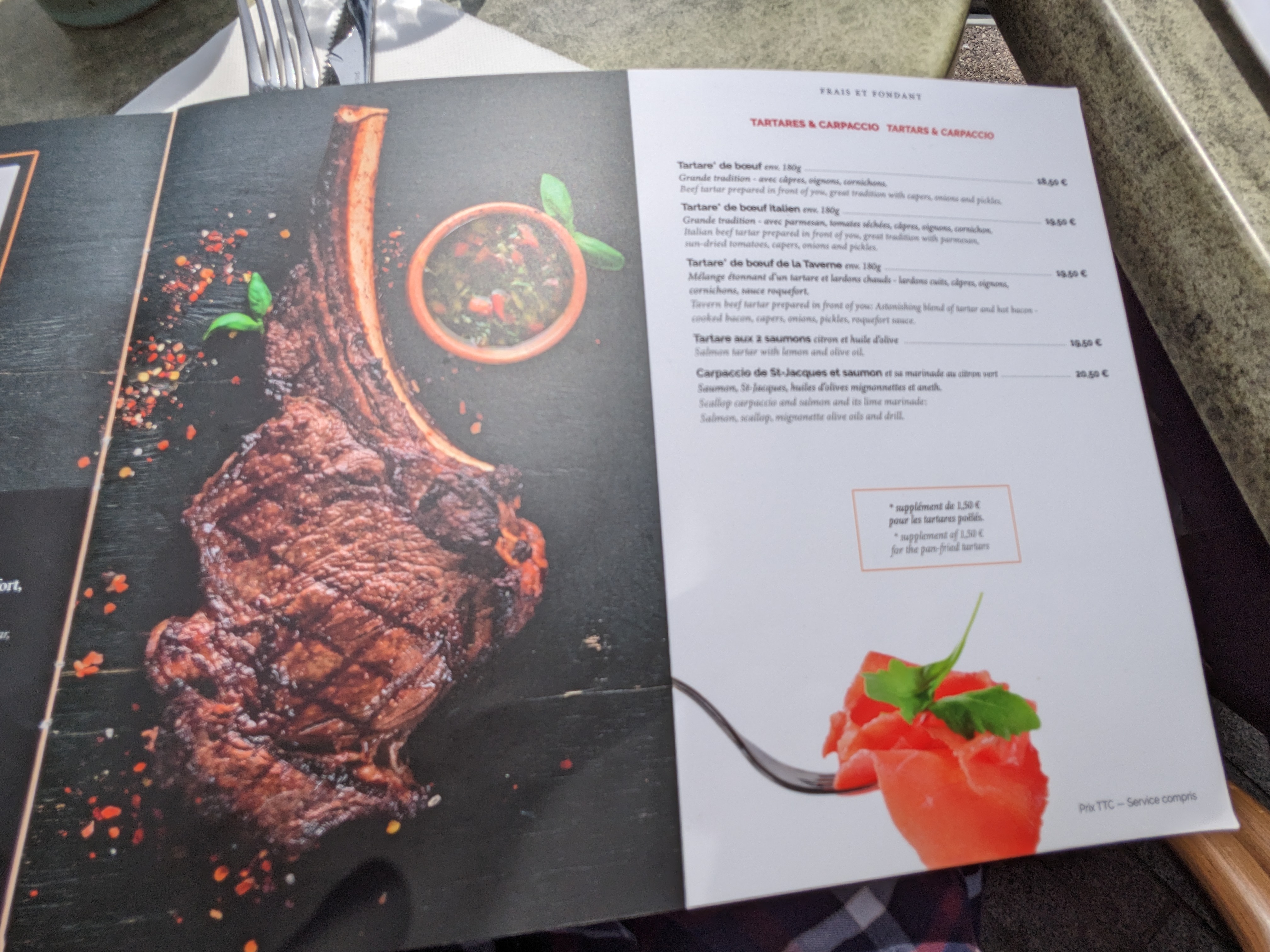Une grosse blague, un scandale de payer autant pour un tartare aussi fade, si on peut appeler ça un tartare (de la vulgaire viande hachée à burger bien grasse) alors que j'attendais une belle pièce de bœuf coupé au couteau... Servit sans pain, car soit disant il y en avait plus (ils en ont mis au four mais ont décidé de servire une autre table derrière nous...). Serveur mou et antipathique (et le masque n'est pas une excuse, on a été servi une autre fois dans un Mcdo de façon bien plus enjouée et sympathique). A éviter à tout prix, vraiment une soirée gâché. Restaurant voulant se la jouer gastro, à part les prix il n'a rien de gastro...