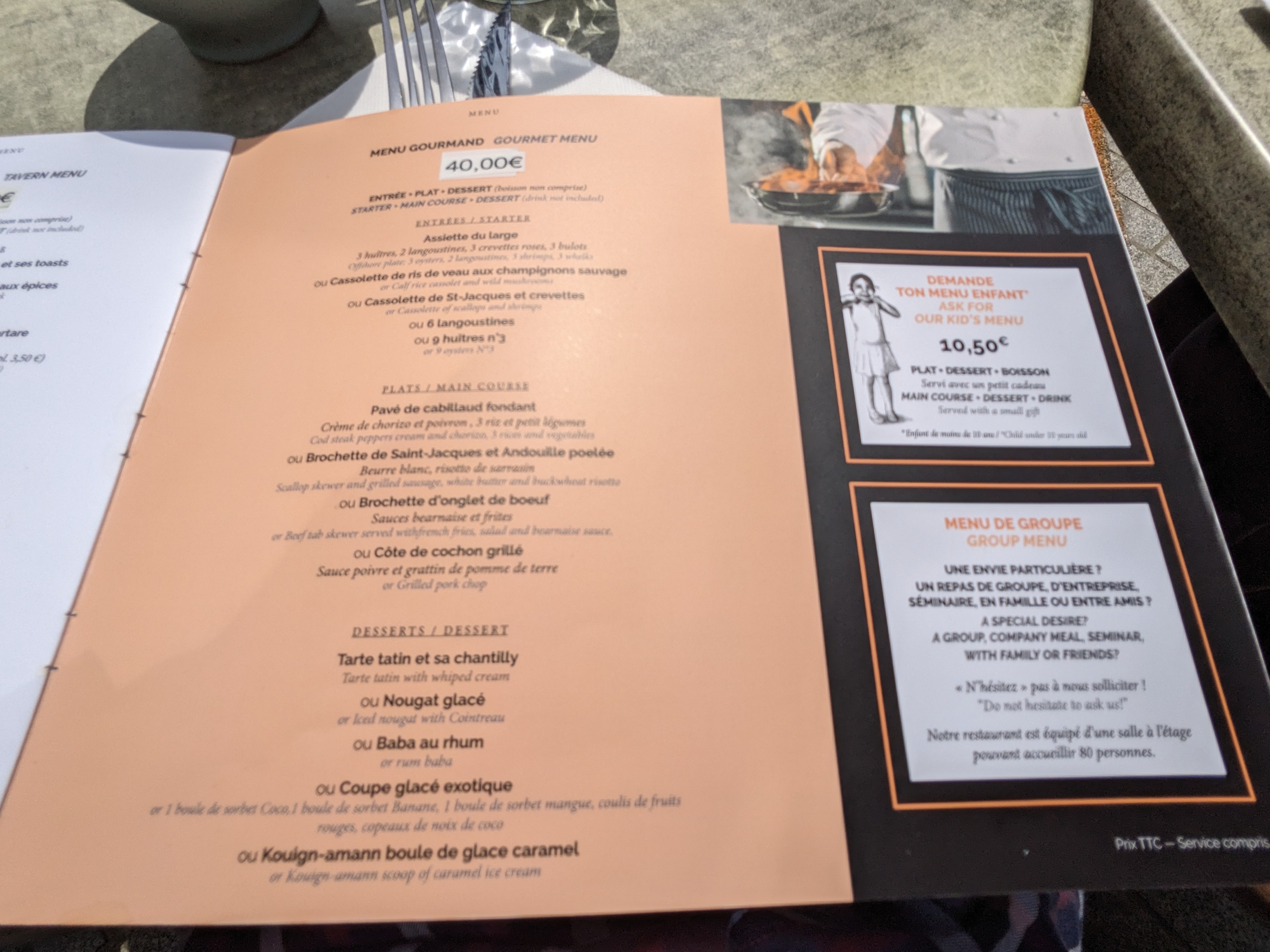 Pour une box Bonne table de Bretagne offerte à 60€ pour 2, on nous a proposé le menu taverne affiché à 24€80. Payé la bouteille de rosé 26€80. Pas mal le bénéfice À ce prix passer son chemin.