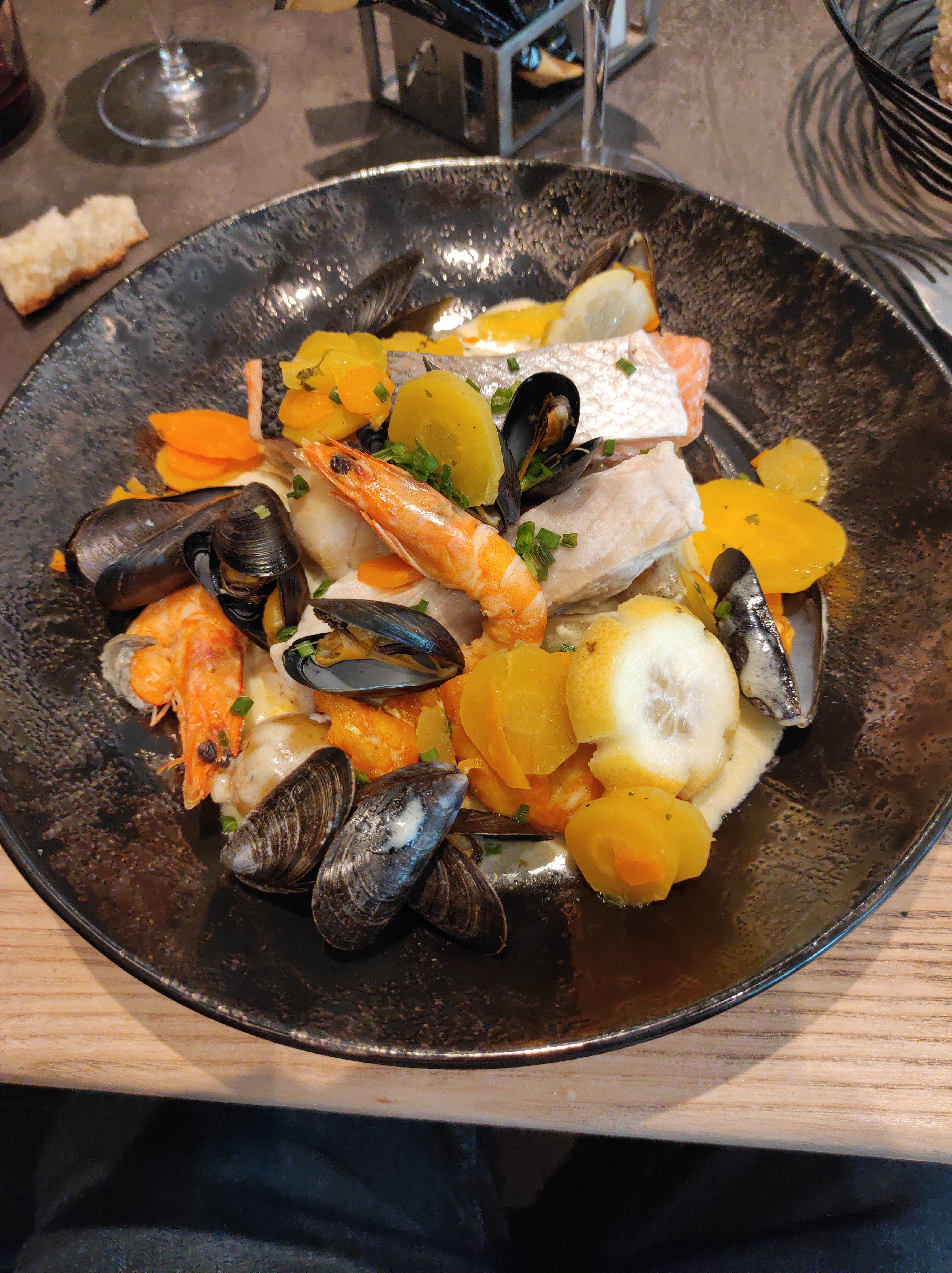 Décevant. 2 bulots vides sur 7 en entrée. Moules nombreuses mais très petites. Goût correct sans plus. Frites sèches et trop grillées. Aile de raie plutôt sèche qui manquait de fondant. Riz au lait qui s'apparentait à une sorte de pâte gluante plutôt écoeurante à mon goût. Le vrai petit plaisir du repas fut la purée de pomme de terres. Excellente !