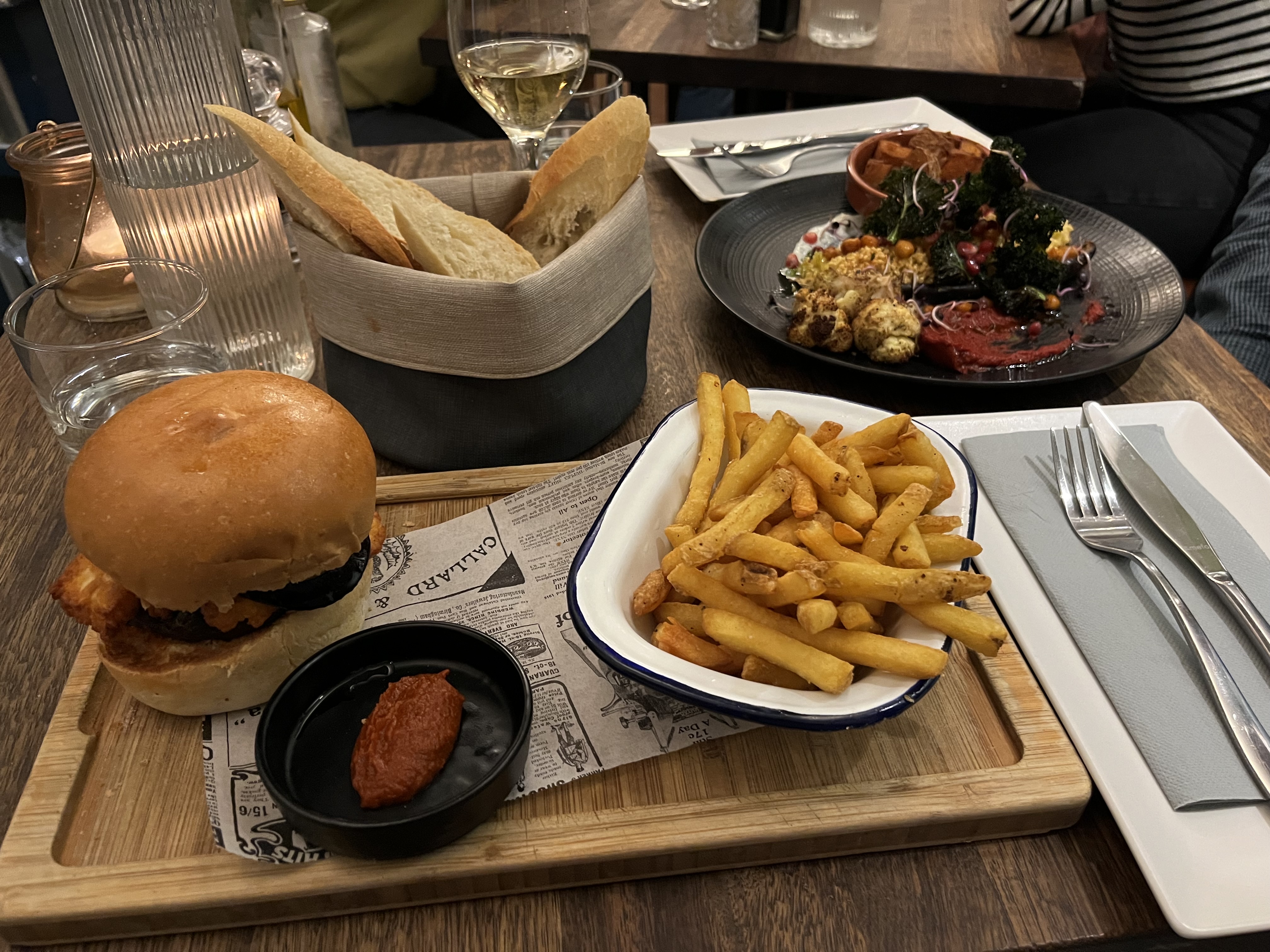 Repas très savoureux. Bangers'n'mash avec sauce à l'oignon pour moi, burger végétarien pour ma femme.