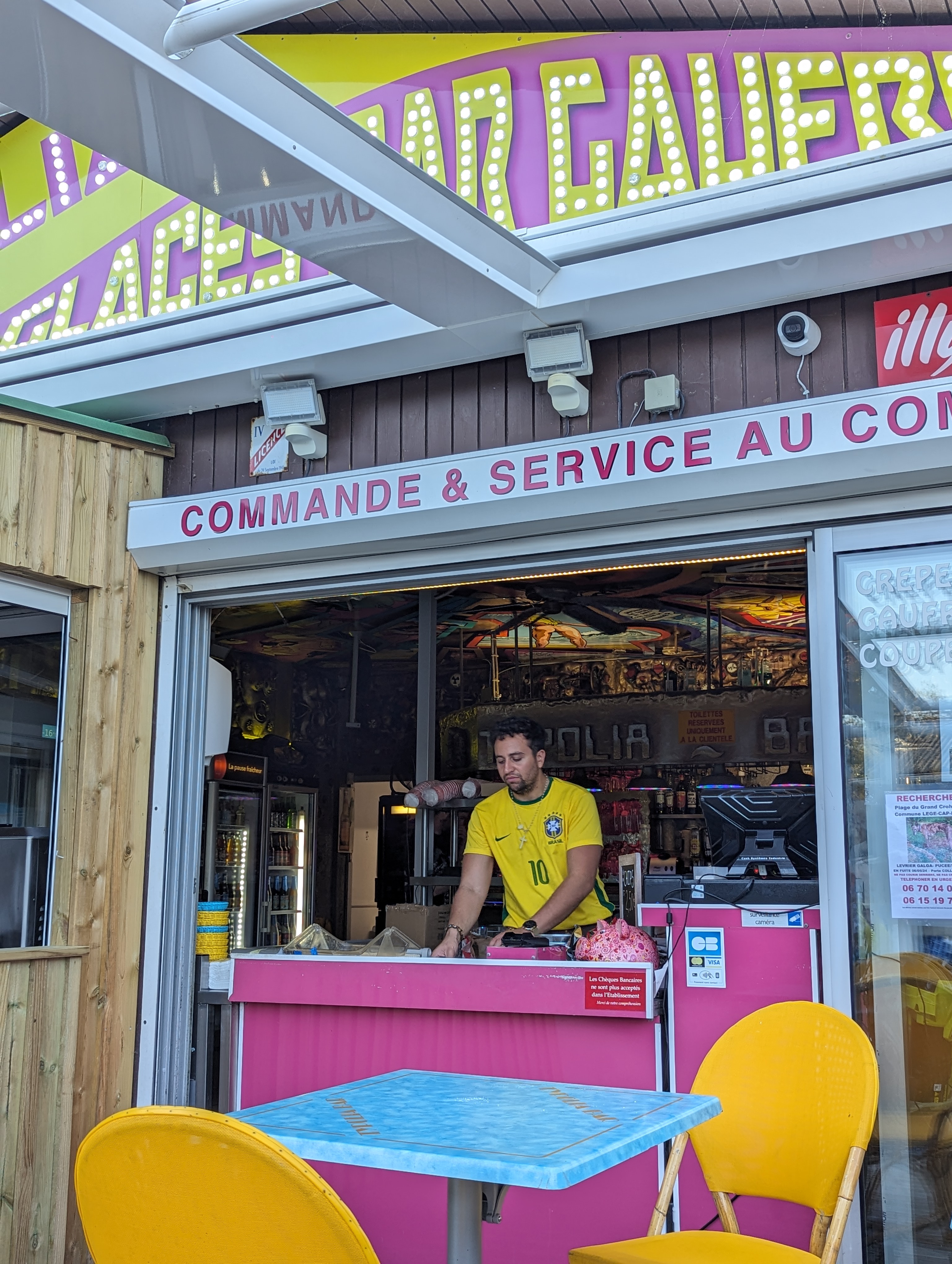 Décor très sympa et décors cyberpunk. On commande et on paie au comptoir, ce qui réduit les arnaques , même si on vous sert . Sinon, ca reste du buvette de plage, donc tout sort du congélateur… (sauf les gaufres !), mais 24€ le plat du jour…