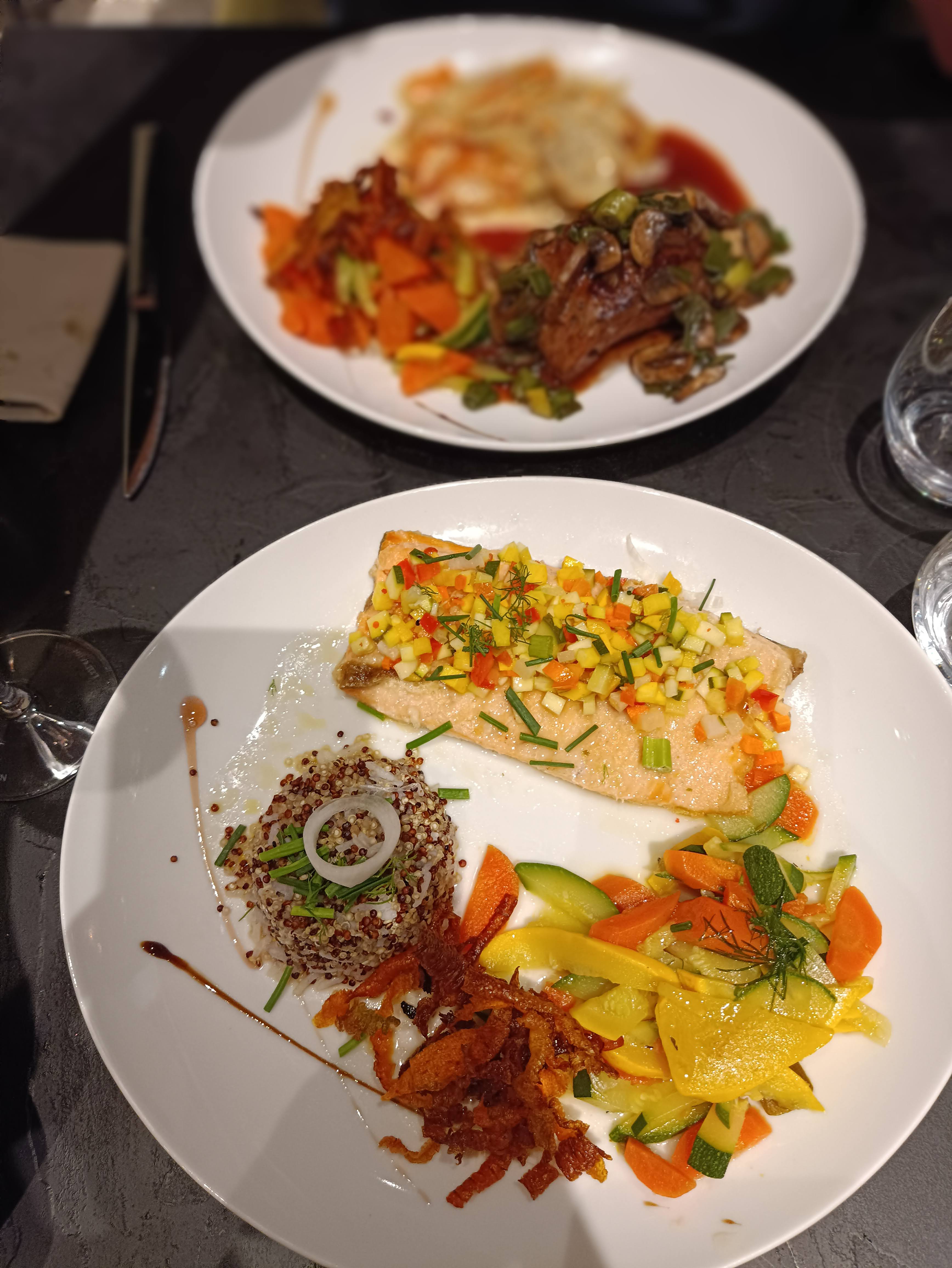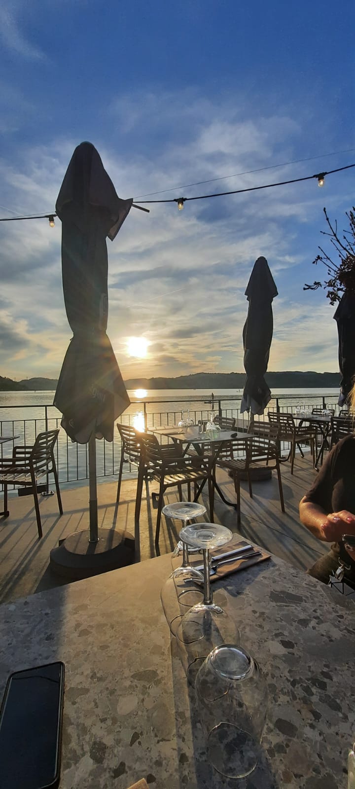 La terrasse surplombe le bord de l'eau. En soirée, les couleurs du coucher du soleil sont romantiques à souhait.. Le repas est un régal pour les papilles, et en grande consistance (trop pour moi). On y retournera en tout cas... Rien que l'entrée me suffit 🤣