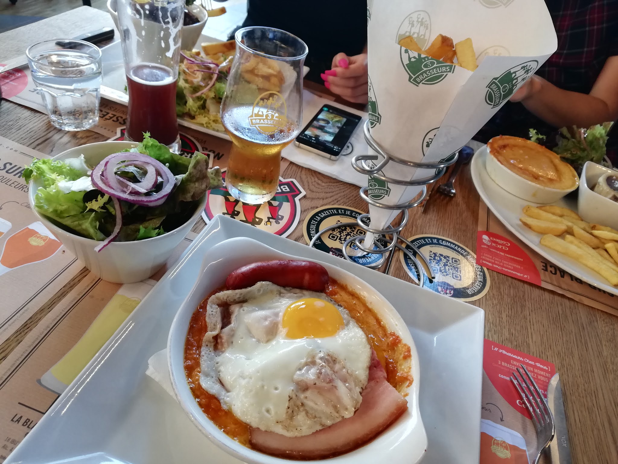 Nous sommes habitués de la chaîne 3 brasseurs et nous n avions jamais été déçu mais il faut un début à tout. Nous allions dans ce restaurant dans l espoir de retrouver les plats typiques de la chaîne (poutine ou autres) qu'elle ne fut pas notre surprise : commander les boissons au bar, commander les en cas en ligne en scannant un QR code. Heureusement j ai été voir la serveuse en disant que je n allais pas commander x fois et payer a chaque fois pour des tartes flambées. N ayant pas de plat a choisir nous nous sommes rabattu sur les flammes quelle déception sans goûts et caoutchouteuses. Nous avons fait part de notre déception concernant le fait de ne pas retrouver les plats et on nous a répondu que c était volontaire. Bref déception nous serons obligés d aller a Thionville (57) pour avoir un 3 brasseurs digne de ce nom dommage que Vendenheim soit fermé.