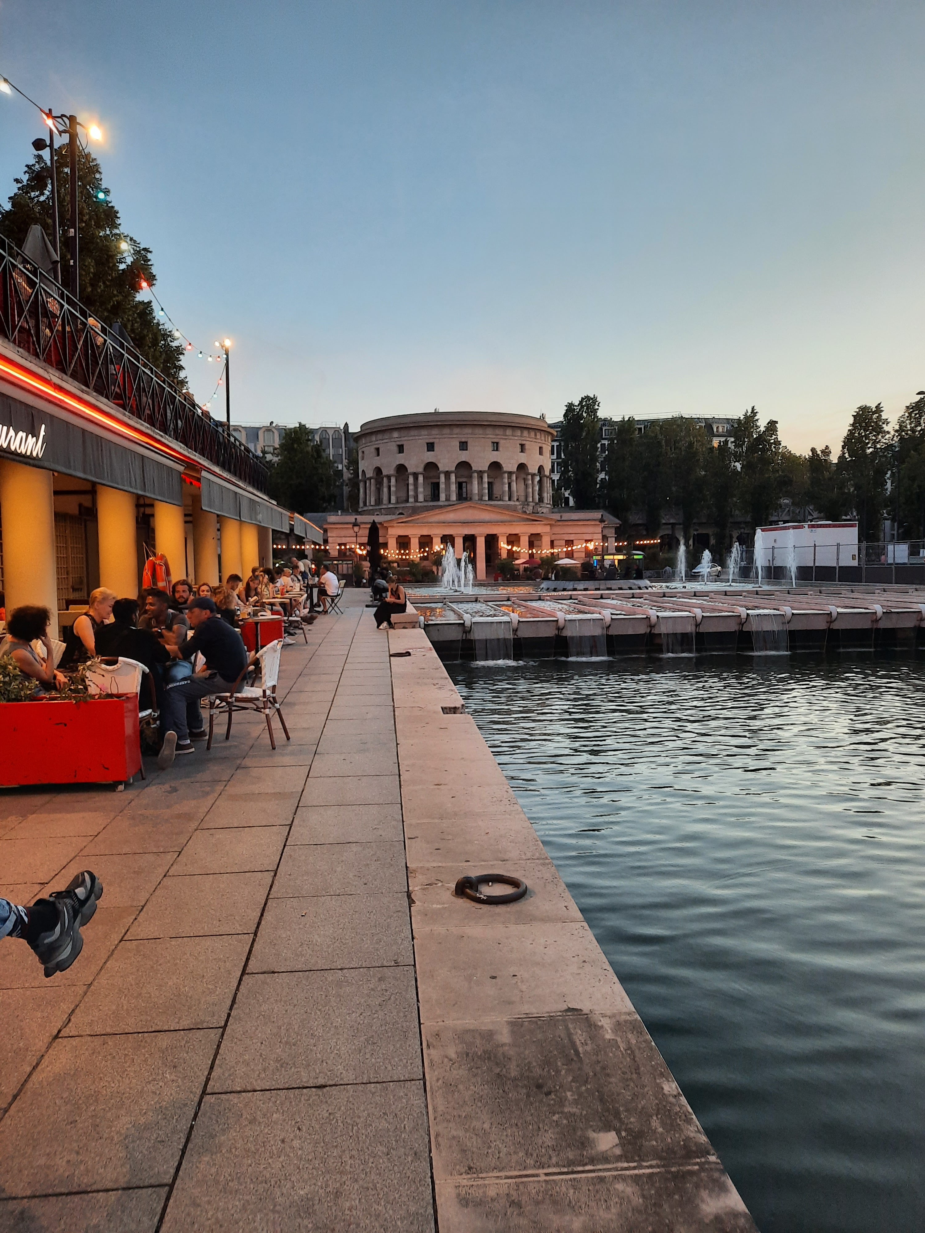 Une des plus belles terrasses de Paris, vue imprenable sur le bassin de la Villette et la rotonde Ledoux. Happy hour sympathique