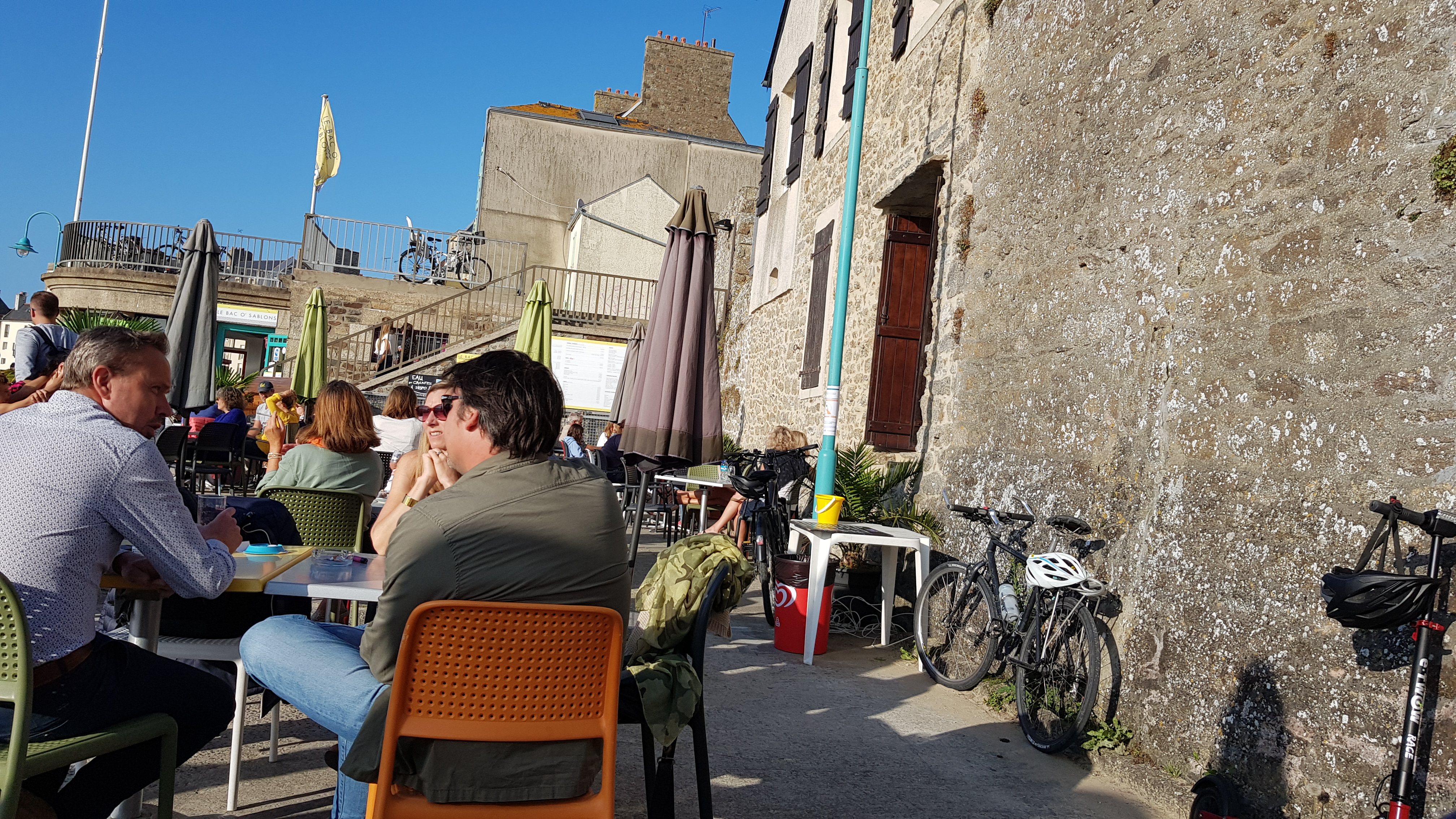 Sympathique terrasse ensoleillée, au calme de la plage des bas sablons : idéal pour les enfants car le restaurateur a eu la géniale idée de mettre à disposition pleins de jouets de plage (pelles, seaux, râteaux et brouettes en tout genre !) nos chères têtes blondes n’ont plus qu’à en profiter pendant l’apéro des parents :-)
