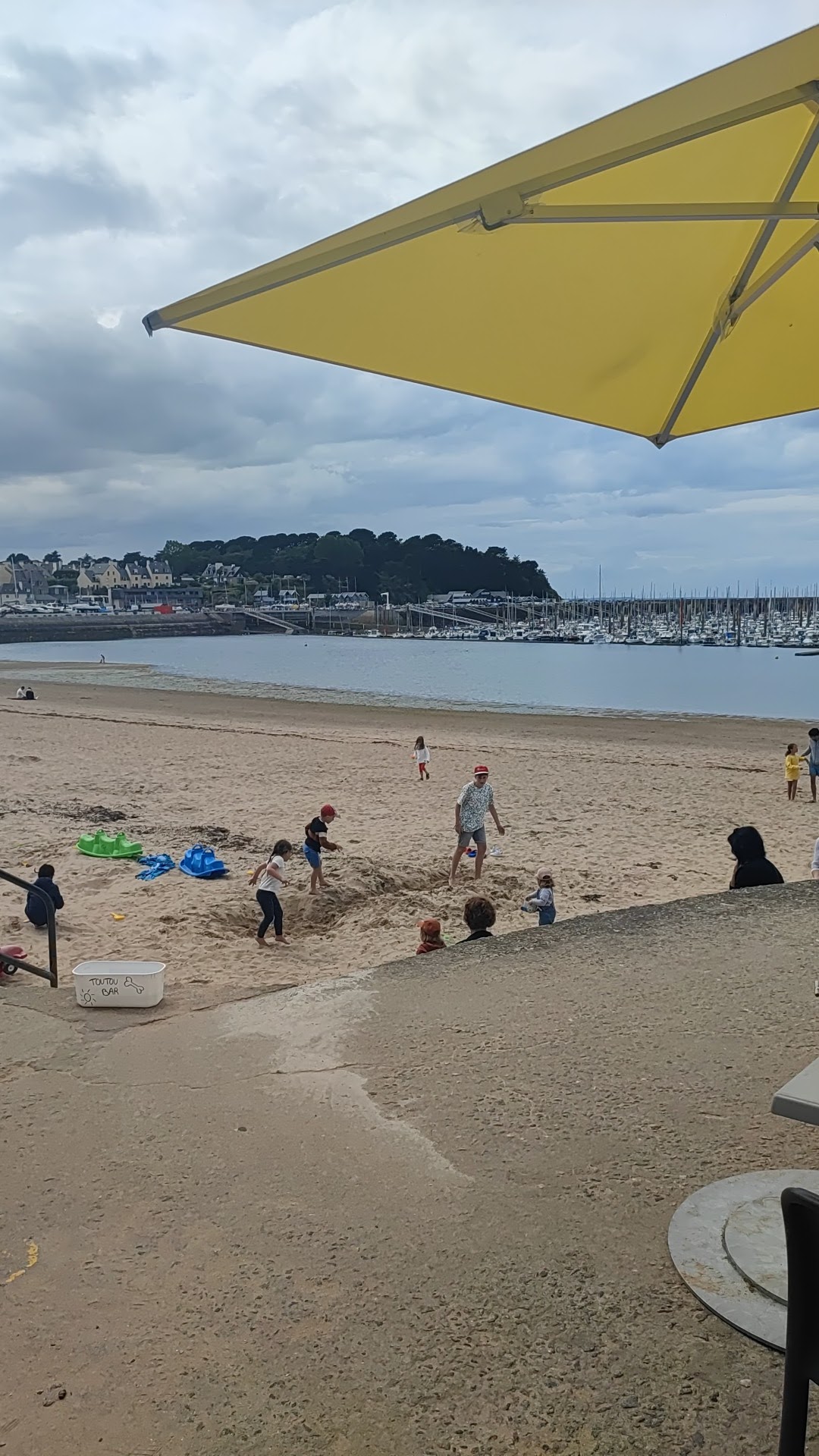 La vue sur les bateaux juste super et l endroit permet aux enfants d aller jouer sur la plage en contre bas. Cabane avec jouets de plage à dispo super pratique. Les plats à grignoter sont un peu chers pour 1 bar de plage mais on paie le cadre. Personnel jeune super dynamique, pas d attente! A faire