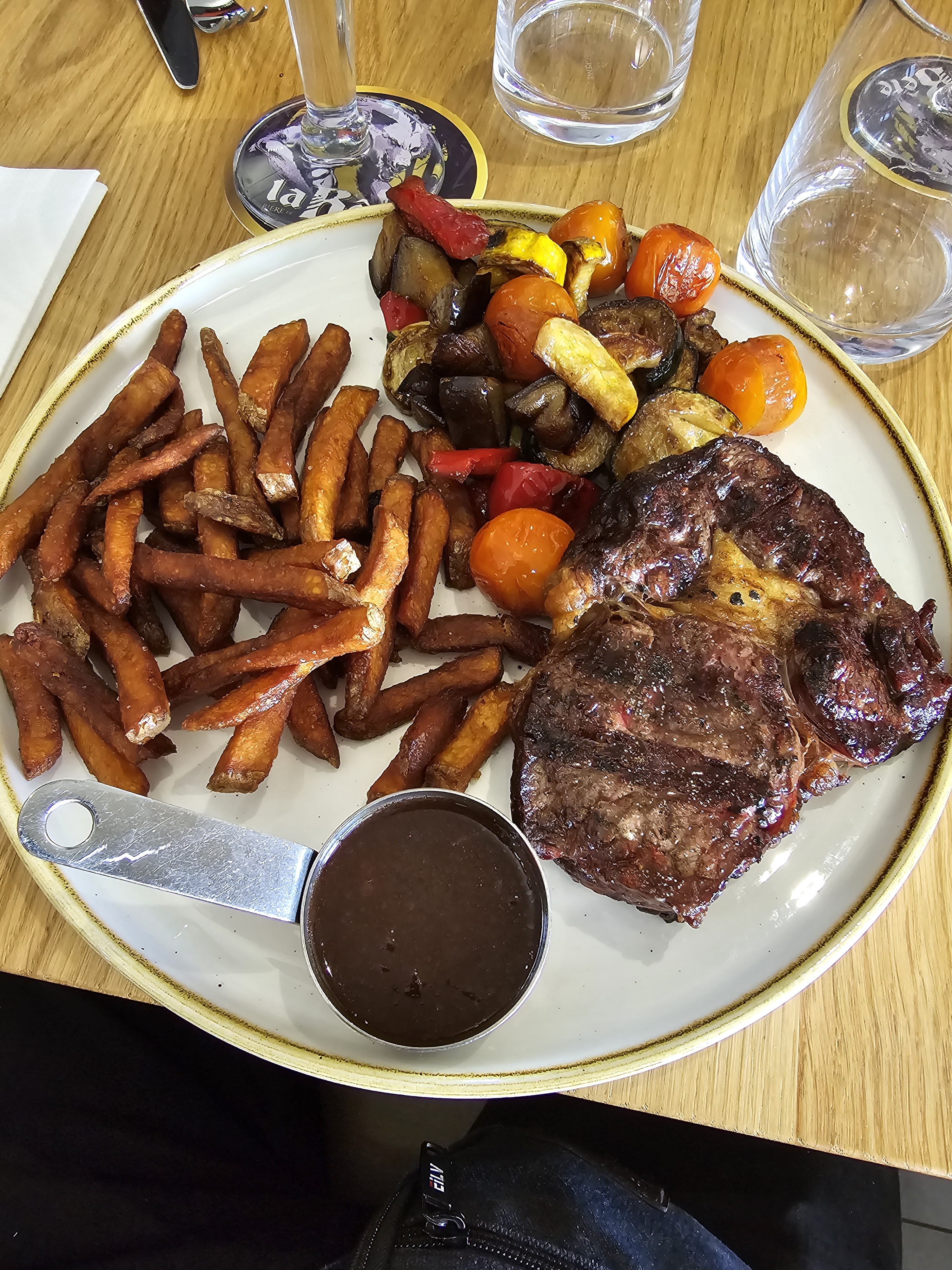 Cuisson au feu de bois c'est bien mais manque de maîtrise ribs cru à cœur.... Frites bof c'est du congelé comme partout mais menu du jour sympa. Après restaurant ou bar il faudra choisir ... Prix correct mais portion pas trop généreuse