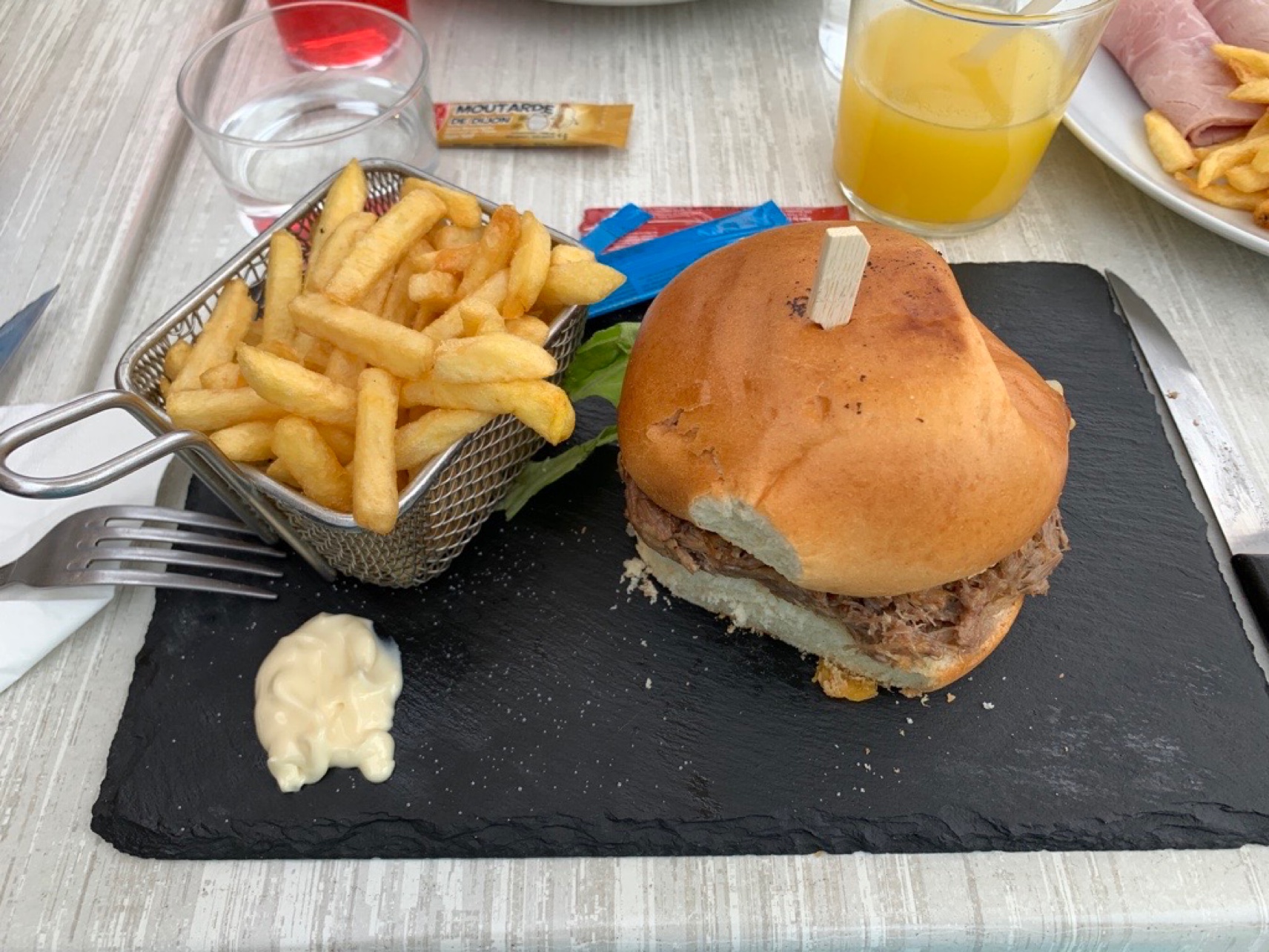 Le meilleur burger que j’ai mangé depuis longtemps ! J’ai pris un Coin-Coin, en étant peu confiante sur le résultat et redoutant qu’il soit sec. Et à la première bouchée c’est la révélation : il est DI-VIN ! Déjà le pain est délicieux, ni trop cuit ni « étouffe-chrétien », pas brioché mais pas non plus le goût de pain traditionnel (et encore moins du pain burger de supermarché), c’est une œuvre d’art à lui seul. Ensuite le fameux canard effiloché, fondant, bien cuit (un peu froid, dommage), goûteux. La sauce, impeccable, elle ne sature pas le goût mais prend sa juste place. Et enfin, la tomate et la salade ! Je crois ne pas avoir mangé de crudité aussi savoureuses depuis que ma grand-mère ne cultive plus son jardin. Un jambon frite pour les enfants, très bien. Et le service au TOP ! (J’ai fait tomber ma fourchette elle a était remplacée à la vitesse de la lumière sans aucune action de ma part 😮) Bref, le tout pour une addition sans sel, surtout il ne faut pas se priver.