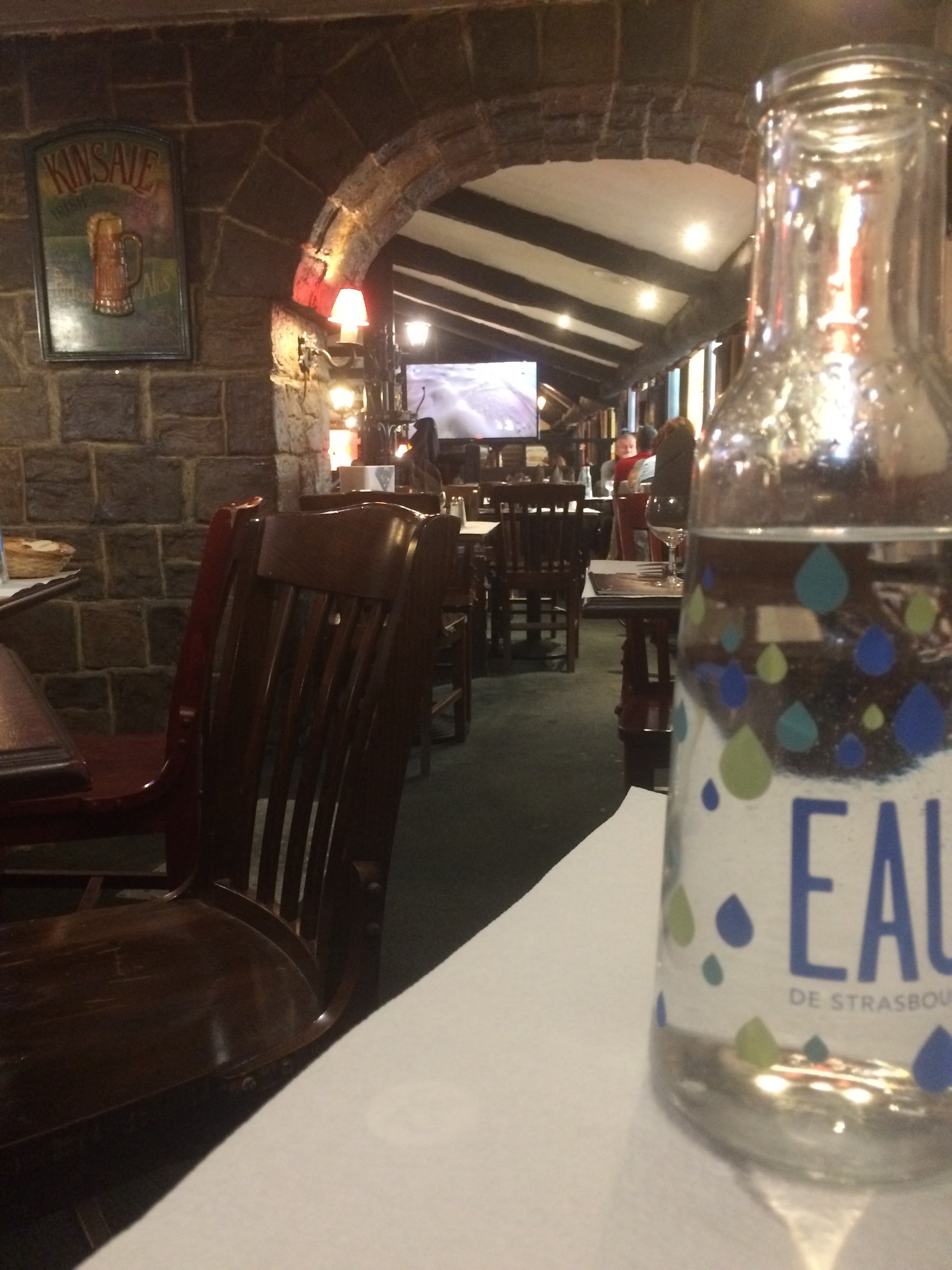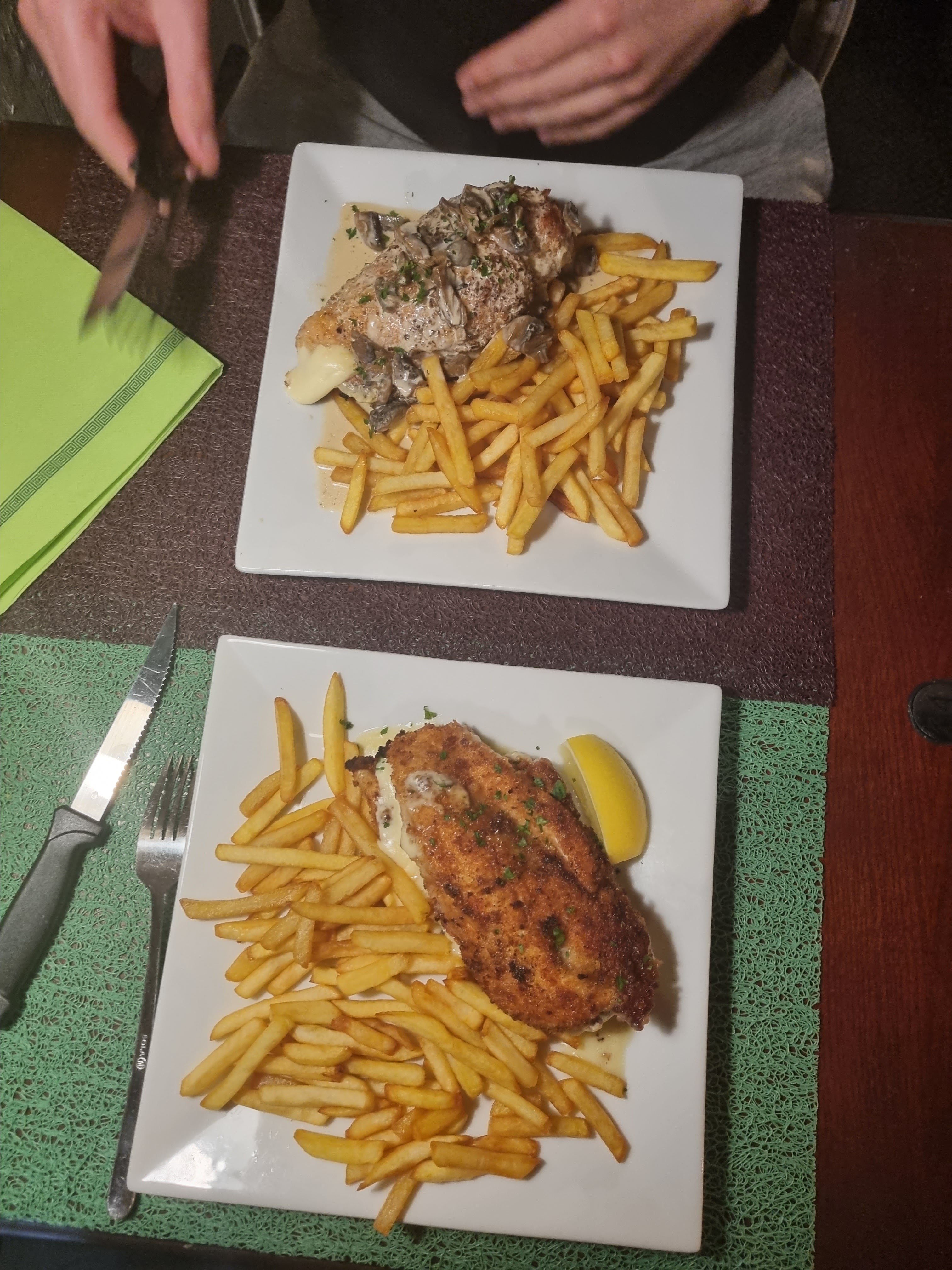 Un accueil correct quoique peu aimable, dommage qu'on soit très vite assommés par la musique assez forte. Nous n'aimons pas l'idée d'une TV géante dans le restaurant mais comprenons son intérêt. Nous étions (à notre goût) trop près des autres clients, au point de sentir leur odeur de tabac. Quant à la cuisine, nous sommes mitigés. La sauce aux champignons et à la crème est beaucoup trop salée, les champignons semblent provenir de conserves, je n'ai quasi pas senti le munster dans mon cordon bleu, les frites ne sont pas fraiches. Pour finir, les toilettes des hommes : pas de robinet car cassé, mais à la place un flexible qui sort du mur. Espérons que ce soit une solution temporaire.